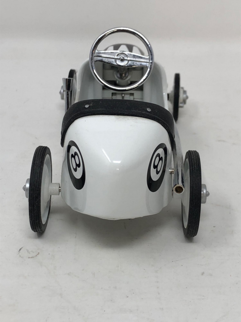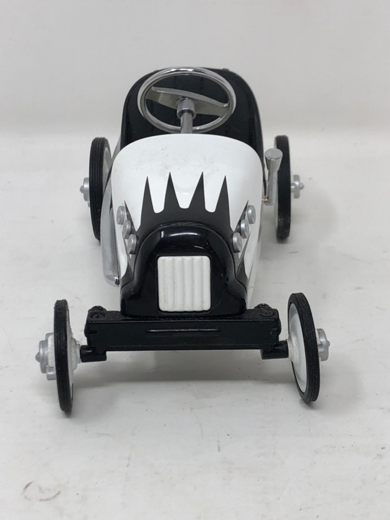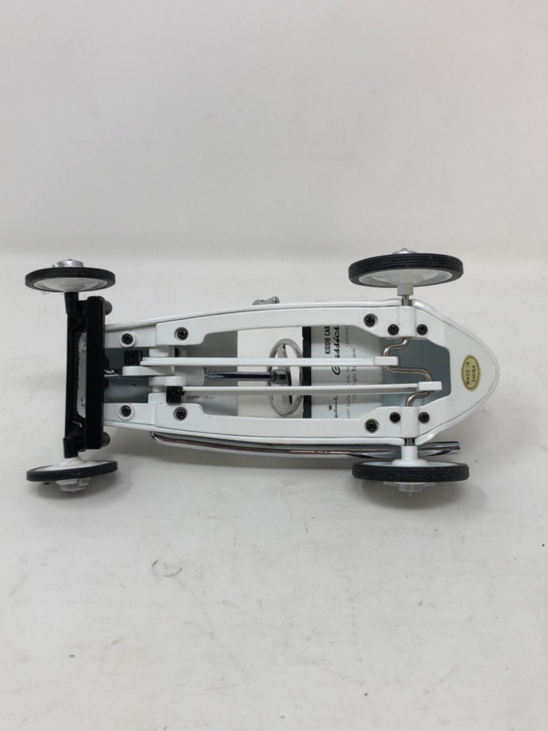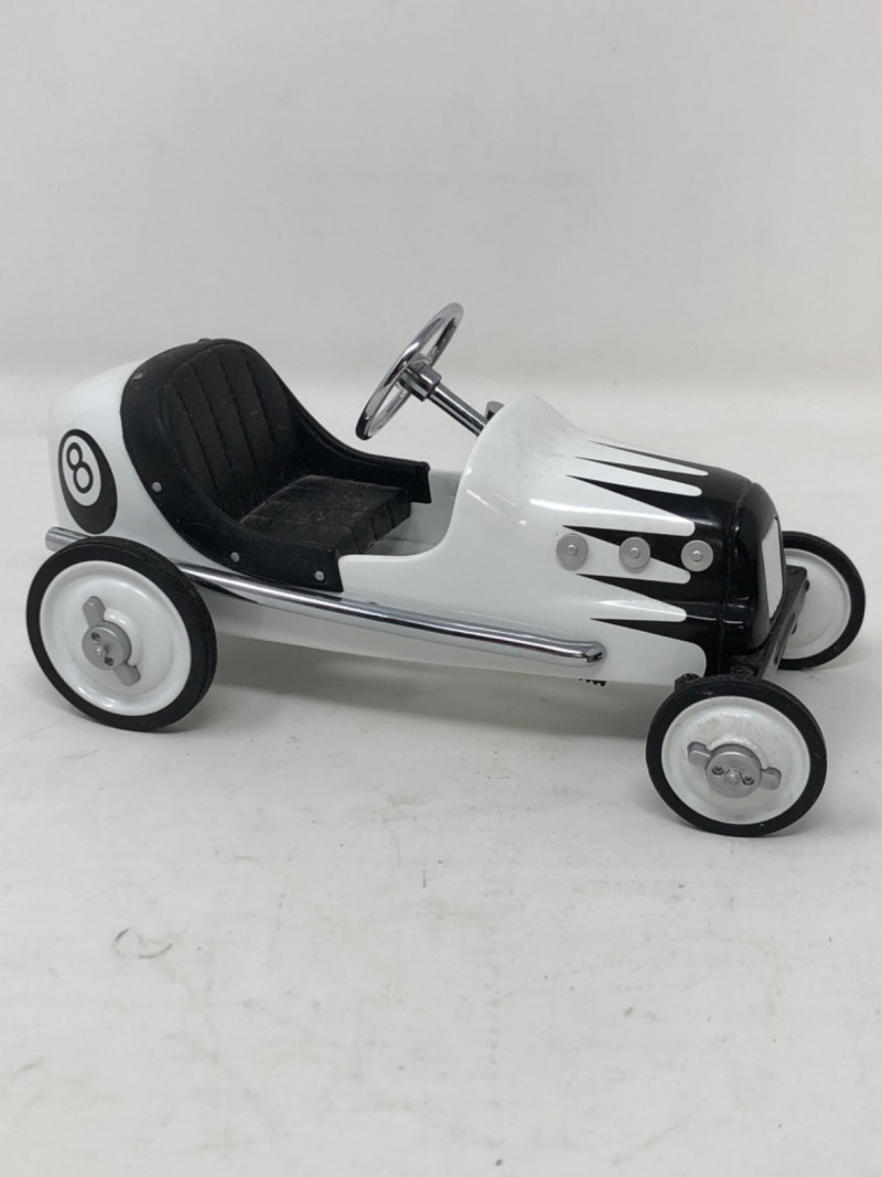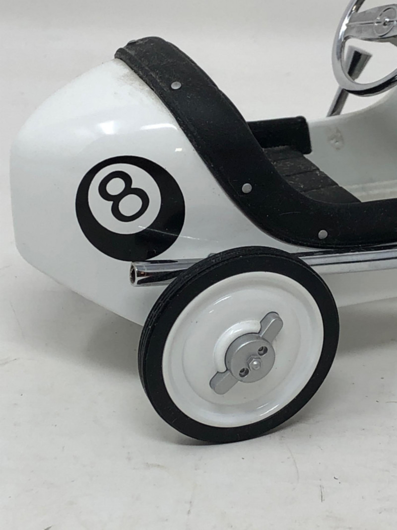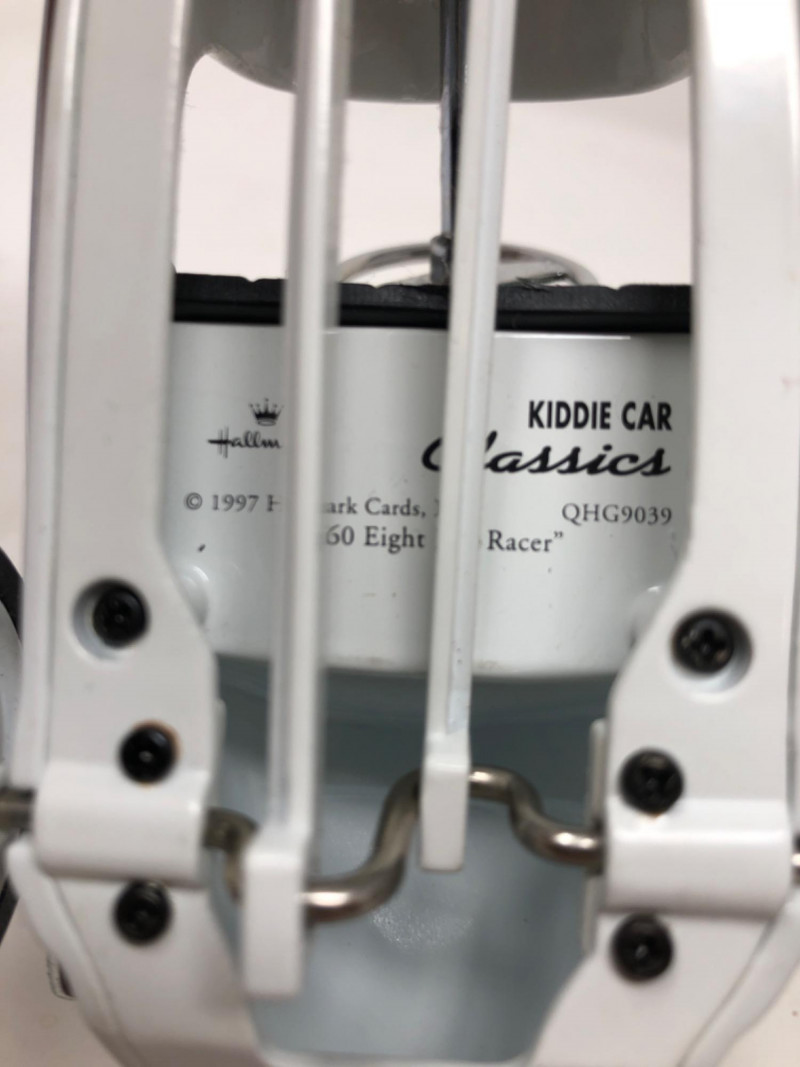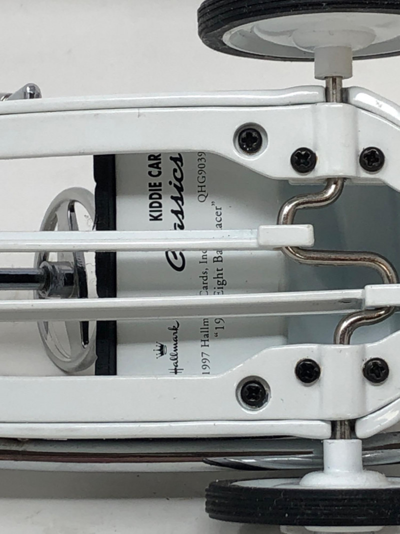 A delightful foursome of Hallmark Kiddie Car Classics, die-cast metal replicas of vintage pedal cars produced in the 1990s. These collectible miniatures were part of Hallmark’s nostalgic tribute to mid-century childhood, crafted with precision and charm. White Race Car – 7" L × 3.5" H × 3" W Each piece reflects the design language of classic pedal vehicles from the 1930s–1950s, with rolling wheels, painted details, and sturdy die-cast construction. These were not ornaments, but tabletop collectibles meant to evoke the joy of play and the artistry of industrial design.