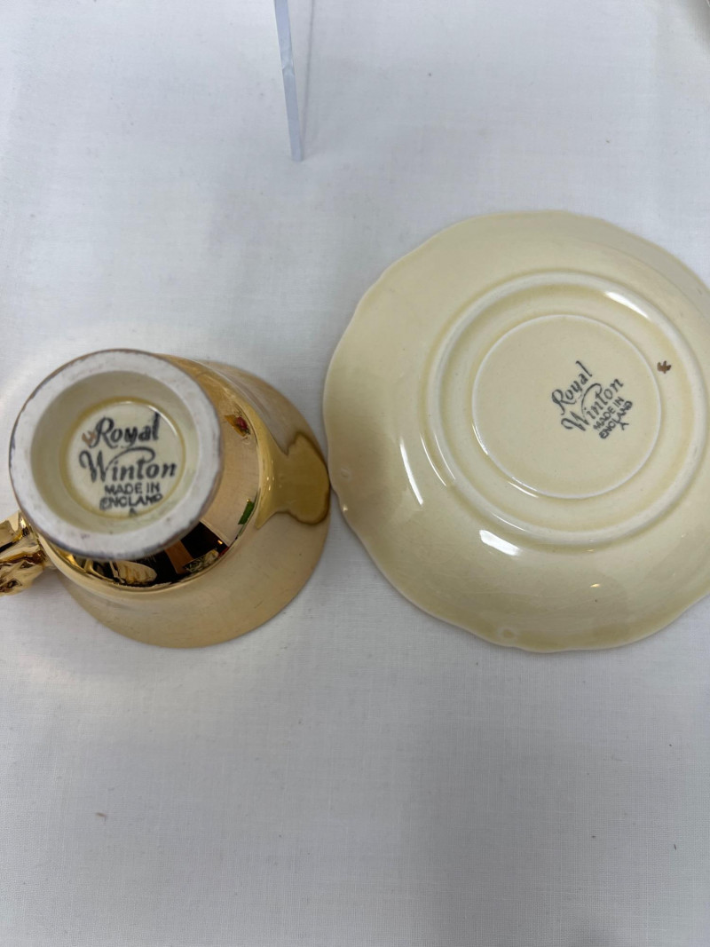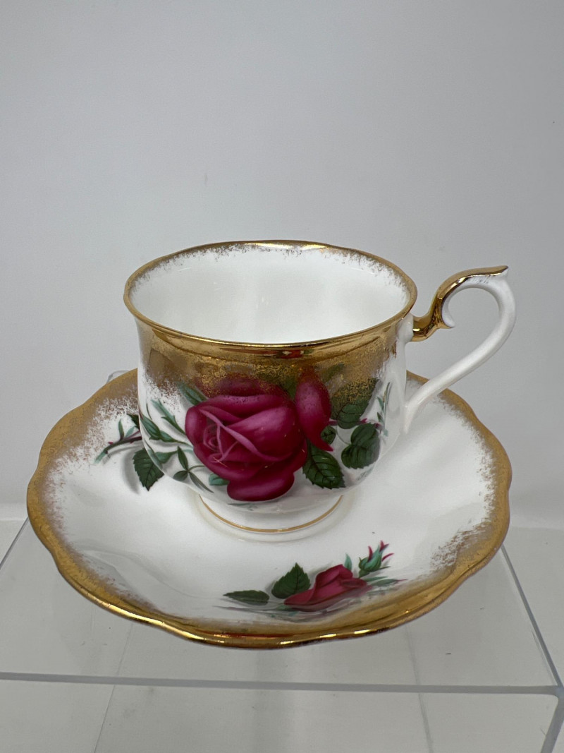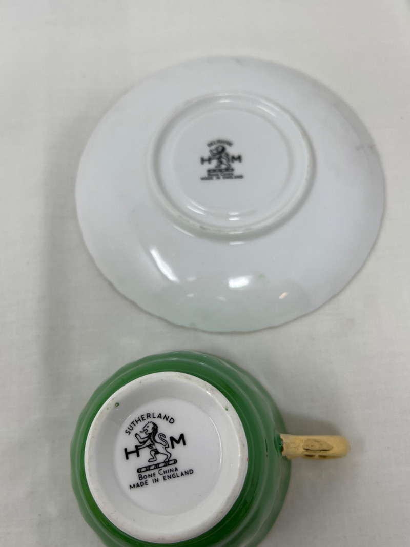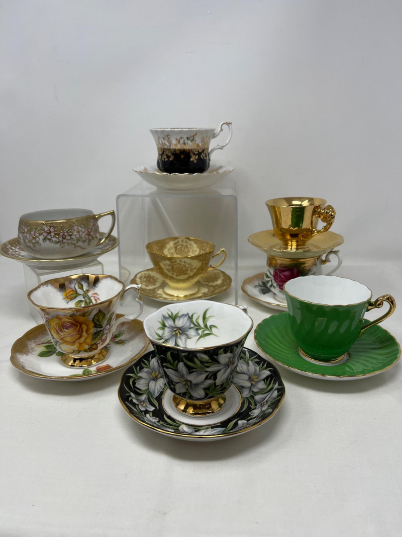 A charming collection of eight porcelain tea cups and saucers, featuring a blend of English bone china and Japanese export ware, each with its own distinctive floral motif and gilded detail. Makers include: Royal Albert – Known for its romantic patterns and fine bone china, often featuring roses and scalloped edges. Sutherland – Classic English florals with brushed gold accents and ribbed swirl bodies. Royal Winton – Bold, colorful chintz patterns with vintage flair. Nippon – Early 20th-century Japanese porcelain with hand-painted designs and rising sun marks. Hammersley – Elegant English bone china with refined floral sprays and gold trim. This set offers a curated mix of styles, perfect for collectors, decorators, or anyone seeking to elevate their afternoon tea ritual.