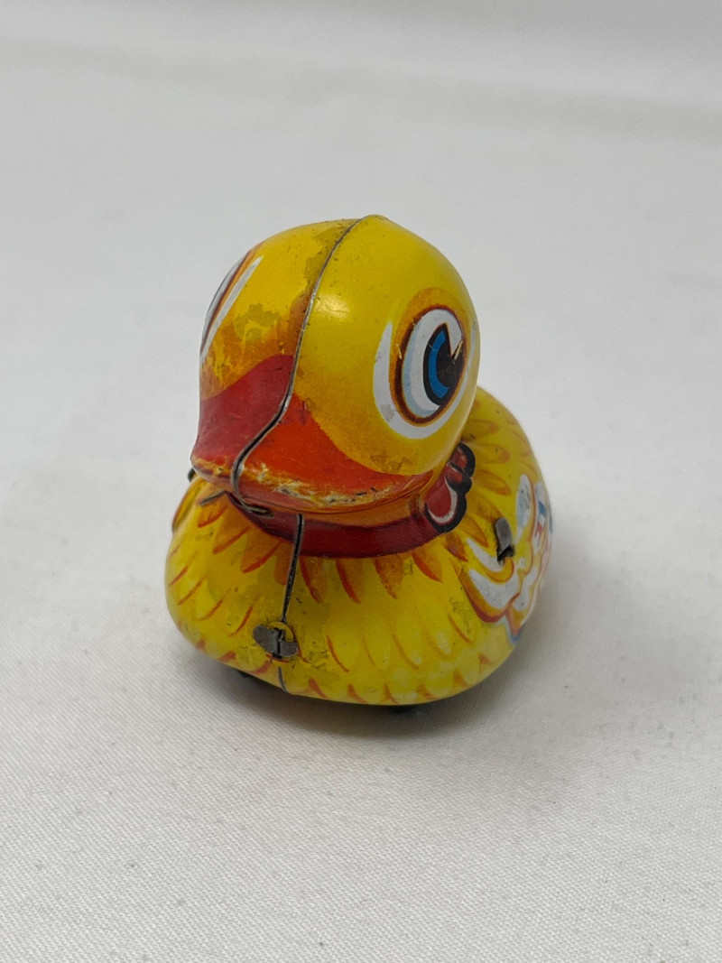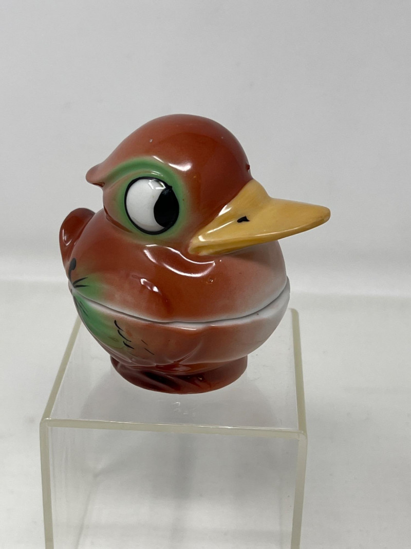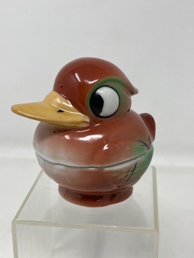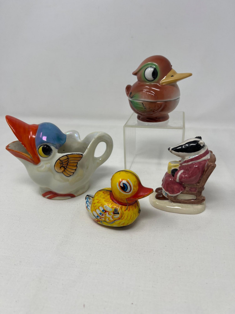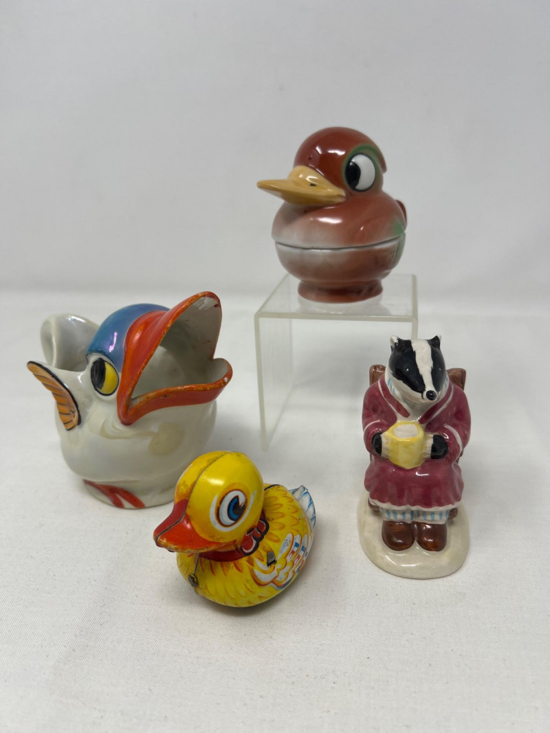 A playful parade of vintage and antique animal companions, this lot features an unexpected mix of ducks and one very dignified badger. Made in Japan Duck Sugar Bowl (no spoon). A ceramic duck with a removable lid, style in soft vintage colors and classic mid-century whimsy. Japan Duck Creamer - not a match to the sugar bowl, but equally charming. This duck's open beak serves as the spout, and its expression suggest it's ready for gossip over tea. Ehmann "Paak-Paak" Tin Duck Toy - A cheerful yellow mechanical duck with moveable wheeled feet that propels toy forward after running the toy on a surface in reverse. Made in Germany. Royal Albert Porcelain Badger figure - a finely detailed figurine from the Woodland Series, this badger adds a touch of British refinement to the otherwise feathered affair. A storybook vignette - perfect for collectors who want to add whimsy to their collector cabinet. Figures are 1.75” height to 4” height