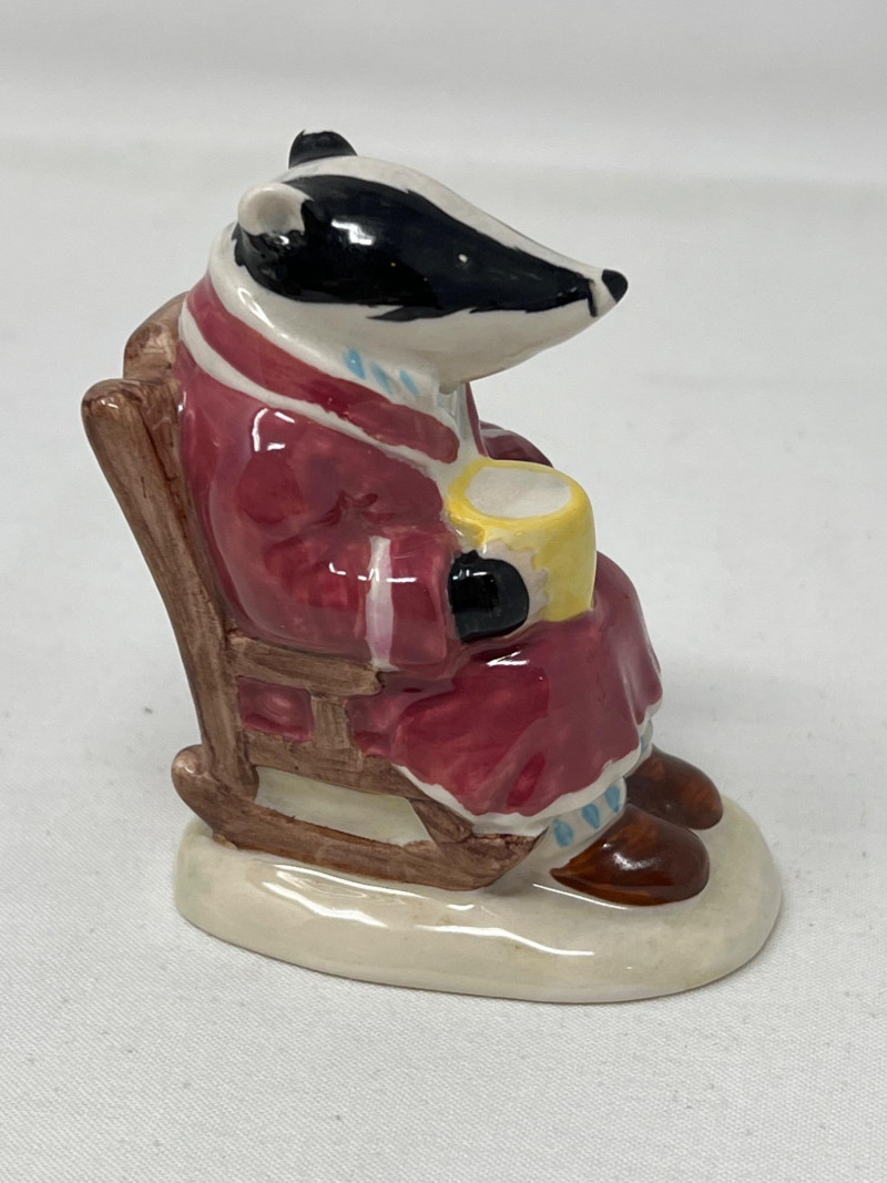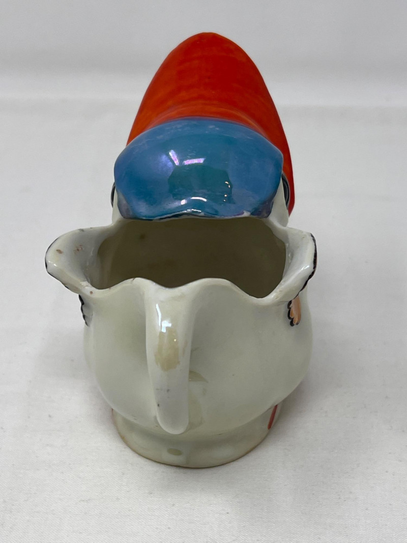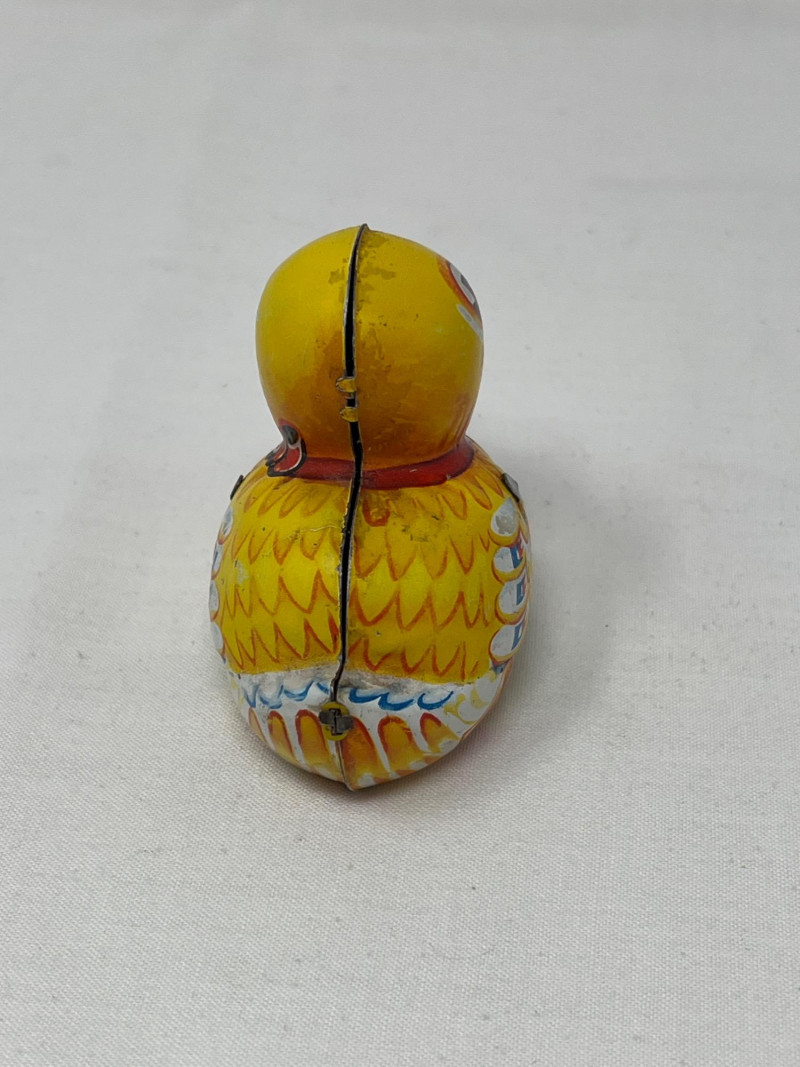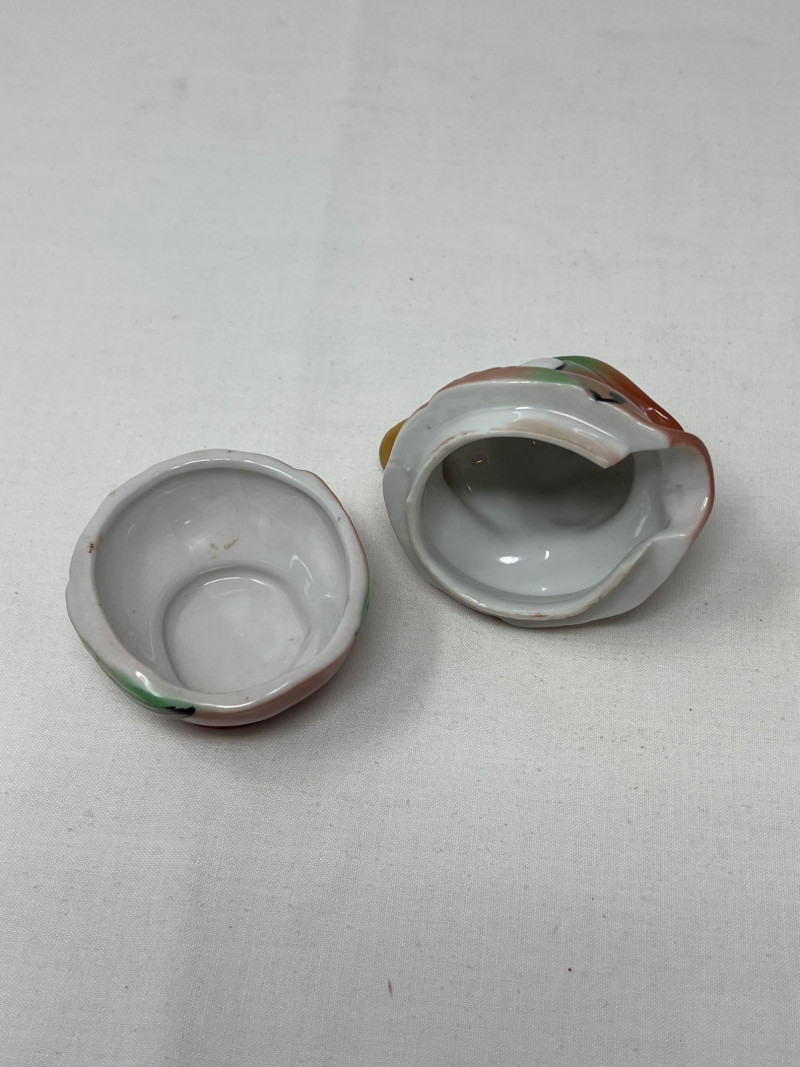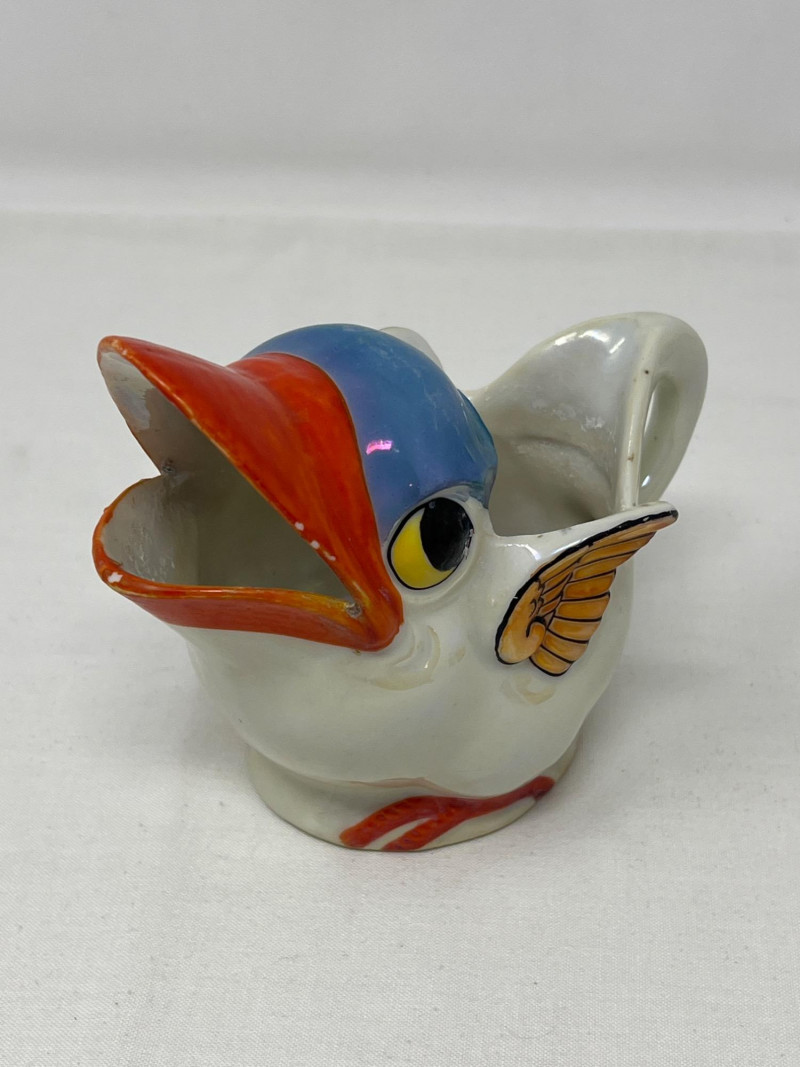 A playful parade of vintage and antique animal companions, this lot features an unexpected mix of ducks and one very dignified badger. Made in Japan Duck Sugar Bowl (no spoon). A ceramic duck with a removable lid, style in soft vintage colors and classic mid-century whimsy. Japan Duck Creamer - not a match to the sugar bowl, but equally charming. This duck's open beak serves as the spout, and its expression suggest it's ready for gossip over tea. Ehmann "Paak-Paak" Tin Duck Toy - A cheerful yellow mechanical duck with moveable wheeled feet that propels toy forward after running the toy on a surface in reverse. Made in Germany. Royal Albert Porcelain Badger figure - a finely detailed figurine from the Woodland Series, this badger adds a touch of British refinement to the otherwise feathered affair. A storybook vignette - perfect for collectors who want to add whimsy to their collector cabinet. Figures are 1.75” height to 4” height