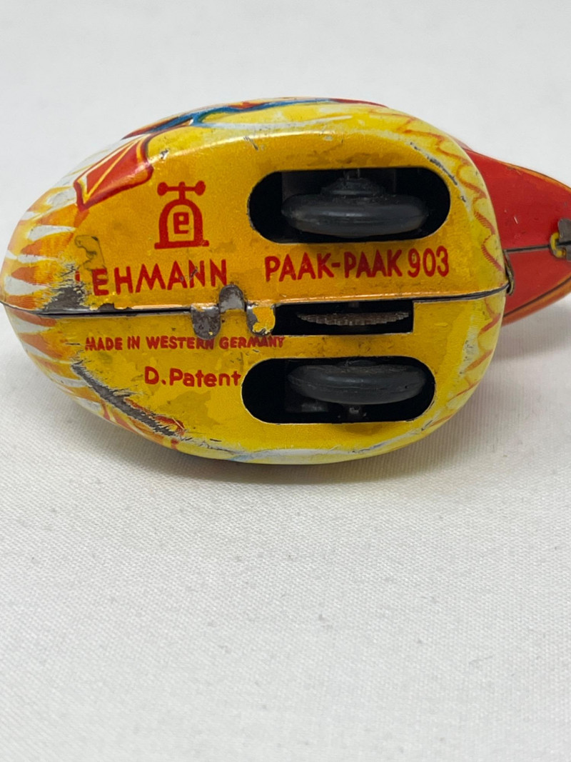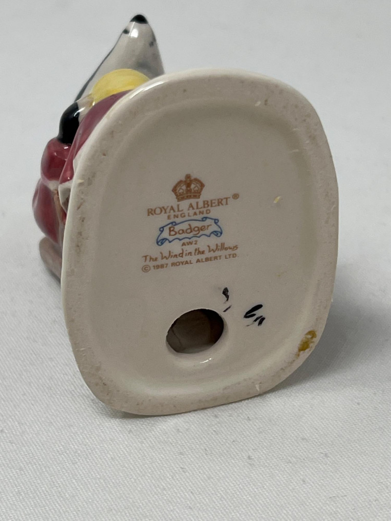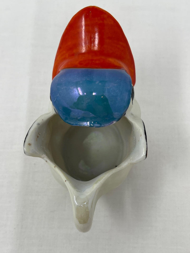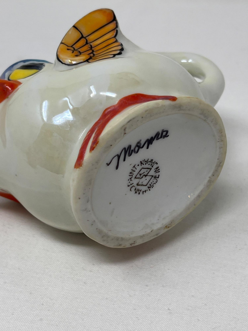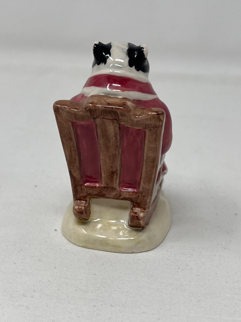 A playful parade of vintage and antique animal companions, this lot features an unexpected mix of ducks and one very dignified badger. Made in Japan Duck Sugar Bowl (no spoon). A ceramic duck with a removable lid, style in soft vintage colors and classic mid-century whimsy. Japan Duck Creamer - not a match to the sugar bowl, but equally charming. This duck's open beak serves as the spout, and its expression suggest it's ready for gossip over tea. Ehmann "Paak-Paak" Tin Duck Toy - A cheerful yellow mechanical duck with moveable wheeled feet that propels toy forward after running the toy on a surface in reverse. Made in Germany. Royal Albert Porcelain Badger figure - a finely detailed figurine from the Woodland Series, this badger adds a touch of British refinement to the otherwise feathered affair. A storybook vignette - perfect for collectors who want to add whimsy to their collector cabinet. Figures are 1.75” height to 4” height