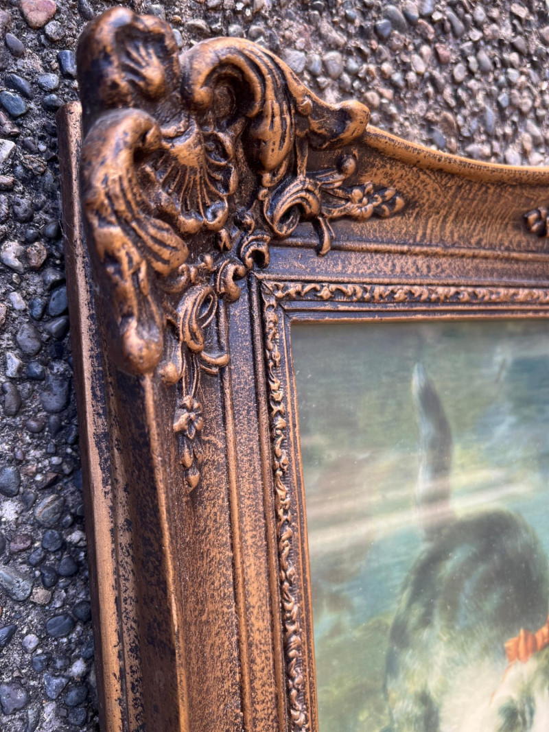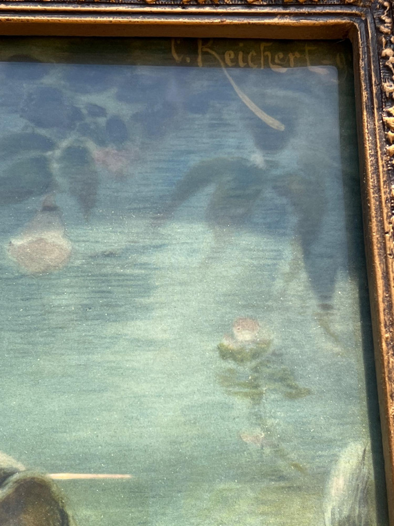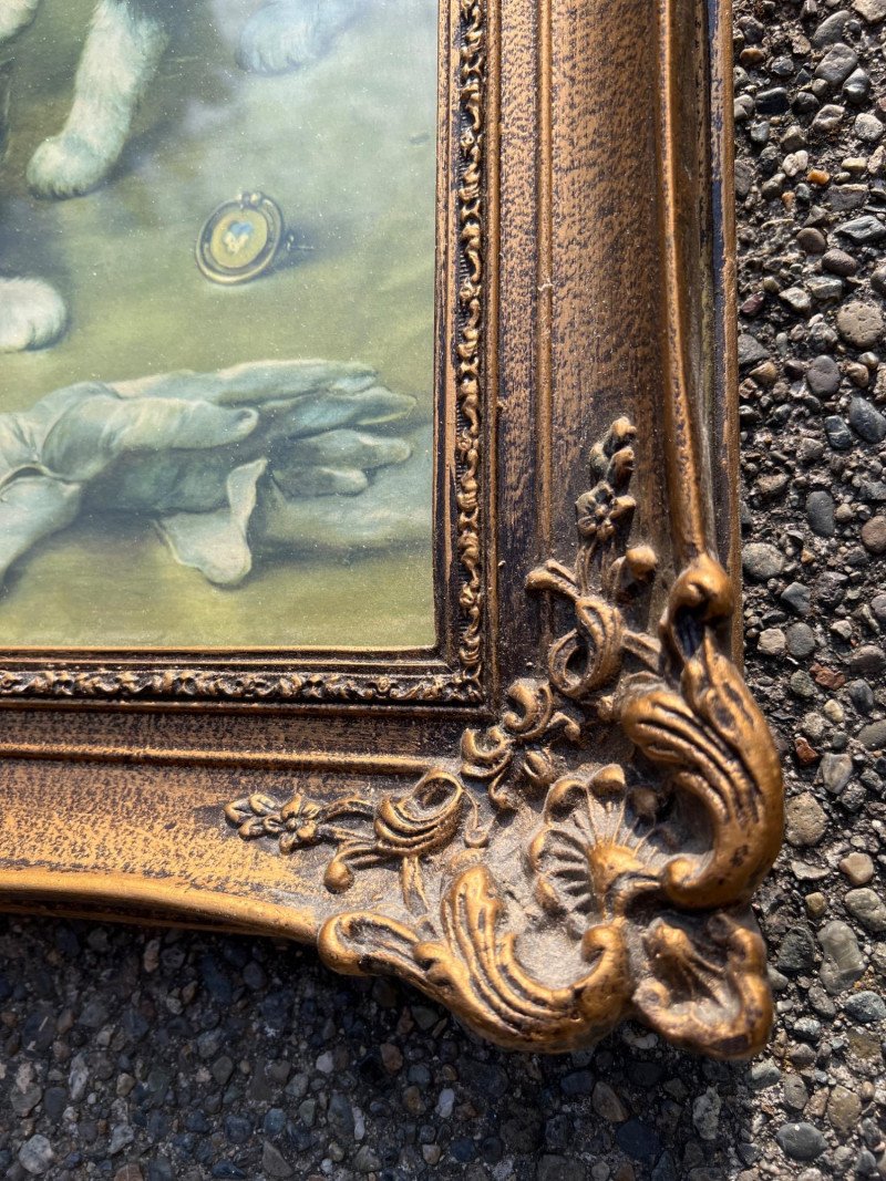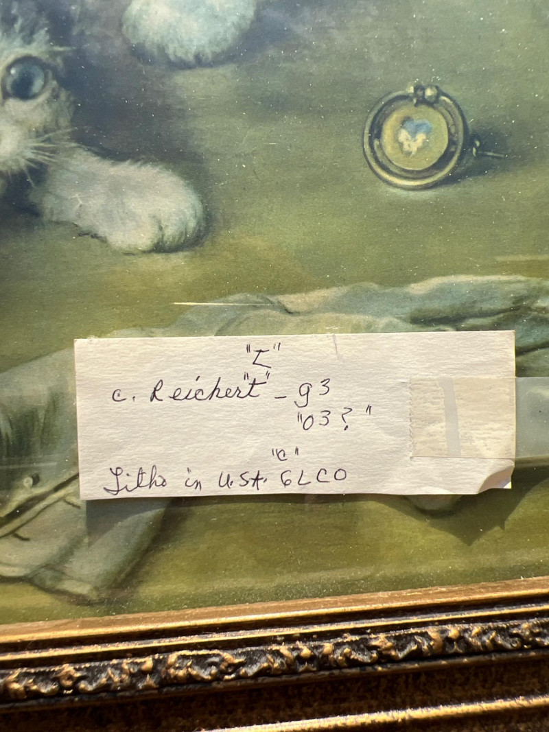 An iconic and endearing vintage lithograph titled “Mischievous Kittens” by Carl Reichert (German, 1836–1918), renowned for his lifelike portrayals of domestic animals. This 1893 print captures three playful kittens in a moment of curiosity and delight, rendered with exquisite detail and warmth. The artwork is housed in an ornately carved antique frame, richly patinated and likely custom-made to elevate the piece’s visual impact. The frame’s craftsmanship suggests a high-end provenance, with deep relief carving and a timeworn finish that complements the Victorian charm of the lithograph. Marked “Litho in U.S.A.” with edition number GP 874B, this piece is a treasured example of turn-of-the-century animal portraiture. Loosely mounted, please inspect photos. Offered as-is.
