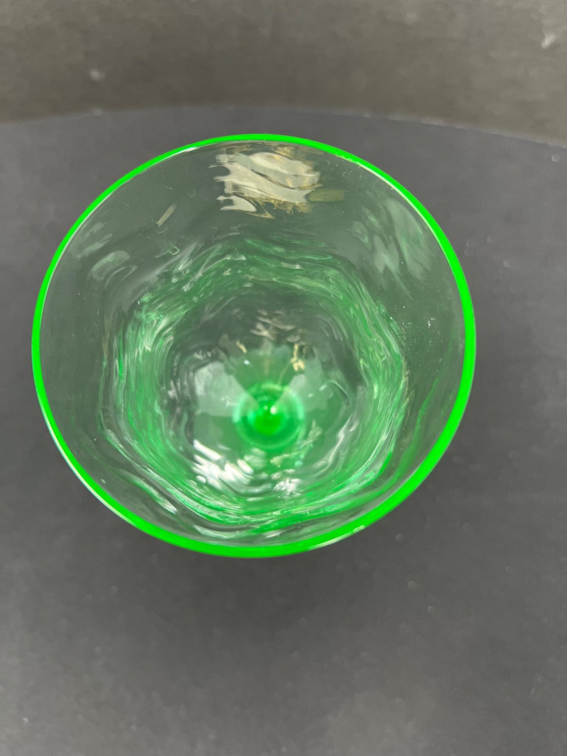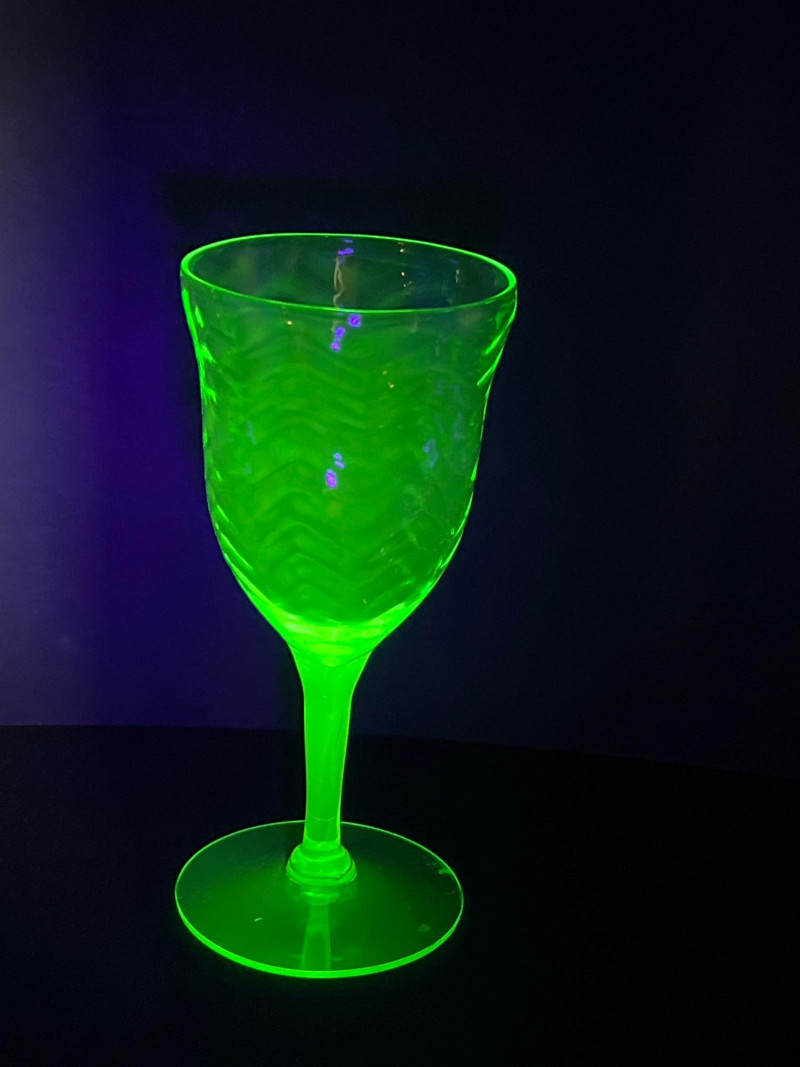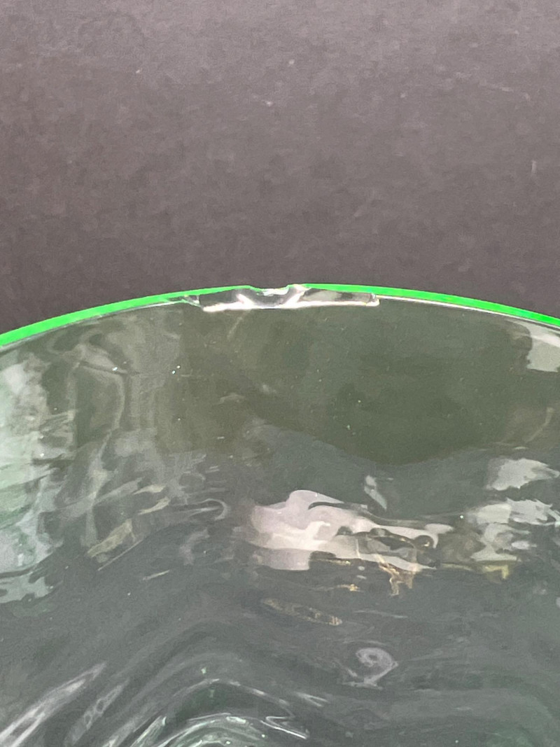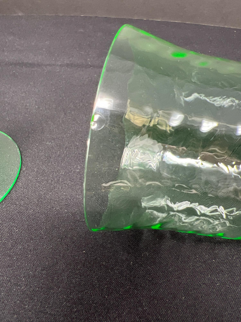 A striking set of four vintage water goblets in rich pine green glass, featuring the rare herringbone optic pattern. Each goblet stands 6.75" tall and showcases vertical ribbing that catches the light with subtle elegance. The deep green hue and textured design evoke mid-century charm and collector intrigue. Perfect for display or use, these goblets offer a blend of rarity, beauty, and timeless craftsmanship. Note that two goblets have one slight chip each (refer to photos).