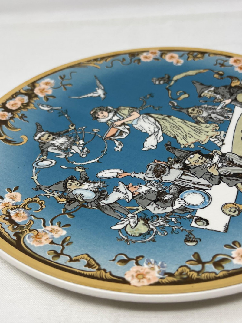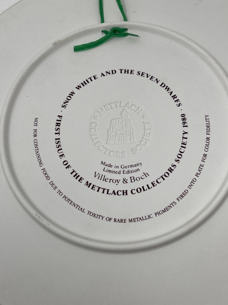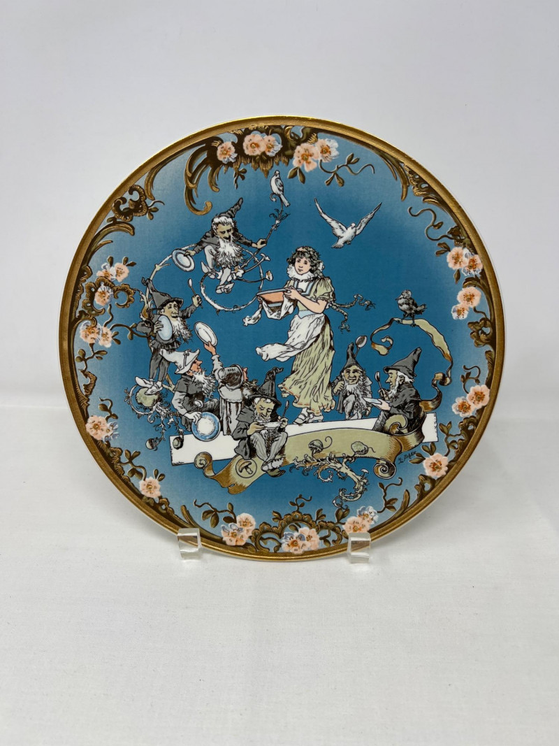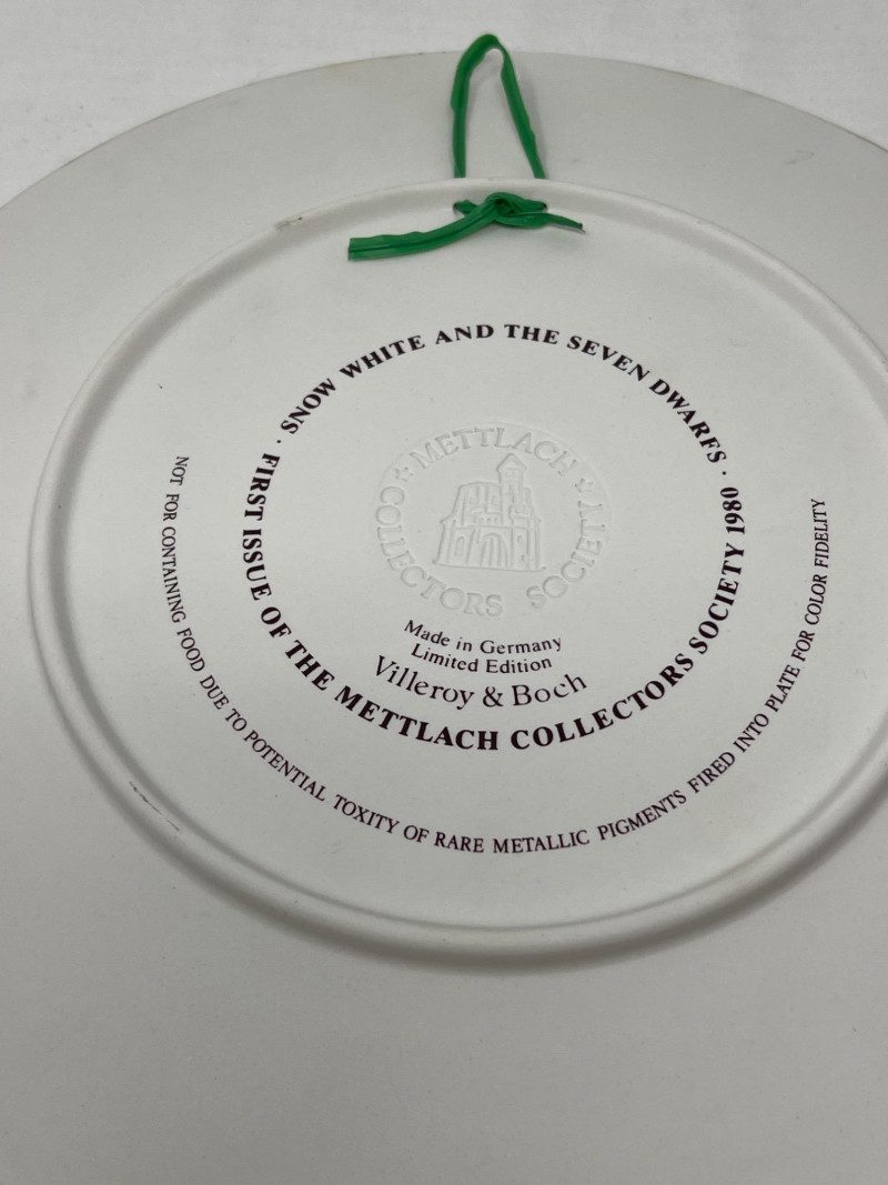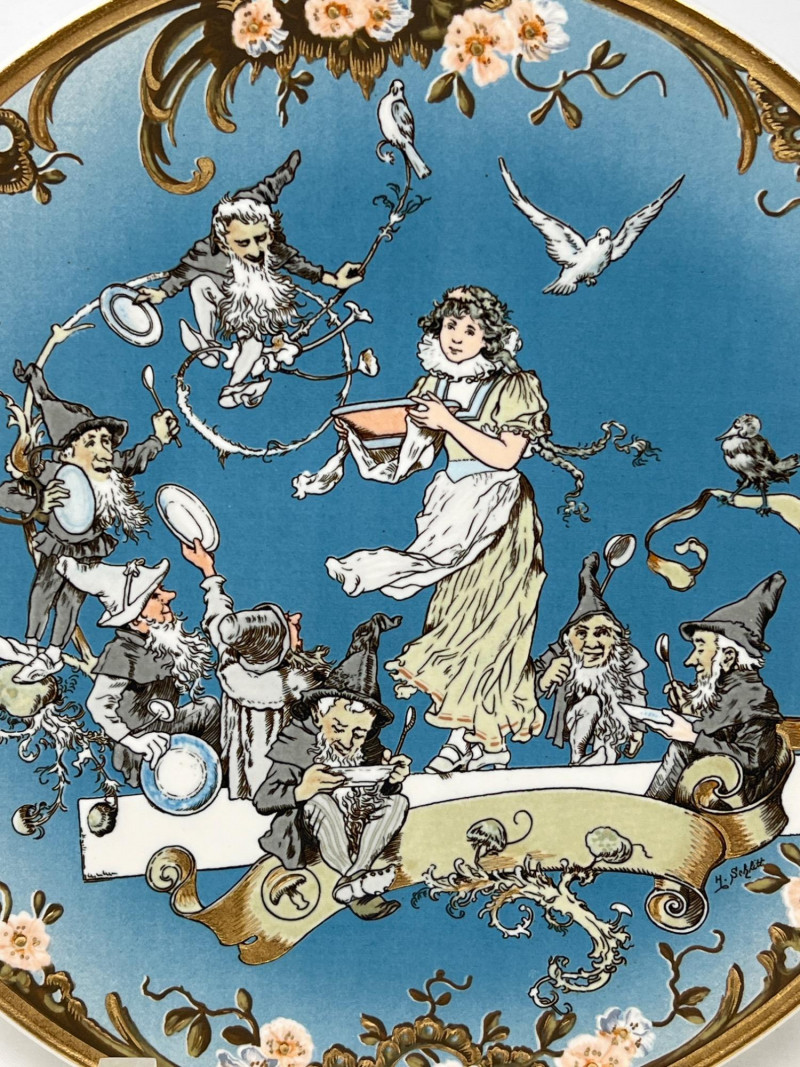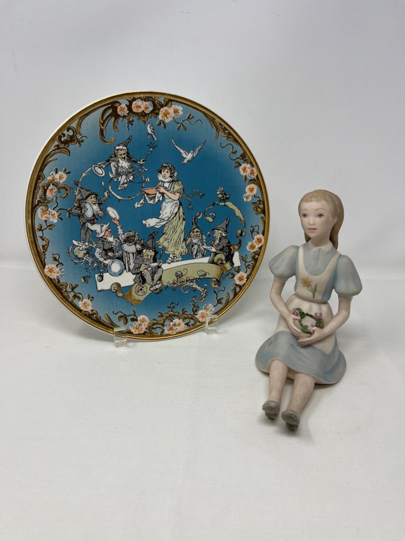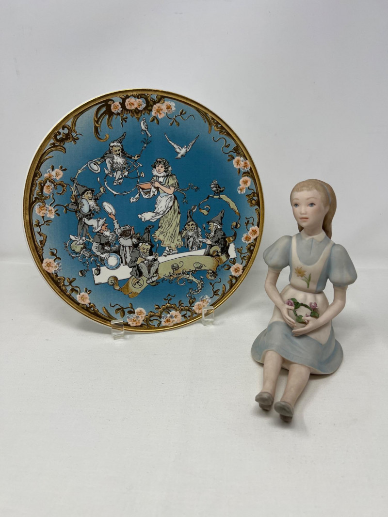 A graceful pairing of storybook whimsy and sculptural artistry, this lot includes: Villeroy & Boch “Snow White and the Seven Dwarfs” Collector Plate – A limited edition porcelain plate from 1980, produced in Germany for the Mettlach Collectors Society. Based on the original 1890 artwork by Heinrich Schlitt, the plate features Snow White surrounded by the seven dwarfs in a richly detailed dinner scene. Rendered in vibrant cornflower blue, gold, and peach tones, with embossed maker’s mark on the reverse.
