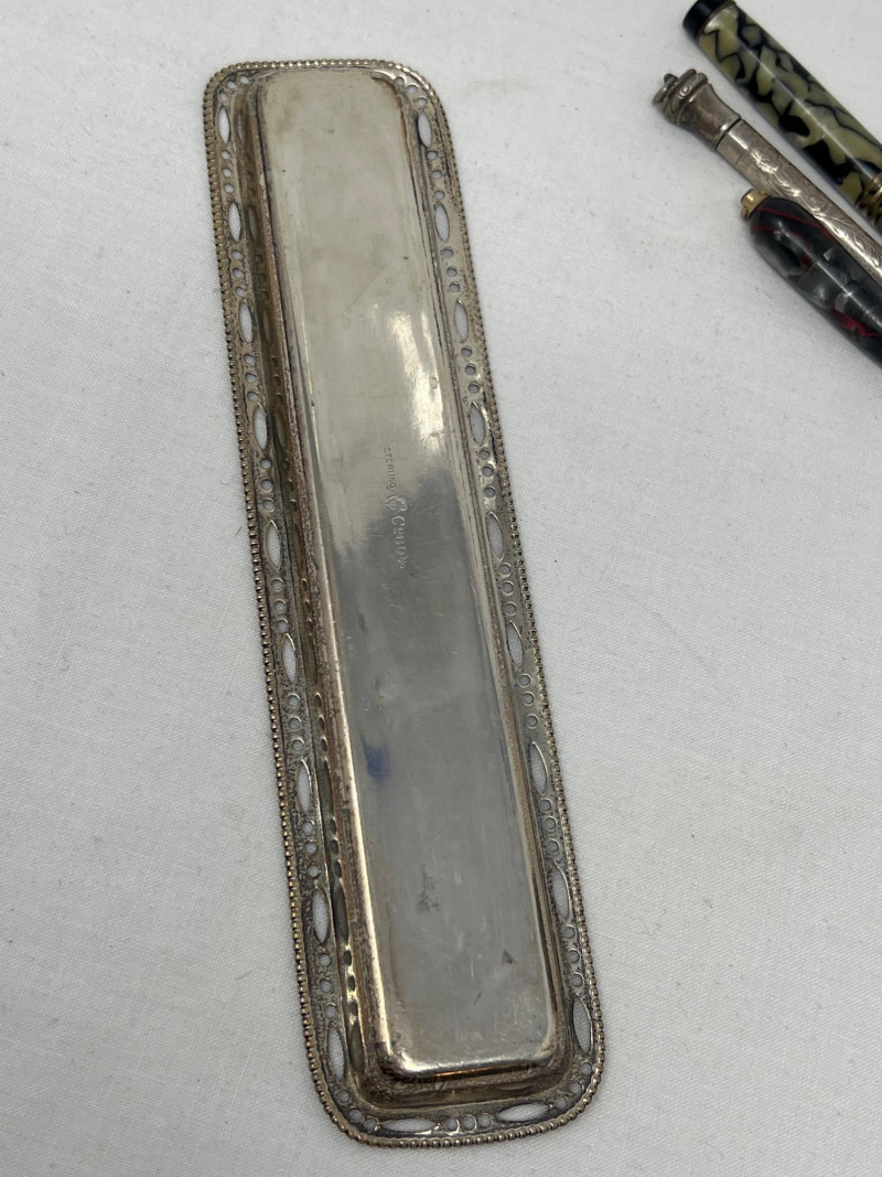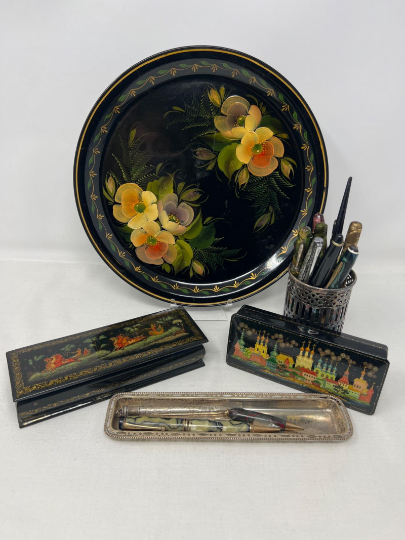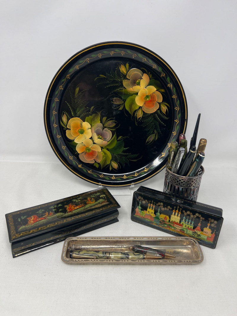Lot # 108 - Lacquer Plate, Sterling Silver Tray & Vintage Ink & Lead Pens