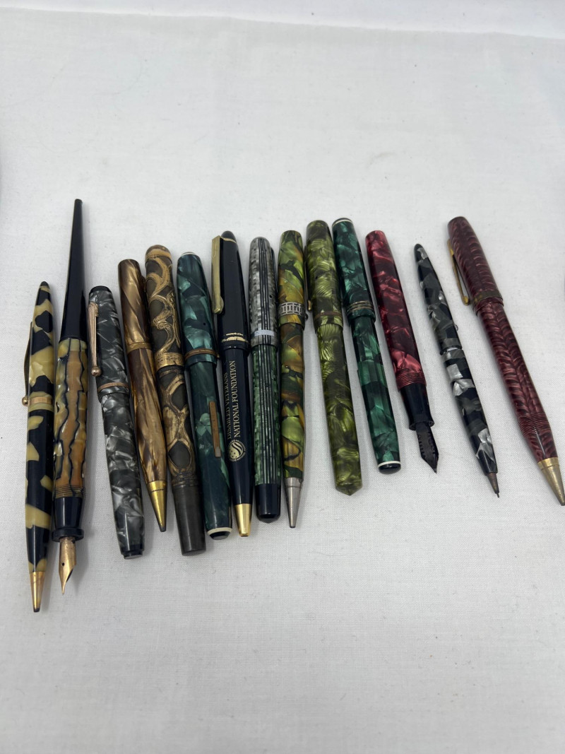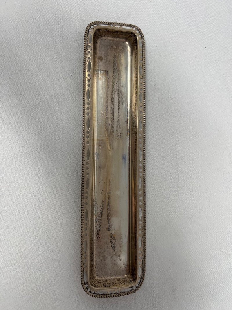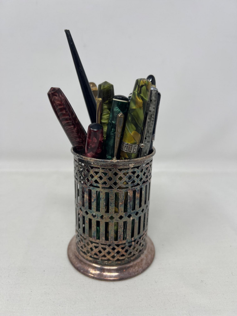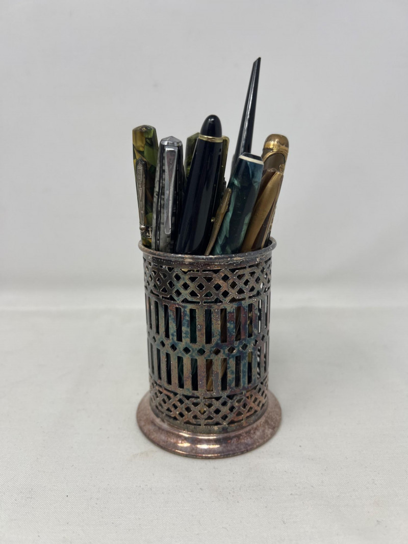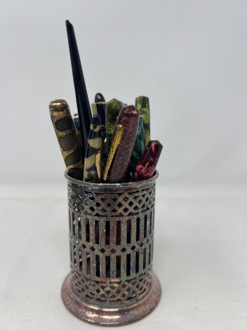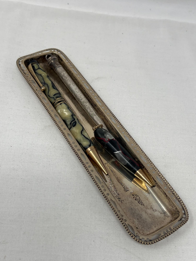 A curated ensemble of writing and desk accessories, blending elegance, craftsmanship, and mid-century charm: Vintage Ink & Lead Pens – A selection of writing instruments ranging from 4" to 8" in length, including fountain and mechanical styles. Each pen reflects the tactile beauty of analog writing, with varied finishes and nib designs. Sterling Silver Tray – Measuring 8" × 2", this slender tray offers a gleaming surface for pens, paperweights, or small desk items. Likely hallmarked, it adds a touch of refinement to any workspace. (just needs a polish) Decorative Lacquer Plate – A bold 11" diameter plate with rich surface detailing, ideal for display or use as a catchall. The lacquer finish suggests East Asian influence, pairing well with minimalist or curated interiors. Two Vintage Boxes – Measuring 2.5" wide × 5" and 7" long × 1.25" high, these compact containers offer storage for pens, clips, or keepsakes. Their understated design complements the set’s aesthetic.