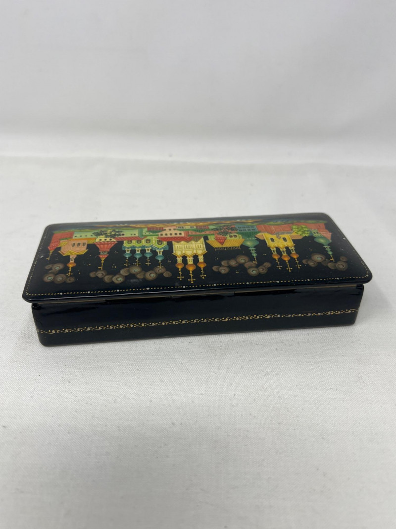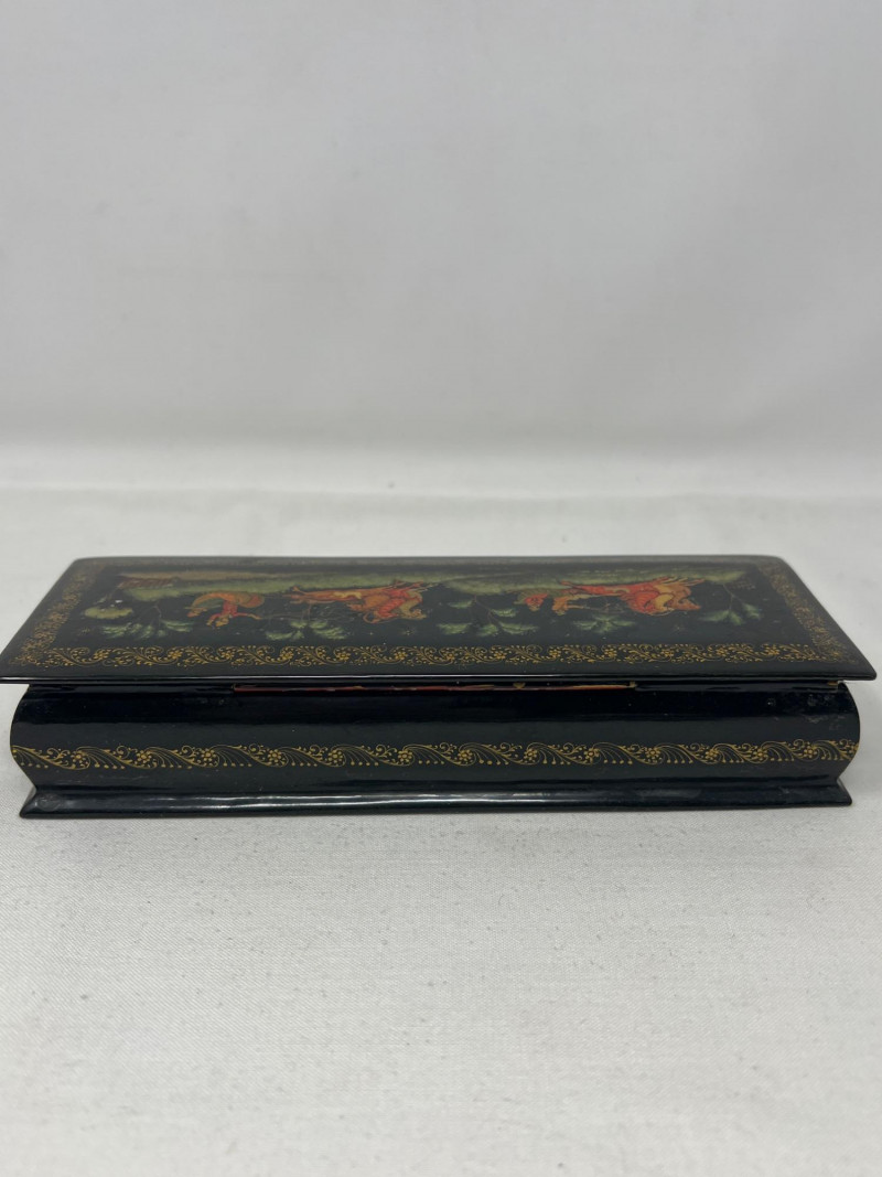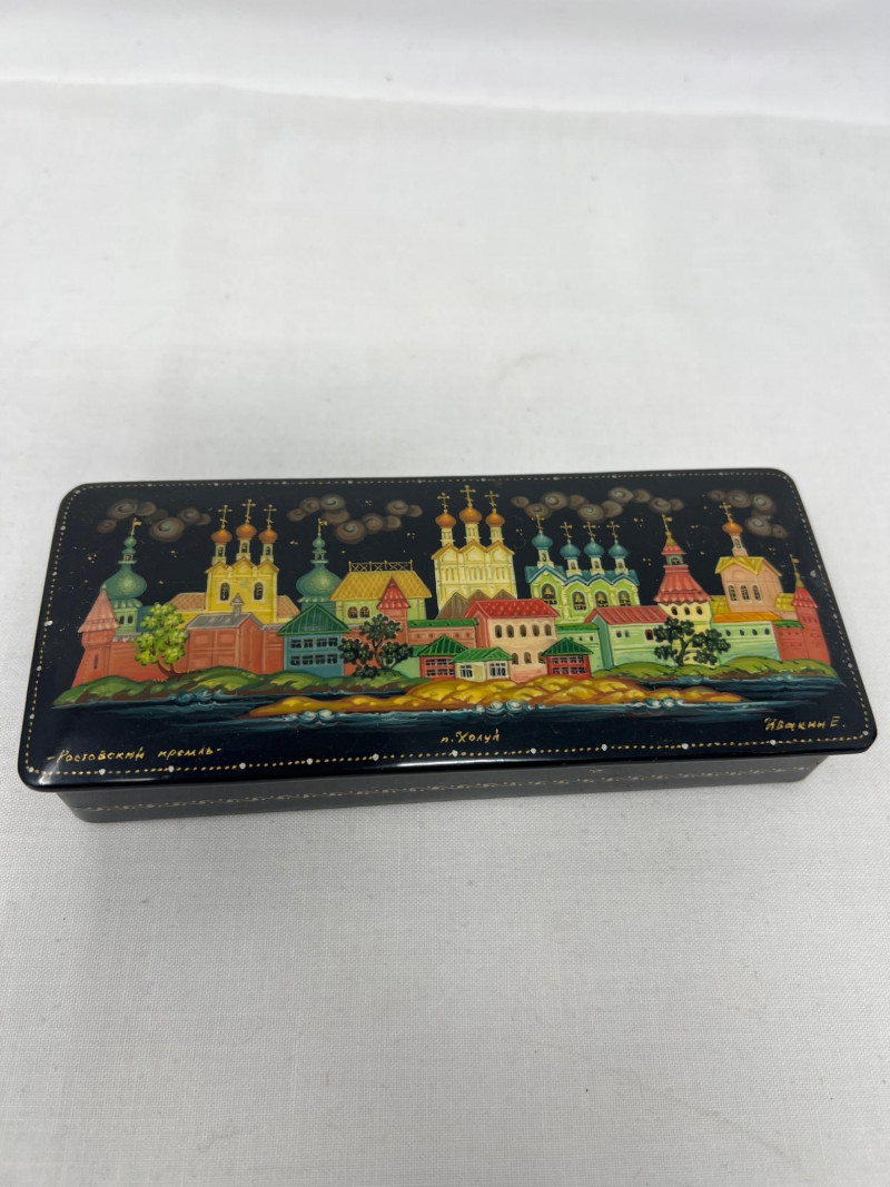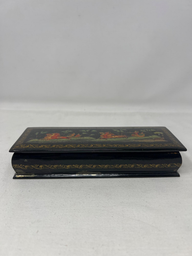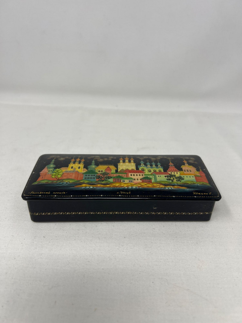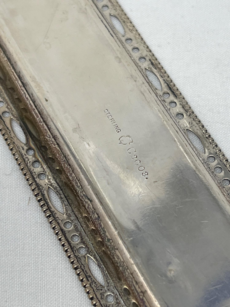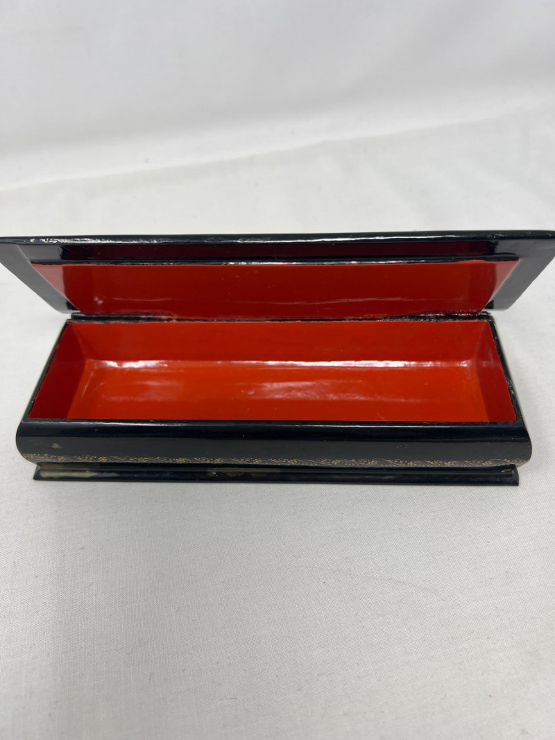 A curated ensemble of writing and desk accessories, blending elegance, craftsmanship, and mid-century charm: Vintage Ink & Lead Pens – A selection of writing instruments ranging from 4" to 8" in length, including fountain and mechanical styles. Each pen reflects the tactile beauty of analog writing, with varied finishes and nib designs. Sterling Silver Tray – Measuring 8" × 2", this slender tray offers a gleaming surface for pens, paperweights, or small desk items. Likely hallmarked, it adds a touch of refinement to any workspace. (just needs a polish) Decorative Lacquer Plate – A bold 11" diameter plate with rich surface detailing, ideal for display or use as a catchall. The lacquer finish suggests East Asian influence, pairing well with minimalist or curated interiors. Two Vintage Boxes – Measuring 2.5" wide × 5" and 7" long × 1.25" high, these compact containers offer storage for pens, clips, or keepsakes. Their understated design complements the set’s aesthetic.