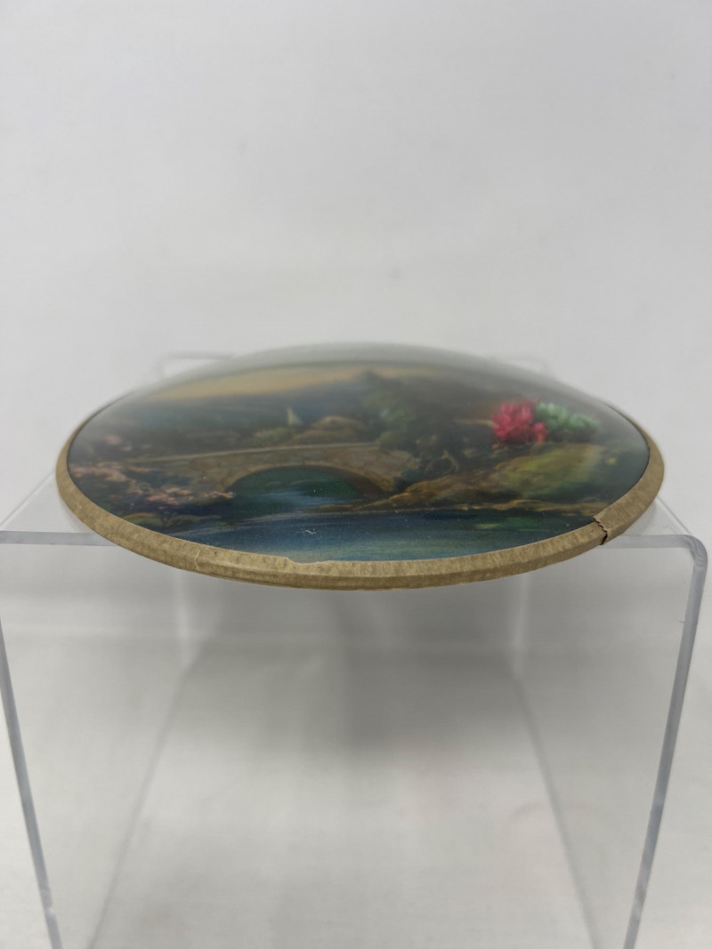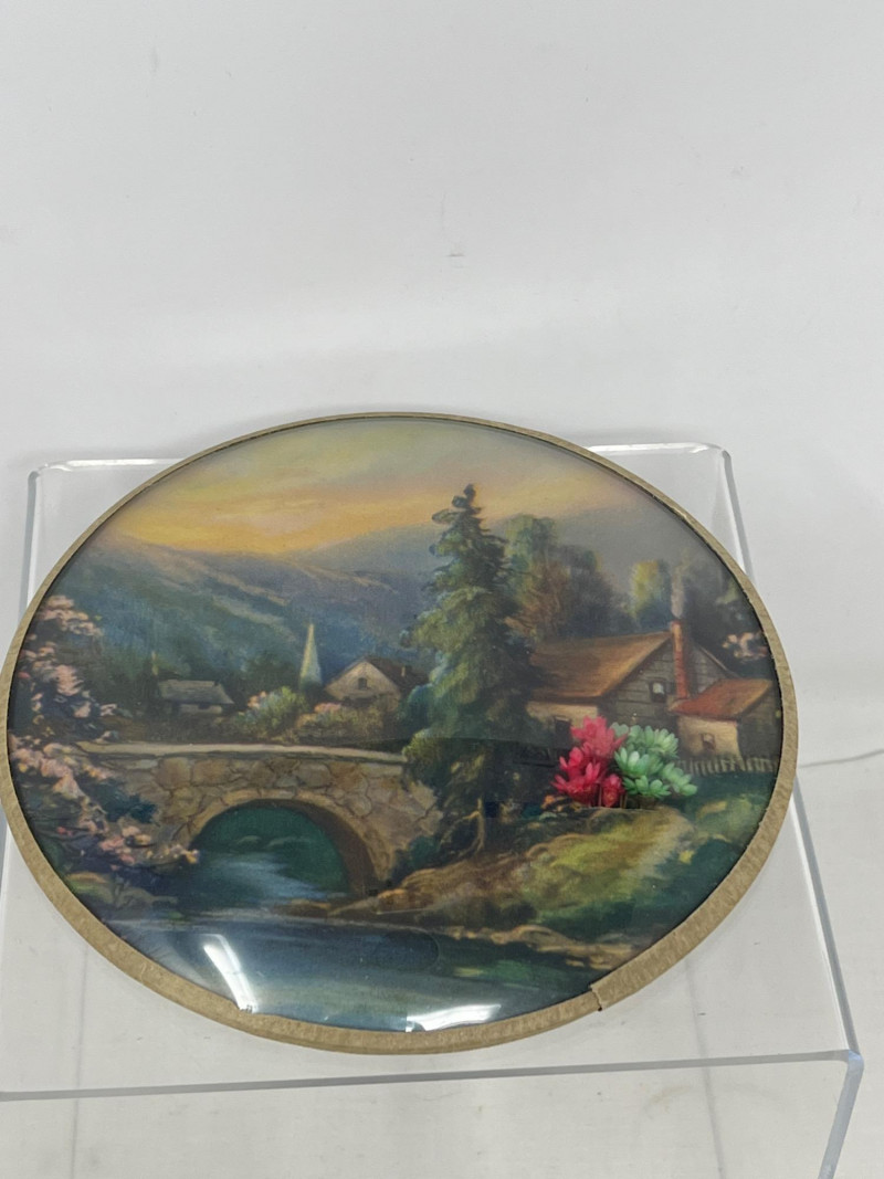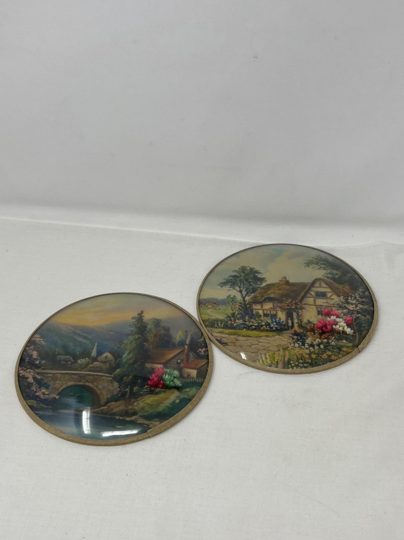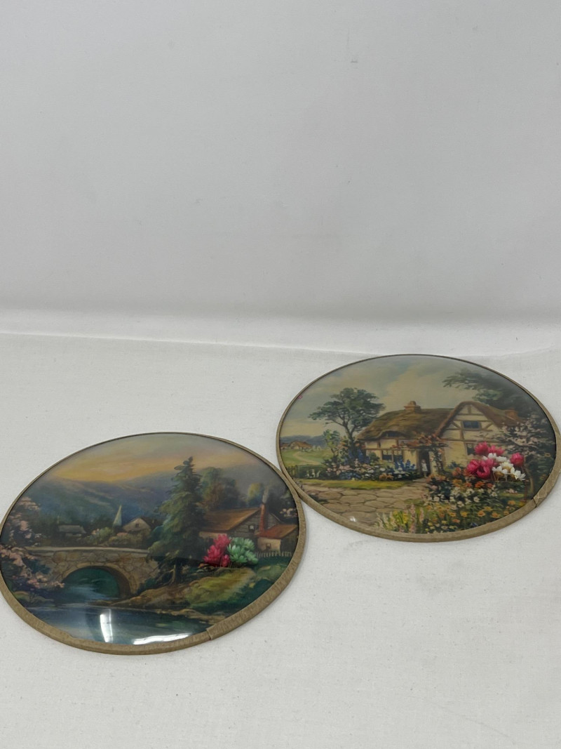A charming pair of late Victorian or Edwardian convex flue covers, each featuring an idealized pastoral scene—one depicting a stone bridge over a quiet stream, the other a quaint English cottage nestled in greenery. These circular wall plaques are set under "domed bubble glass or hard plastic", with printed lithographs backed by metal and bordered with delicate chain hangers. Originally designed to cover stovepipe wall openings during warmer months, flue covers offered an affordable way to beautify interiors while concealing utilitarian features. Today, they serve as nostalgic wall art and a window into turn-of-the-century domestic life.