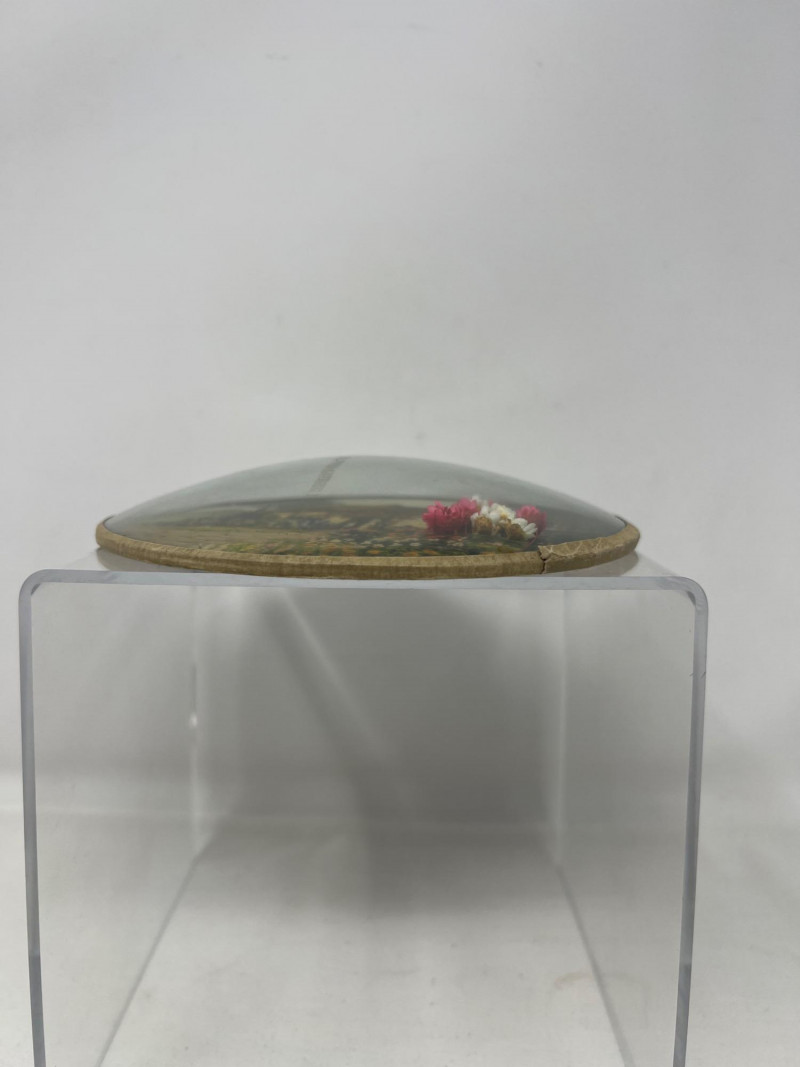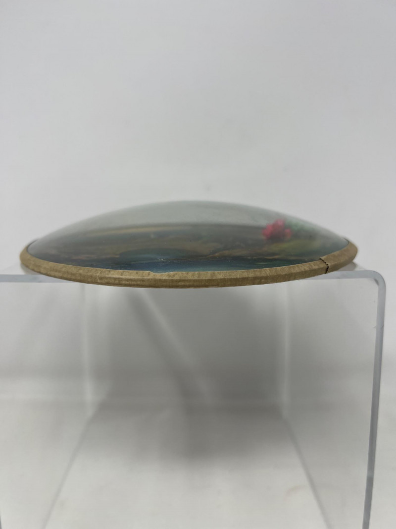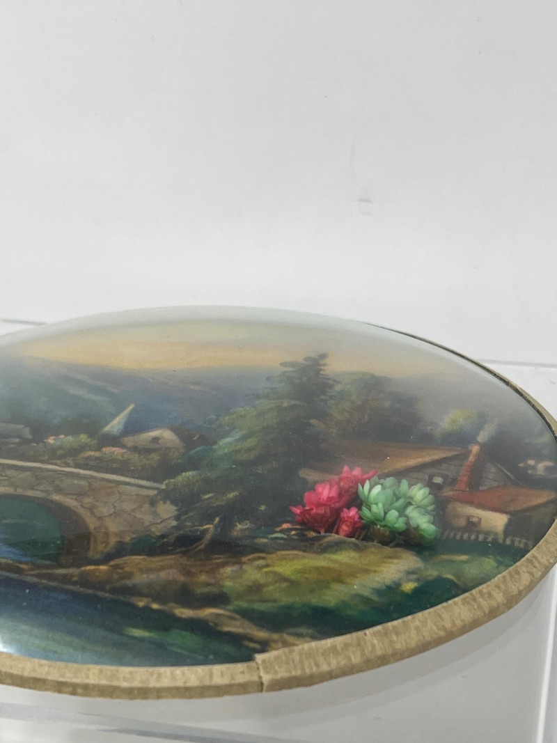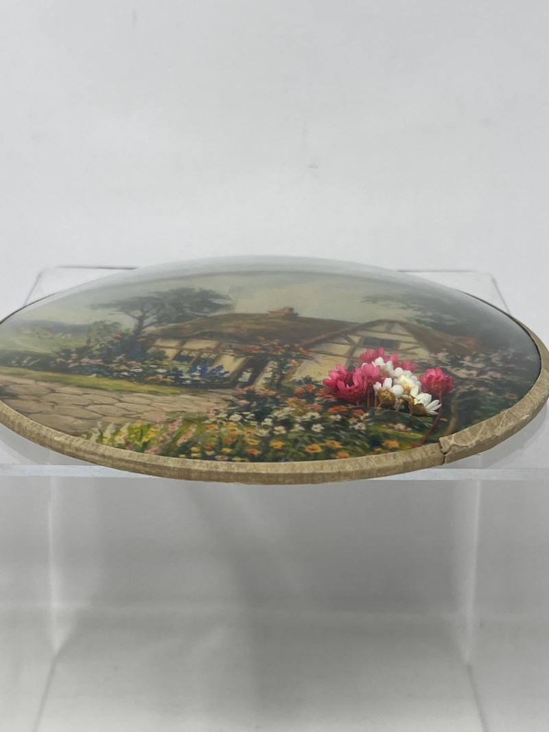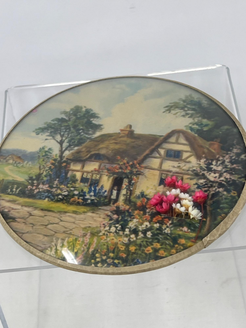 A charming pair of late Victorian or Edwardian convex flue covers, each featuring an idealized pastoral scene—one depicting a stone bridge over a quiet stream, the other a quaint English cottage nestled in greenery. These circular wall plaques are set under "domed bubble glass or hard plastic", with printed lithographs backed by metal and bordered with delicate chain hangers. Originally designed to cover stovepipe wall openings during warmer months, flue covers offered an affordable way to beautify interiors while concealing utilitarian features. Today, they serve as nostalgic wall art and a window into turn-of-the-century domestic life.