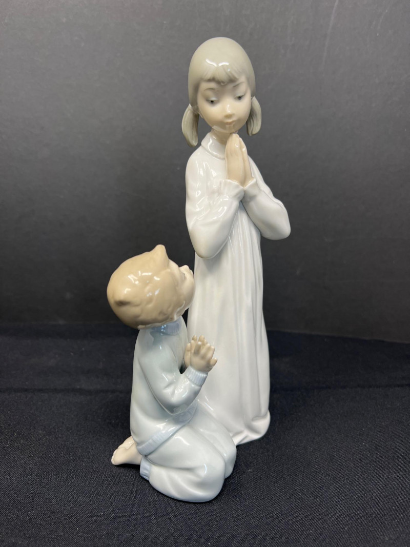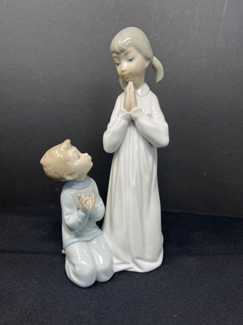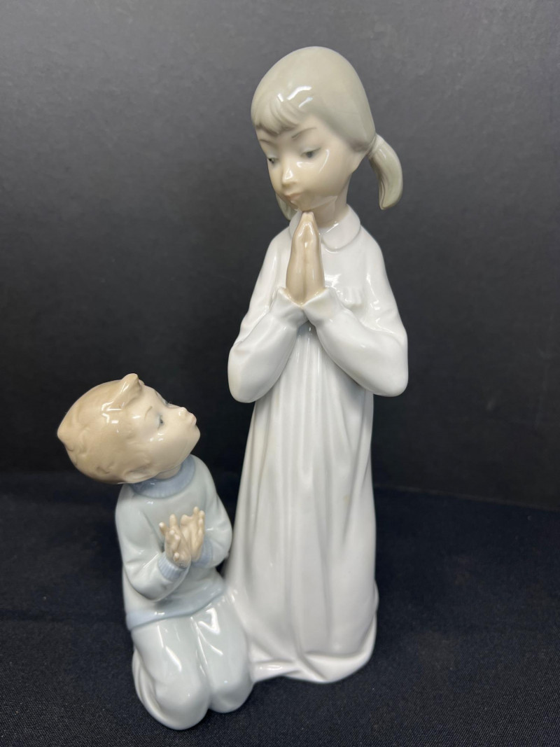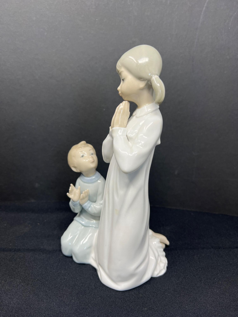 A tender porcelain figurine by Lladro titled “Teaching to Pray” (#4779), sculpted by Vicente Martinez and issued in 1971. This piece depicts a young girl gently guiding her little brother in prayer, both kneeling in quiet devotion. Crafted in Spain with a glossy finish, it stands approximately 8¾" tall and 4¾" wide. Retired in 1998, this figurine is cherished for its emotional resonance and timeless portrayal of childhood faith.