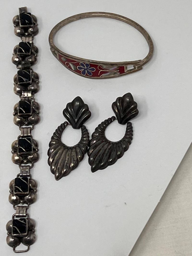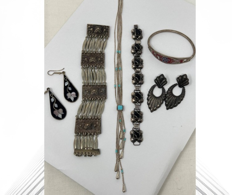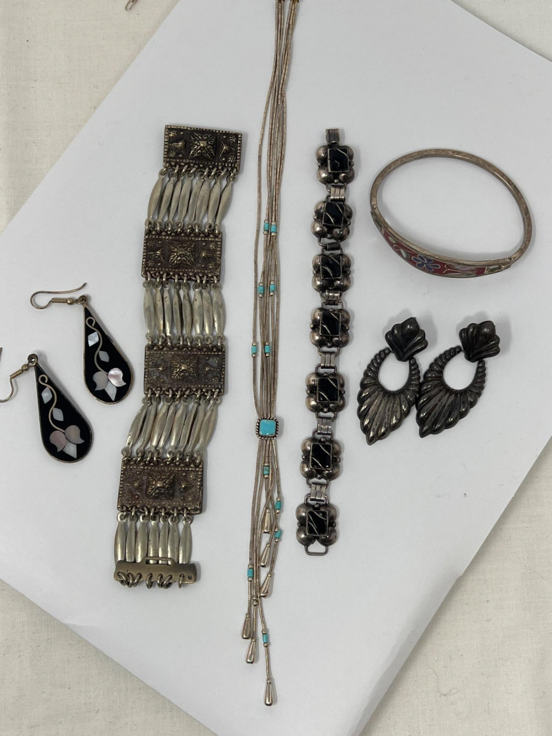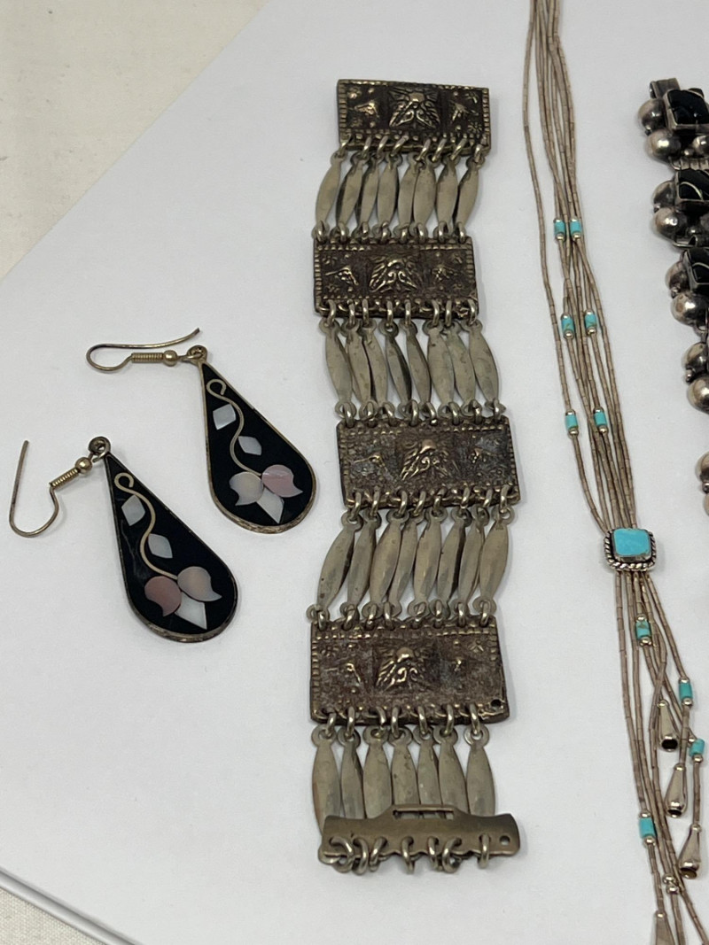 Lot # 116 - Mexican Silver Jewelry – Inlaid Bracelet, Chains & Earrings