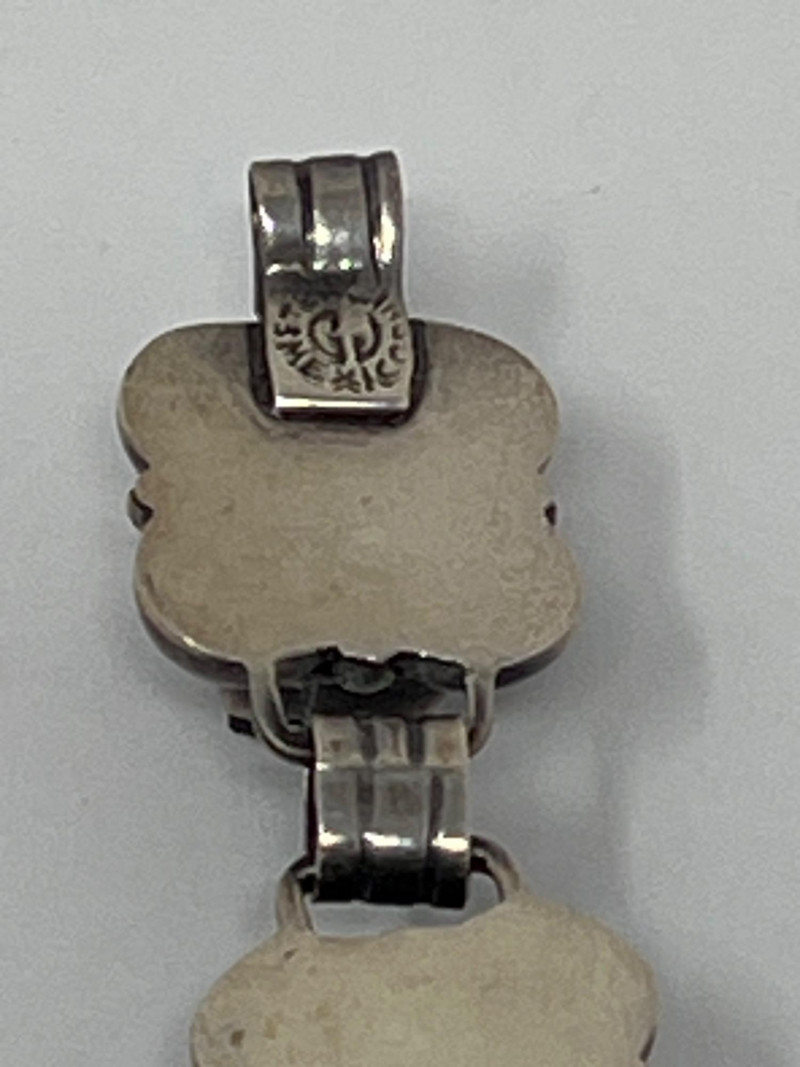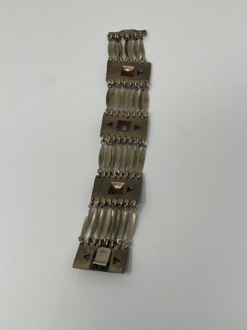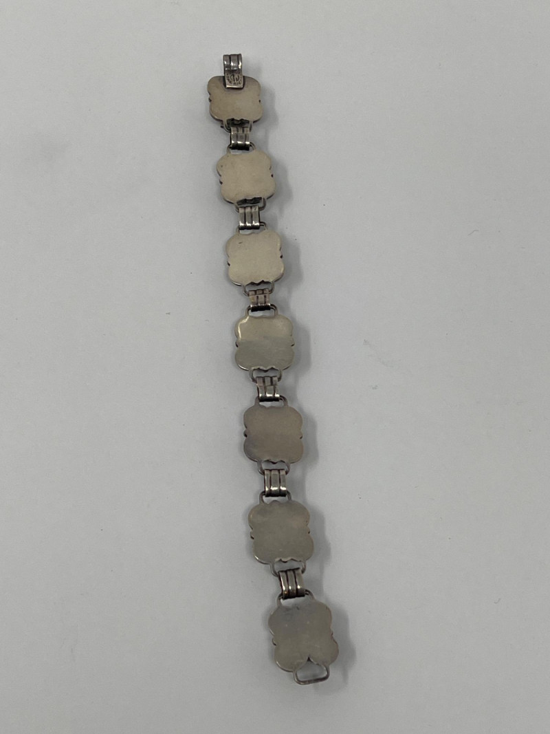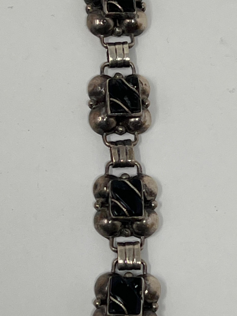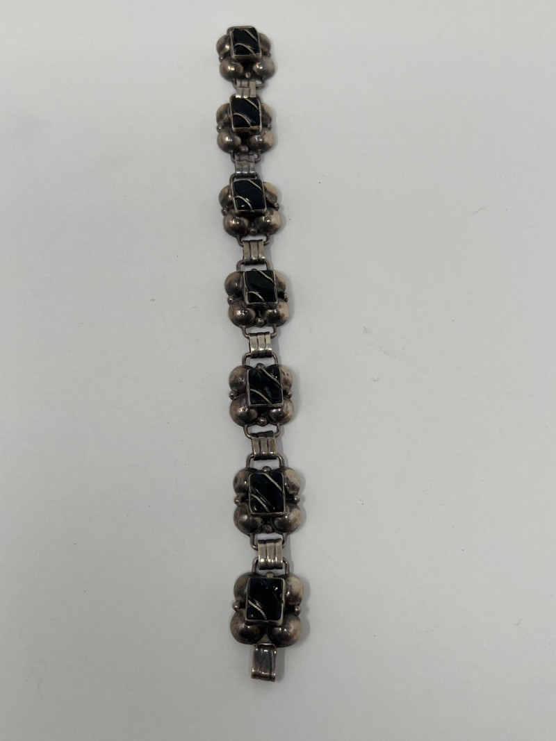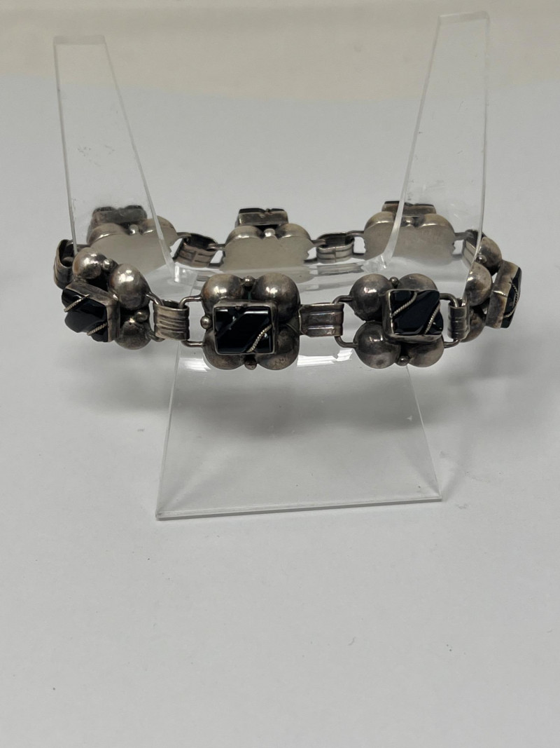 A varied selection of Mexican silver jewelry, blending craftsmanship and character: Inlaid Bracelet – 13g, featuring classic stonework Black Stone Link Bracelet – 29g, bold and tactile Artisan Link Bracelet – 52g, substantial and versatile Turquoise Necklace – 16g, vibrant and earthy Earrings (2 pairs) – 7g and 5g, including 925 silver dangle earrings and Mexico silver with mother-of-pearl inlay This lot offers a wearable archive of artisan tradition—ideal for collectors, stylists, or anyone drawn to the warmth and texture of handcrafted silver.