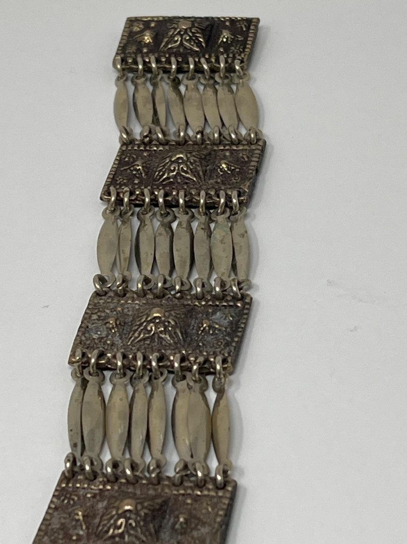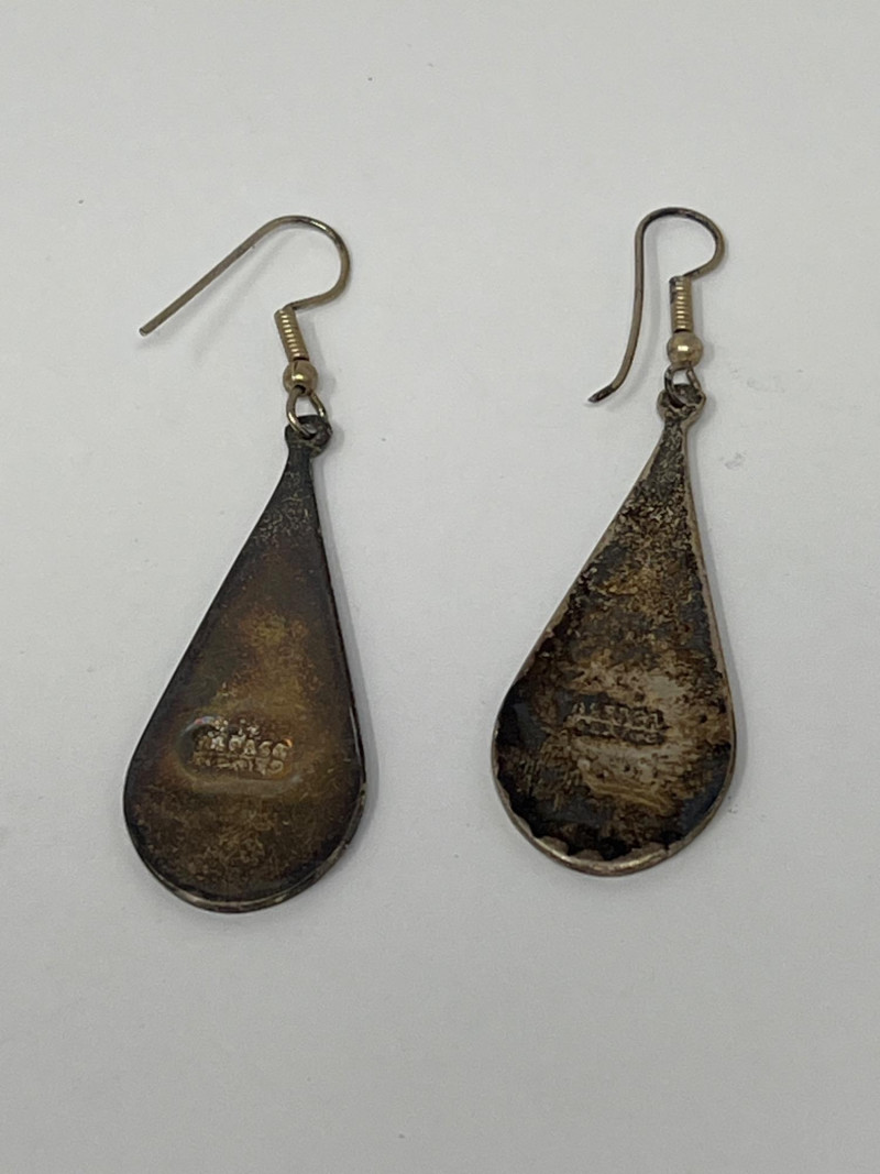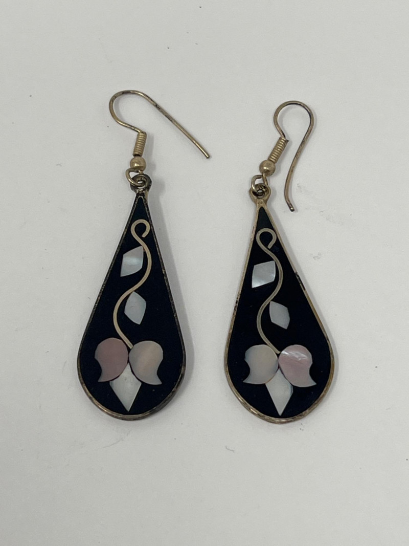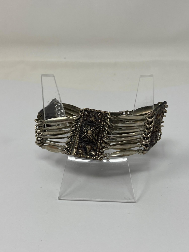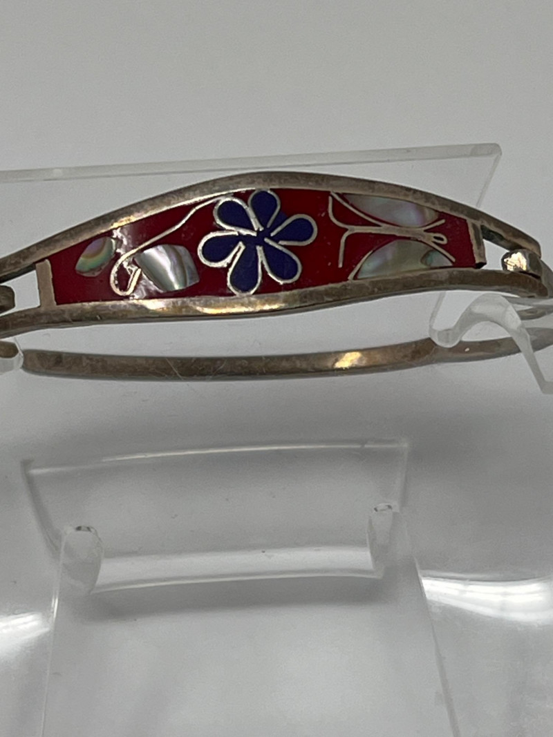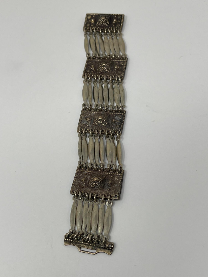 A varied selection of Mexican silver jewelry, blending craftsmanship and character: Inlaid Bracelet – 13g, featuring classic stonework Black Stone Link Bracelet – 29g, bold and tactile Artisan Link Bracelet – 52g, substantial and versatile Turquoise Necklace – 16g, vibrant and earthy Earrings (2 pairs) – 7g and 5g, including 925 silver dangle earrings and Mexico silver with mother-of-pearl inlay This lot offers a wearable archive of artisan tradition—ideal for collectors, stylists, or anyone drawn to the warmth and texture of handcrafted silver.