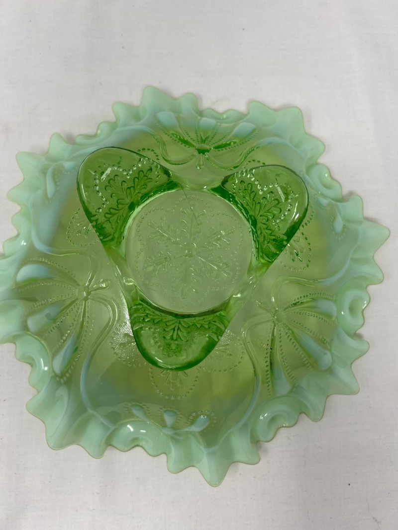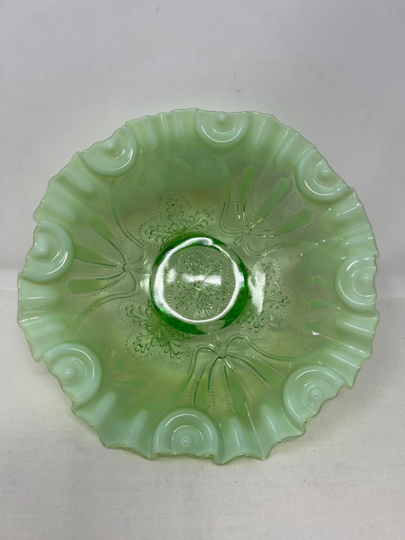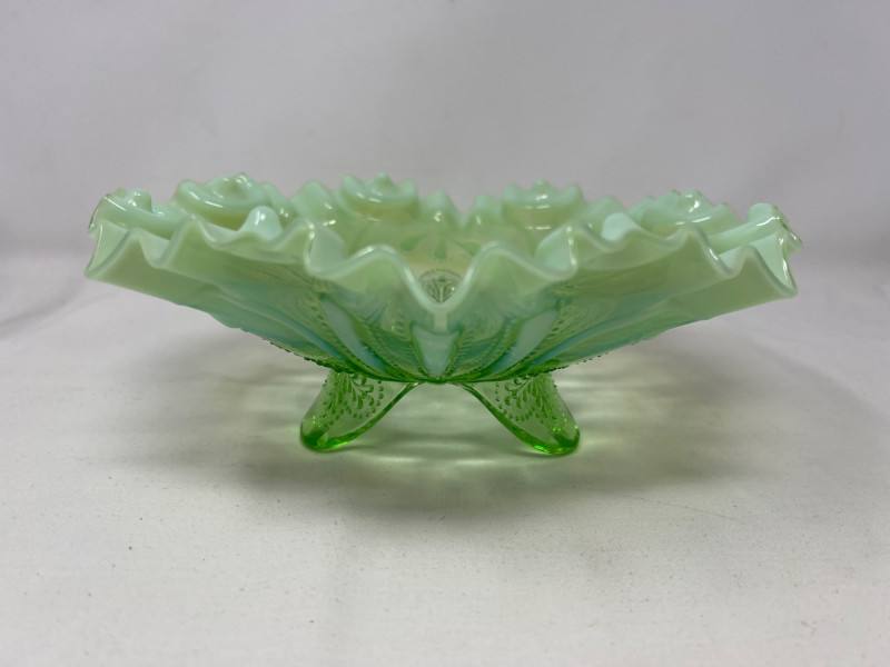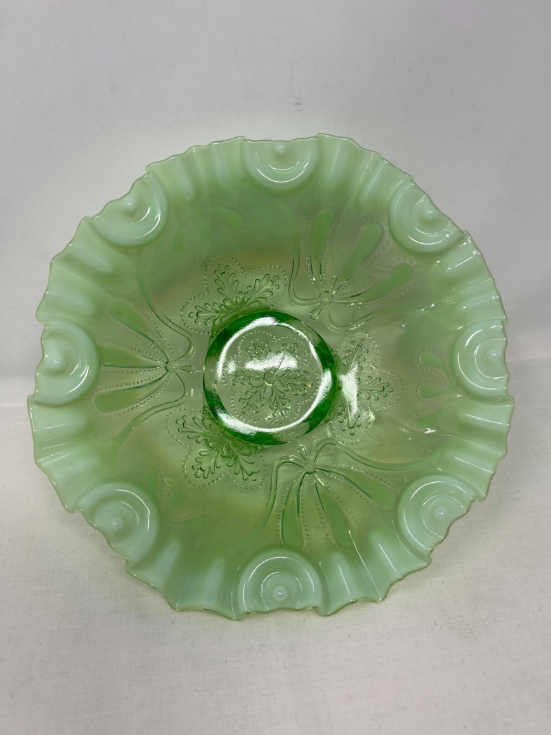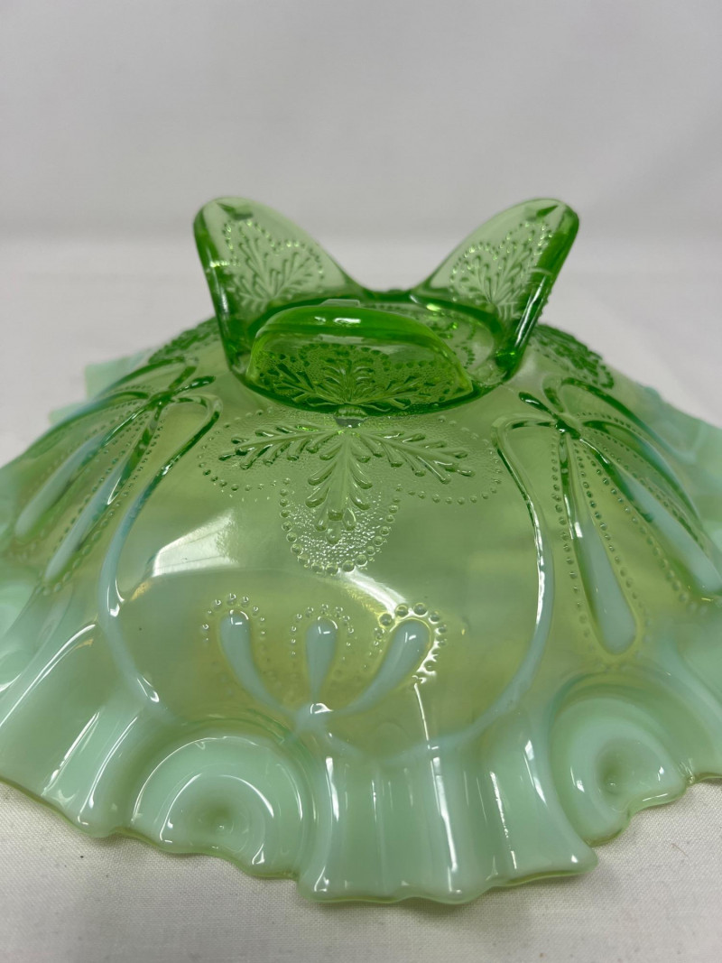 Lot # 117 - Jefferson Glass Meanser Green Opalescent Ruffle Footed Bowl