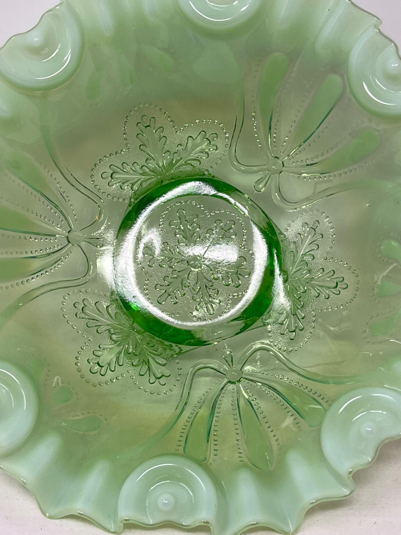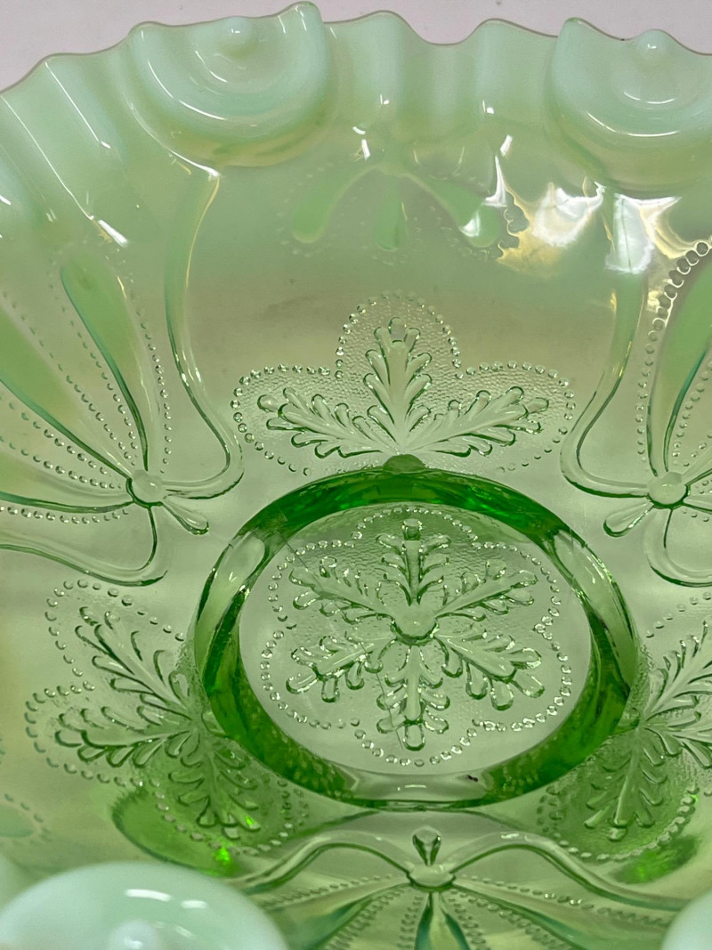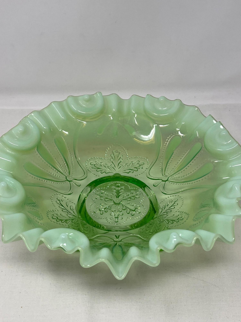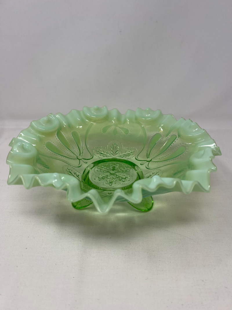 Lot # 117 - Jefferson Glass Meanser Green Opalescent Ruffle Footed Bowl