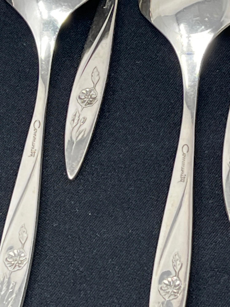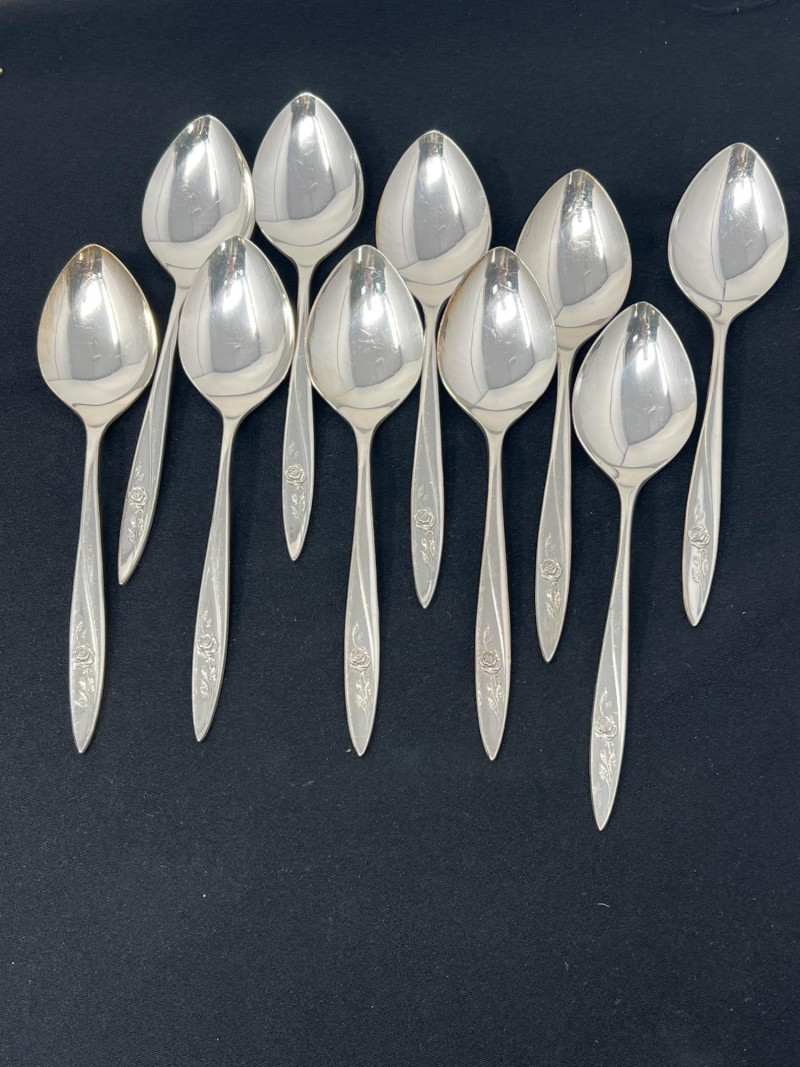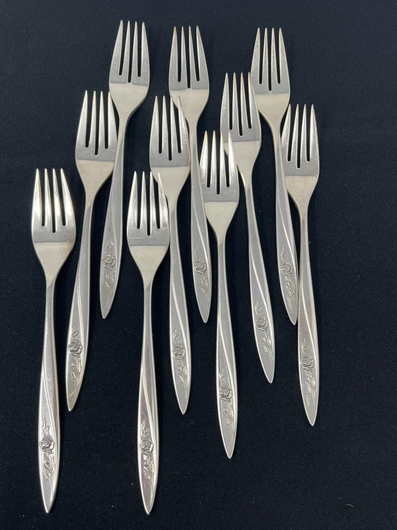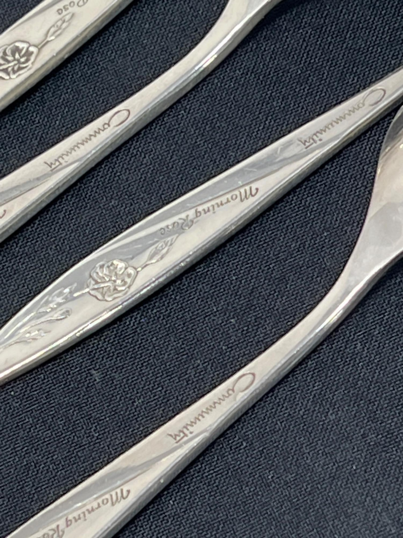 A complete 10-place setting of Community Morning Rose silverplate flatware, featuring the elegant floral motif introduced in 1960. This mid-century pattern blends romantic detailing with timeless functionality, making it ideal for both everyday use and formal entertaining. Includes dinner forks, salad forks, knives, soup spoons, and teaspoons—each piece polished and ready to grace the table. A beautiful way to add vintage charm and continuity to your dining experience.