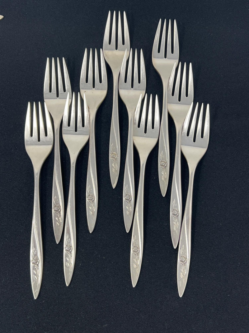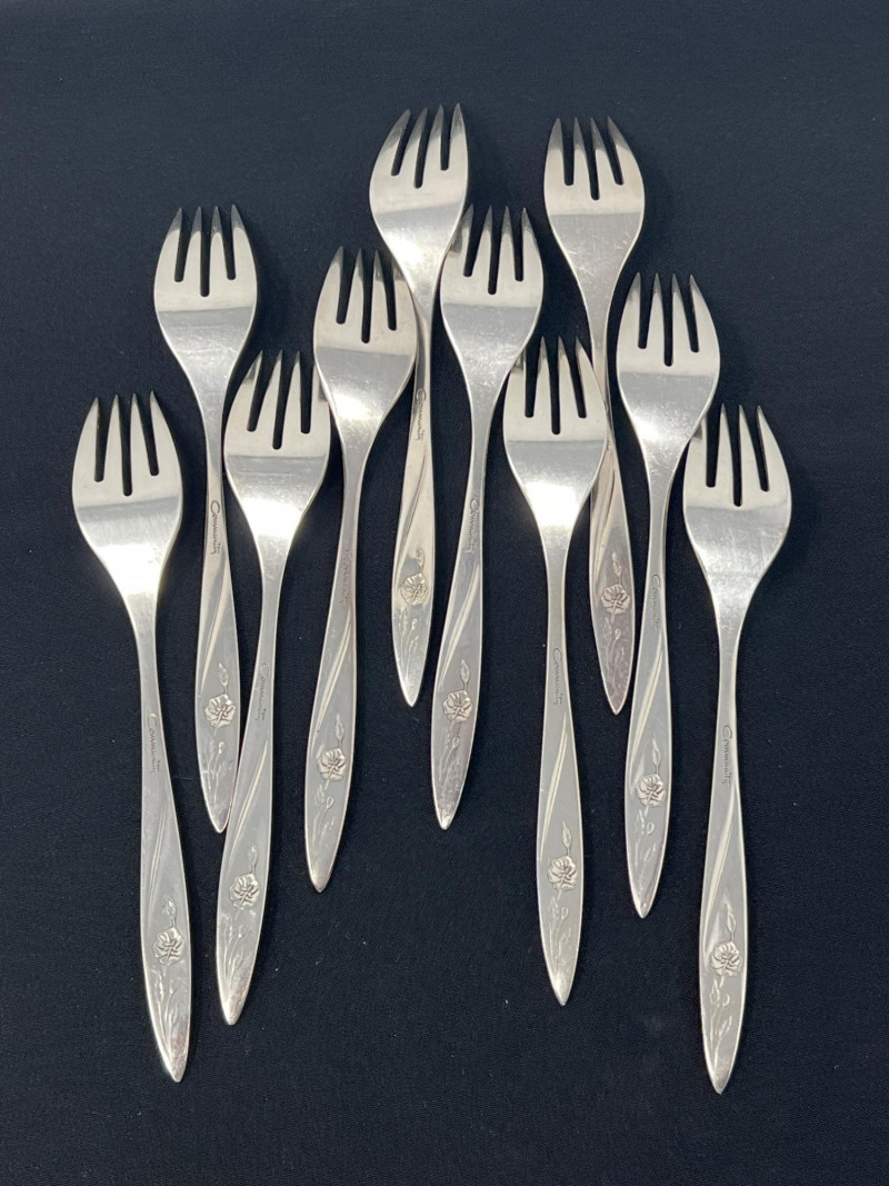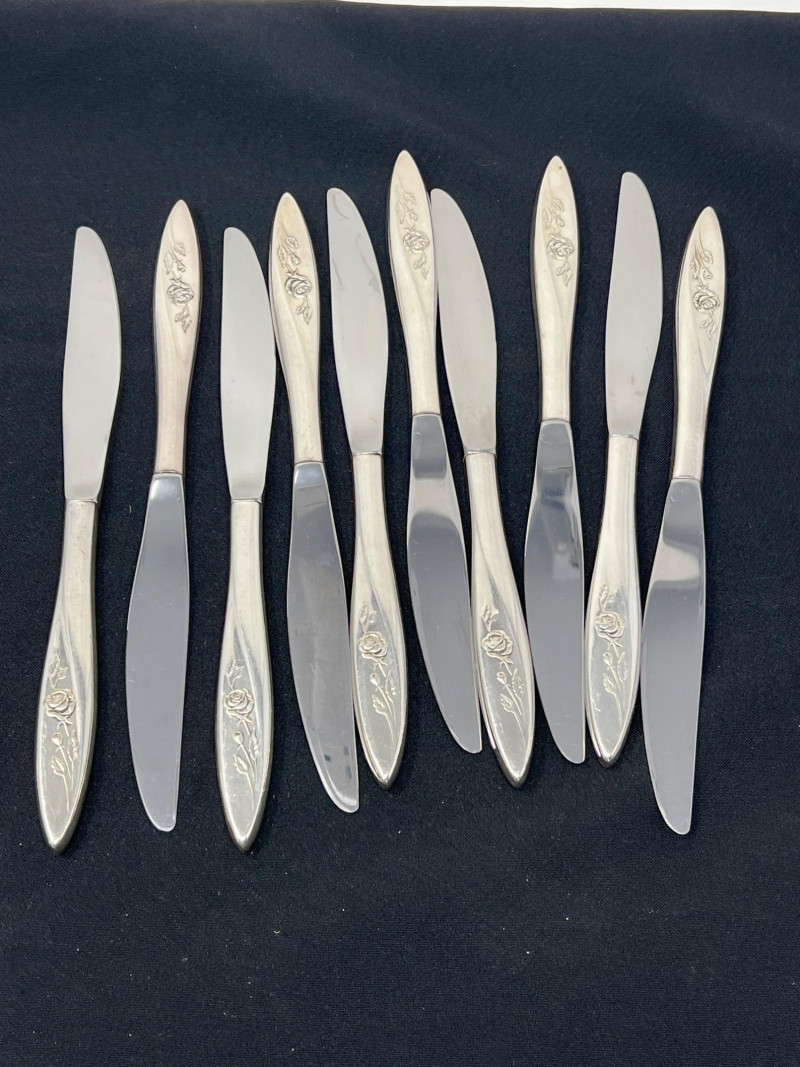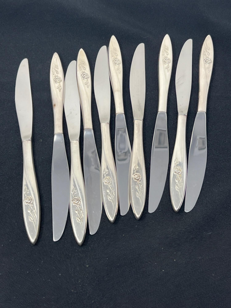 A complete 10-place setting of Community Morning Rose silverplate flatware, featuring the elegant floral motif introduced in 1960. This mid-century pattern blends romantic detailing with timeless functionality, making it ideal for both everyday use and formal entertaining. Includes dinner forks, salad forks, knives, soup spoons, and teaspoons—each piece polished and ready to grace the table. A beautiful way to add vintage charm and continuity to your dining experience.