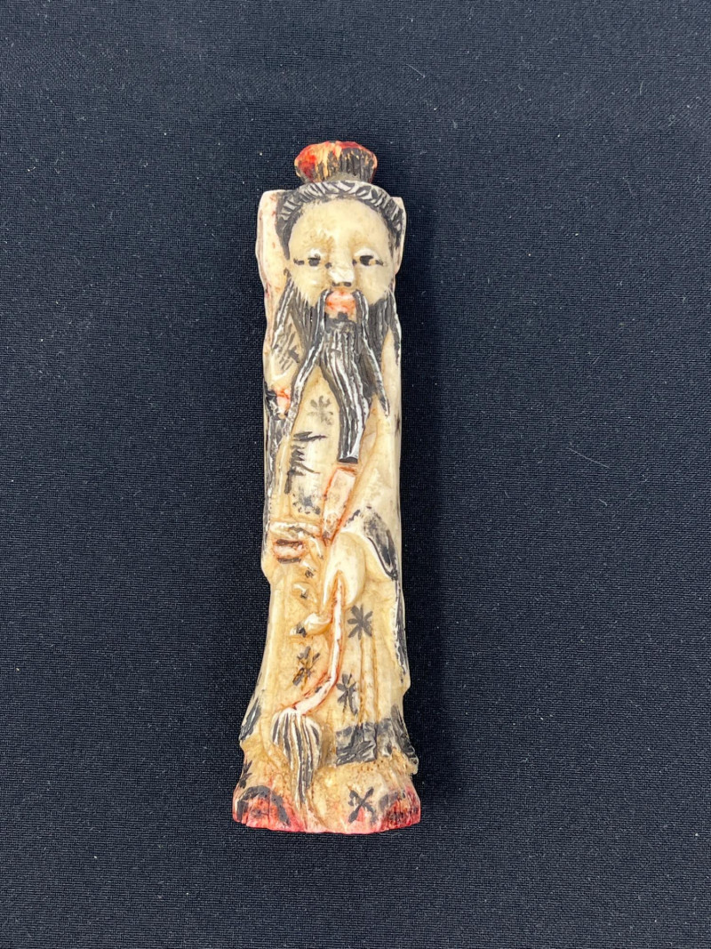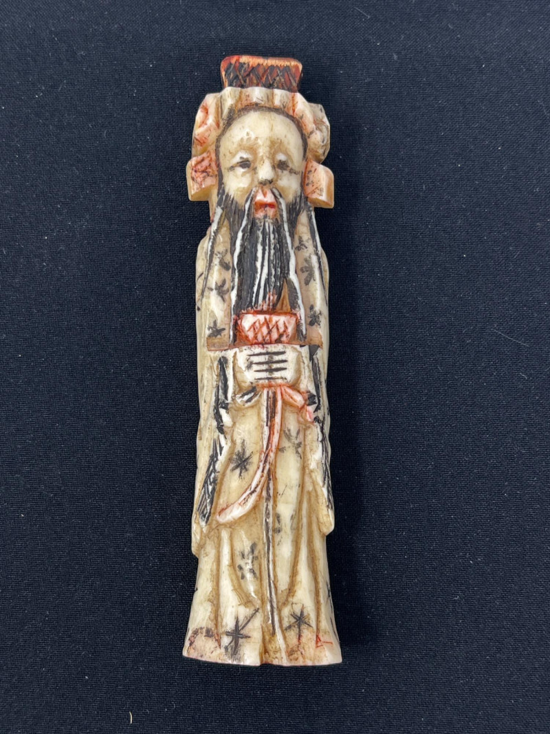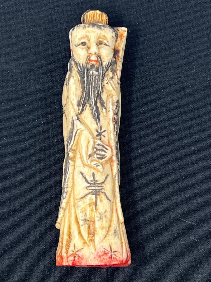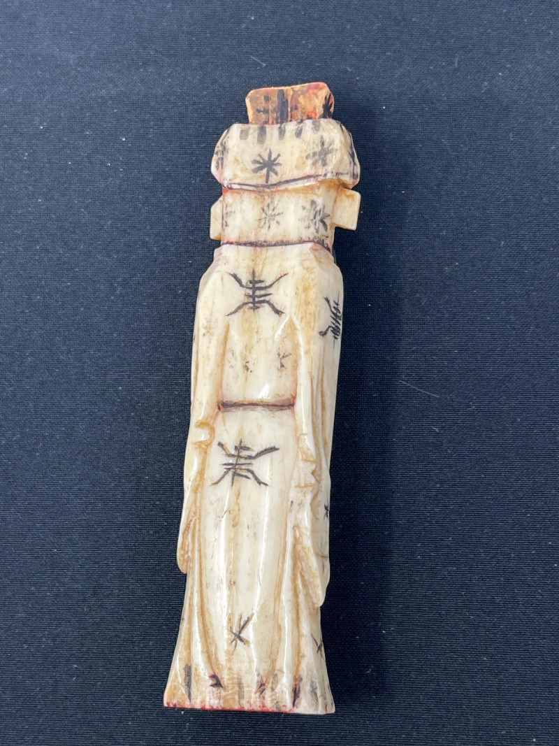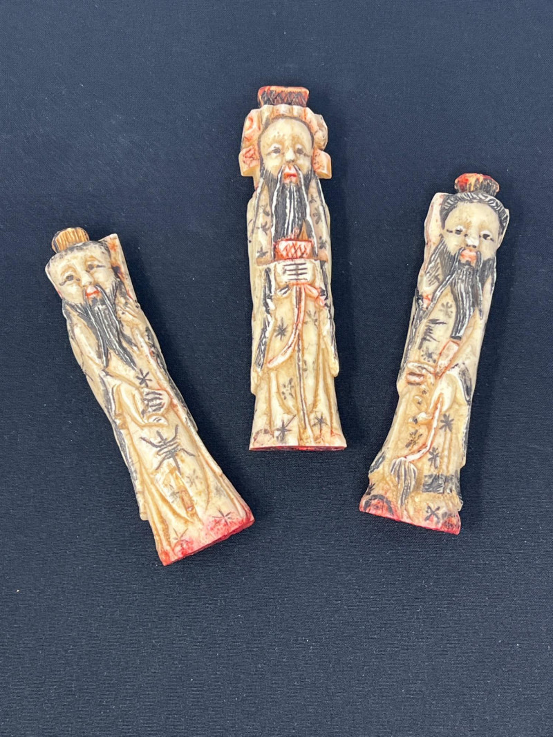 A set of three intricately carved bovine bone figures representing a few of the legendary Eight Immortals of Daoist mythology. Each figure stands between 5" and 5.5" tall, and feature expressive detailing in robes, faces, and symbolic attributes. The underside of each figure bears a carved dynastic-style mark, possibly referencing Qing-era reverence or imperial homage. These marks add historical intrigue and elevate the set’s collector appeal. A rare ensemble blending spiritual symbolism, craftsmanship, and cultural legacy.