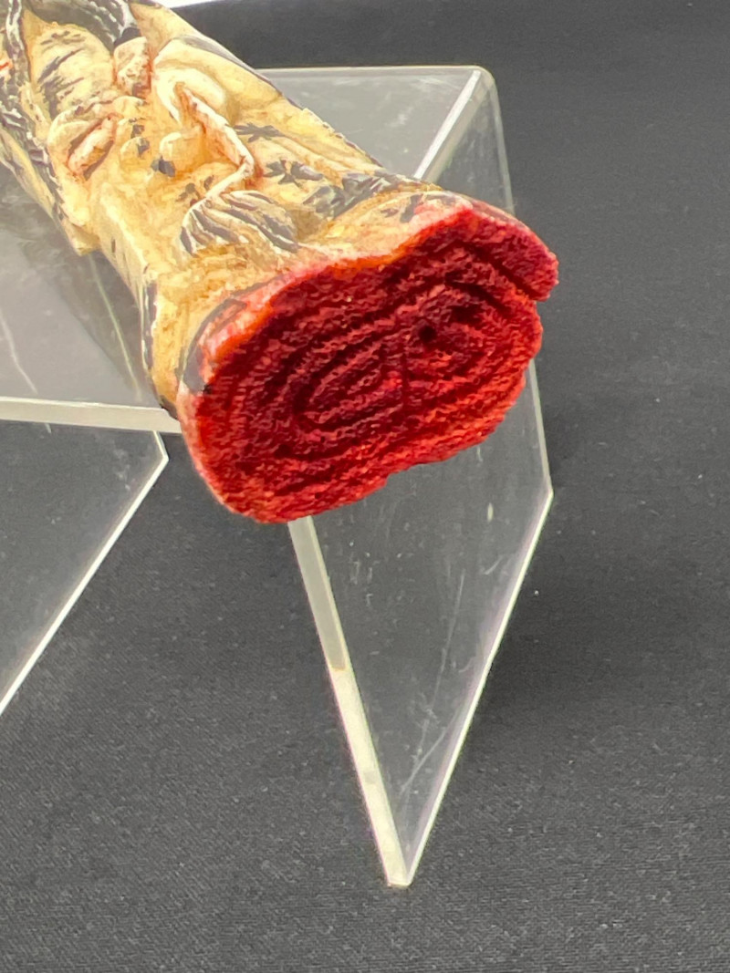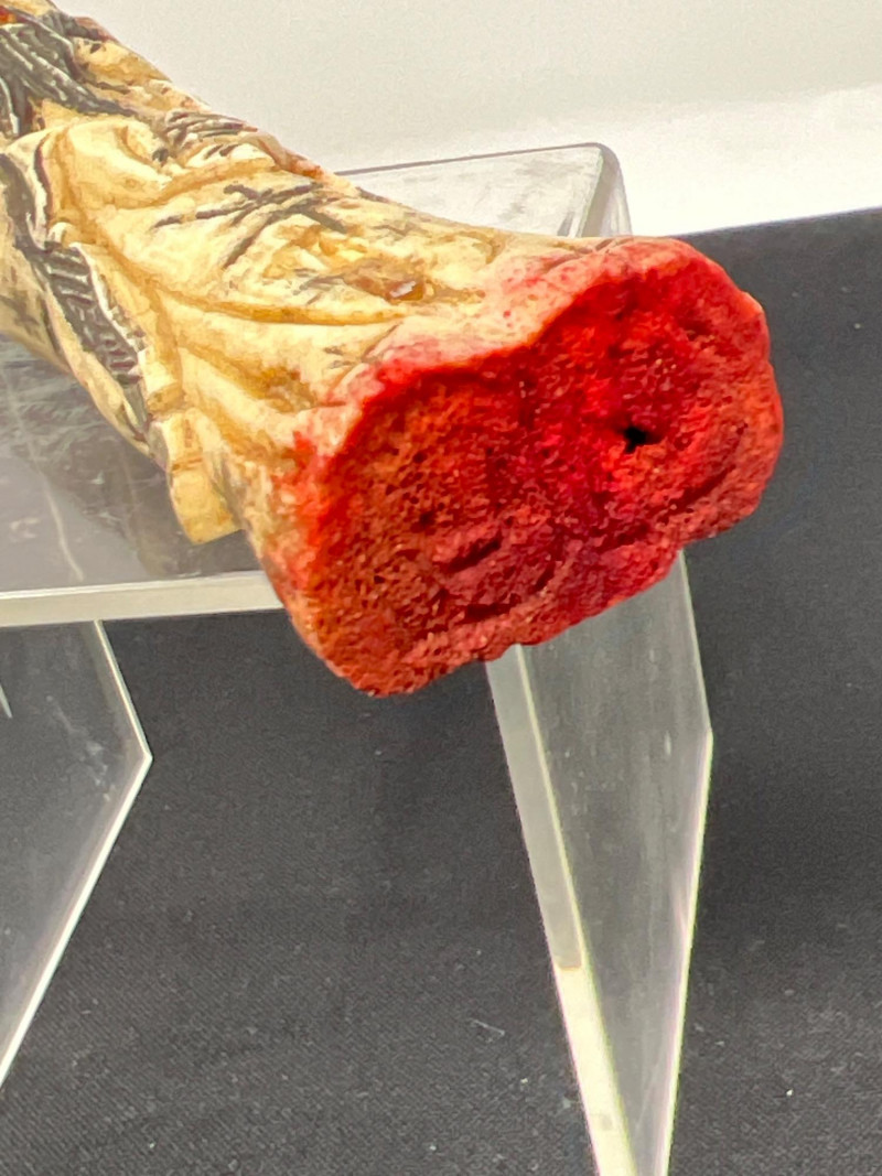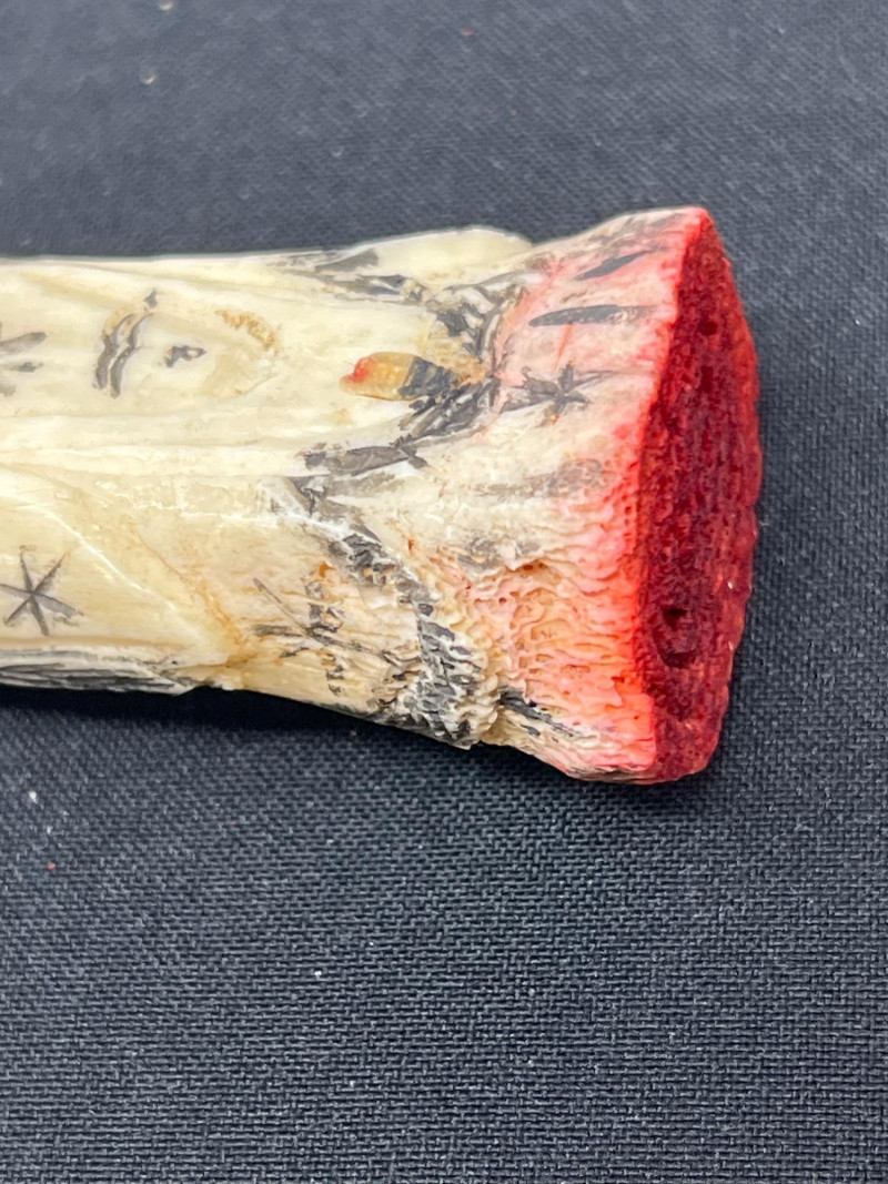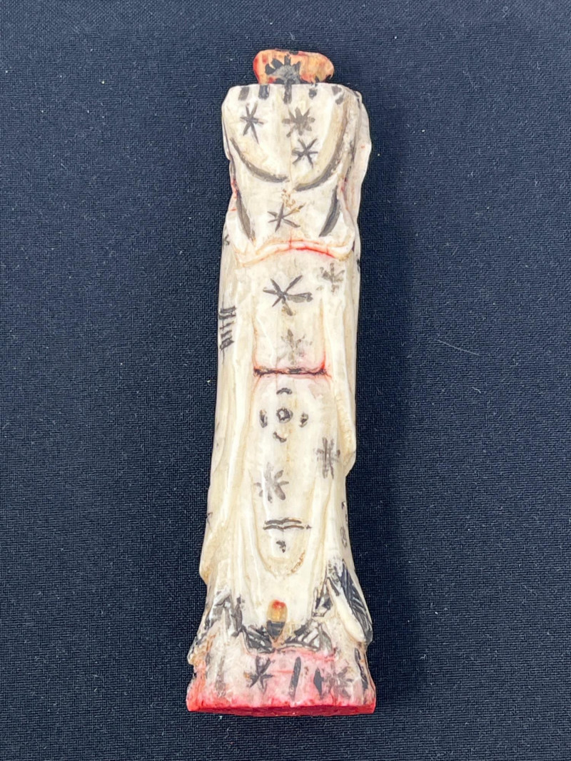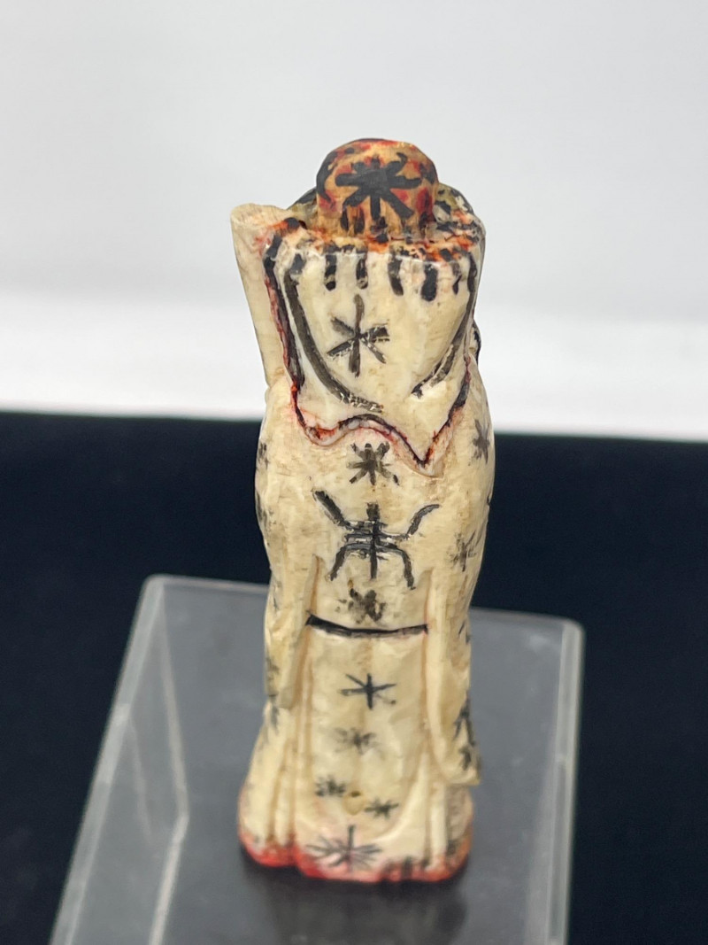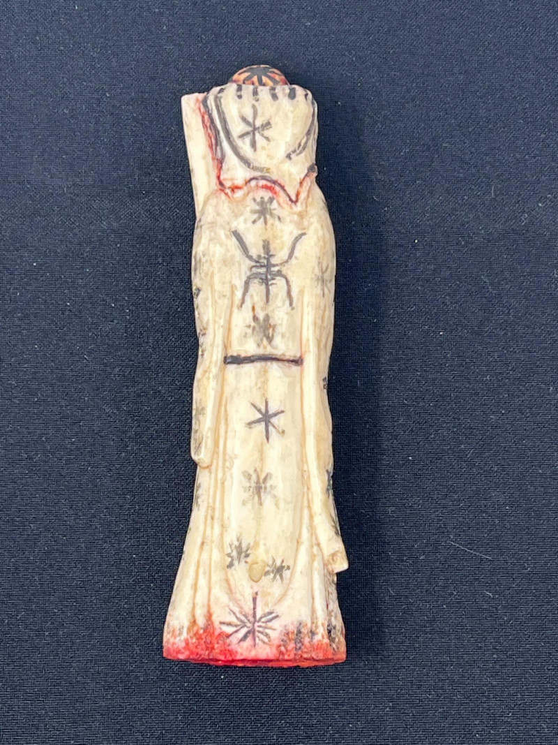 A set of three intricately carved bovine bone figures representing a few of the legendary Eight Immortals of Daoist mythology. Each figure stands between 5" and 5.5" tall, and feature expressive detailing in robes, faces, and symbolic attributes. The underside of each figure bears a carved dynastic-style mark, possibly referencing Qing-era reverence or imperial homage. These marks add historical intrigue and elevate the set’s collector appeal. A rare ensemble blending spiritual symbolism, craftsmanship, and cultural legacy.