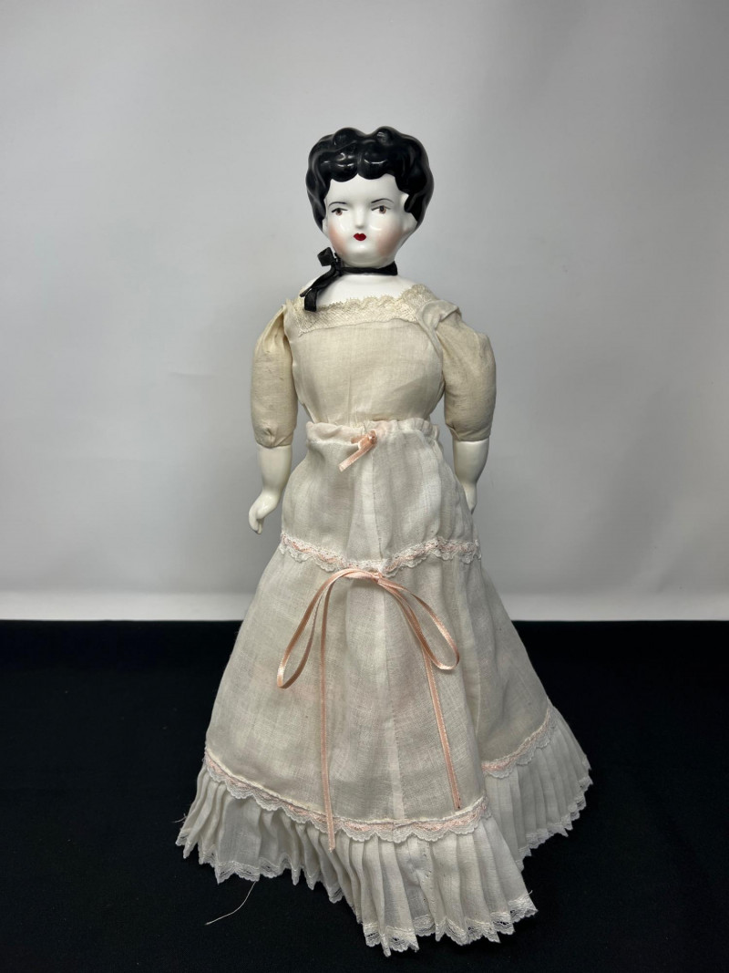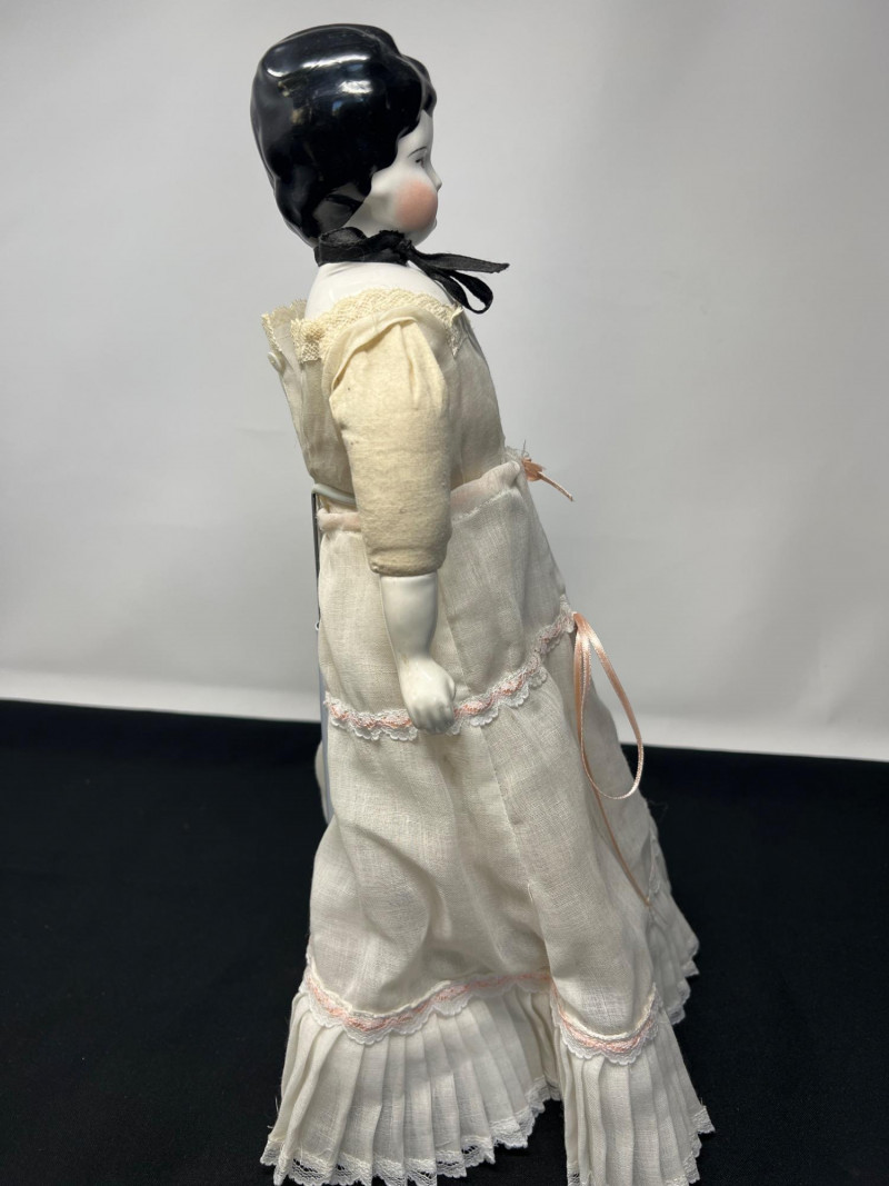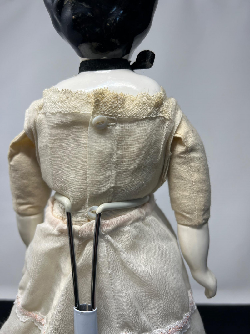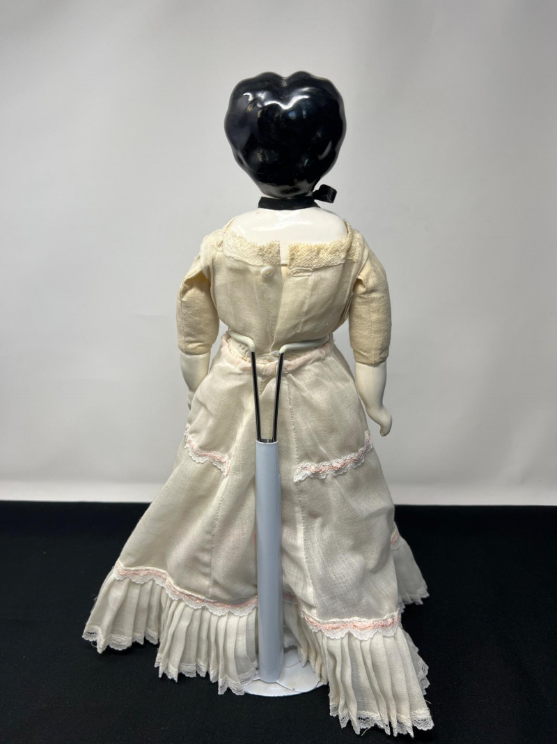 Dressed in a classic white gown, this porcelain-headed doll features molded black hair and a soft cloth body, likely dating to the late 19th or early 20th century. Her serene expression and traditional styling reflect the elegance of German dollmaking. 15" height. Stand is not original to doll but is included. Composite Head Doll with Wizard of Oz Print Dress