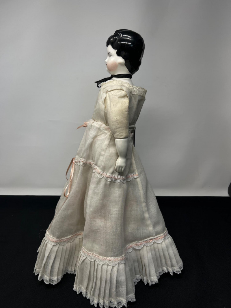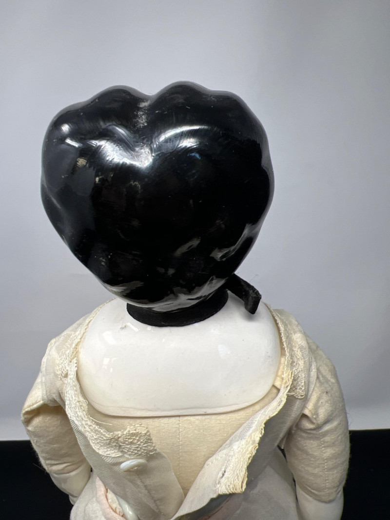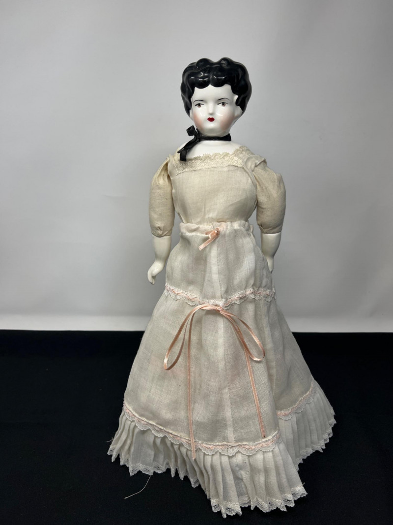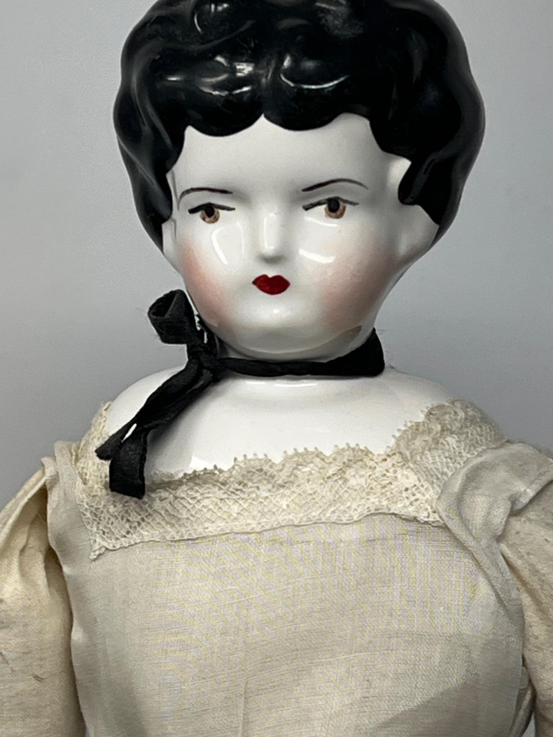 Dressed in a classic white gown, this porcelain-headed doll features molded black hair and a soft cloth body, likely dating to the late 19th or early 20th century. Her serene expression and traditional styling reflect the elegance of German dollmaking. 15" height. Stand is not original to doll but is included. Composite Head Doll with Wizard of Oz Print Dress