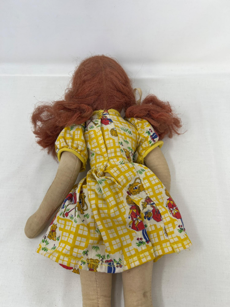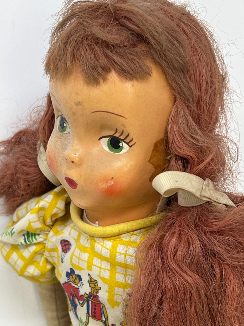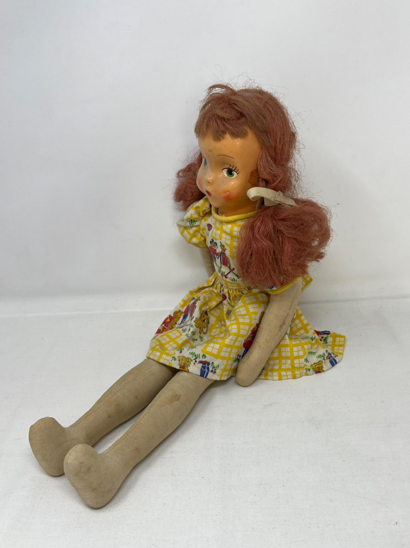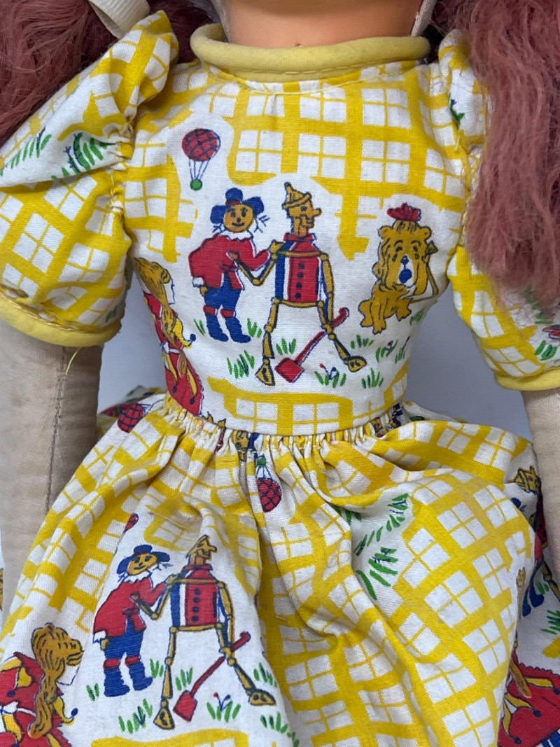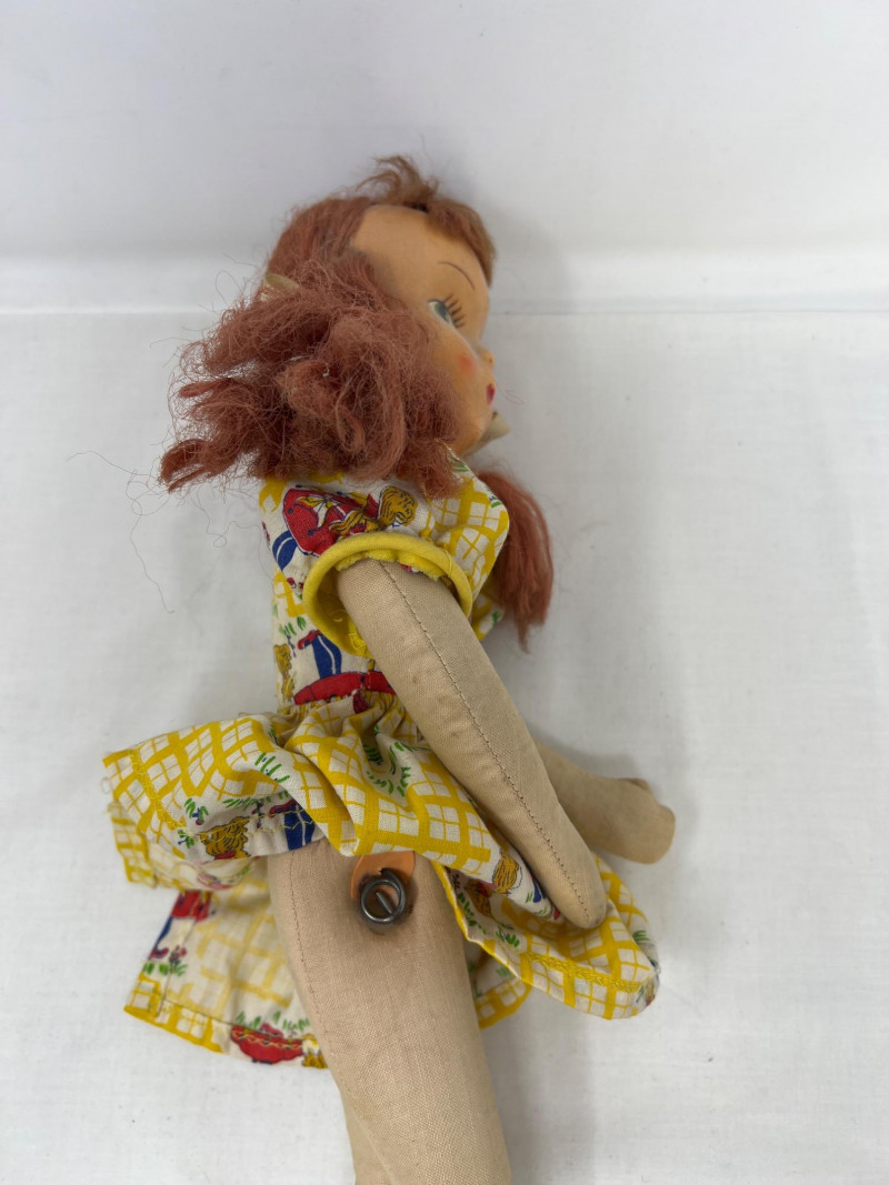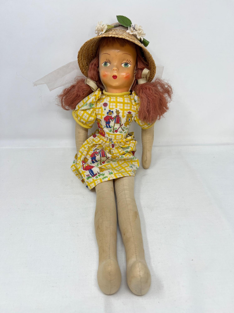 This early-century doll has a composition head and a sawdust-stuffed cloth body. Her dress is printed with whimsical Wizard of Oz character illustrations, adding a rare and playful narrative touch. Likely American-made, she embodies the charm of novelty dolls from the 1920s–30s. 18" height. Wig is separating from head in one location (see picture) Vintage Sawdust Doll with Felt Body and Plastic Face