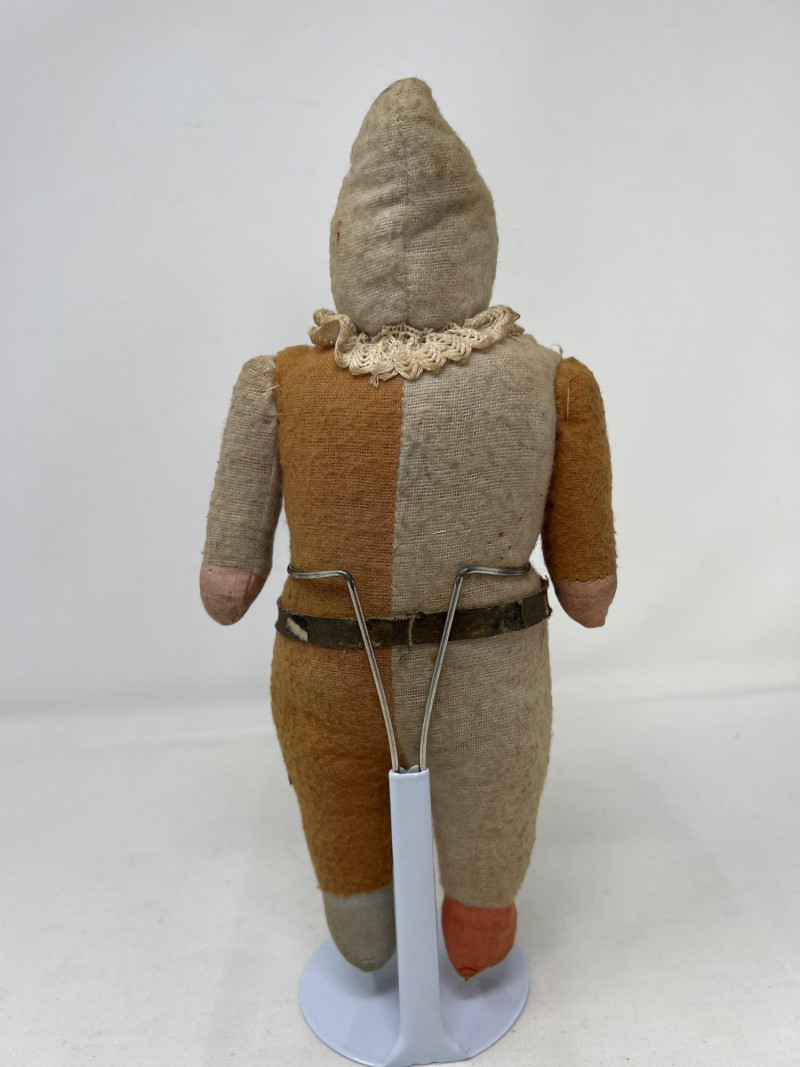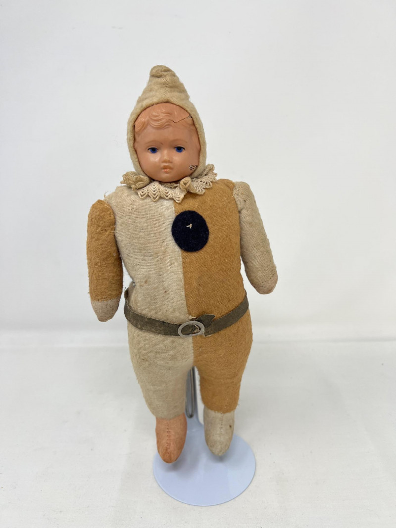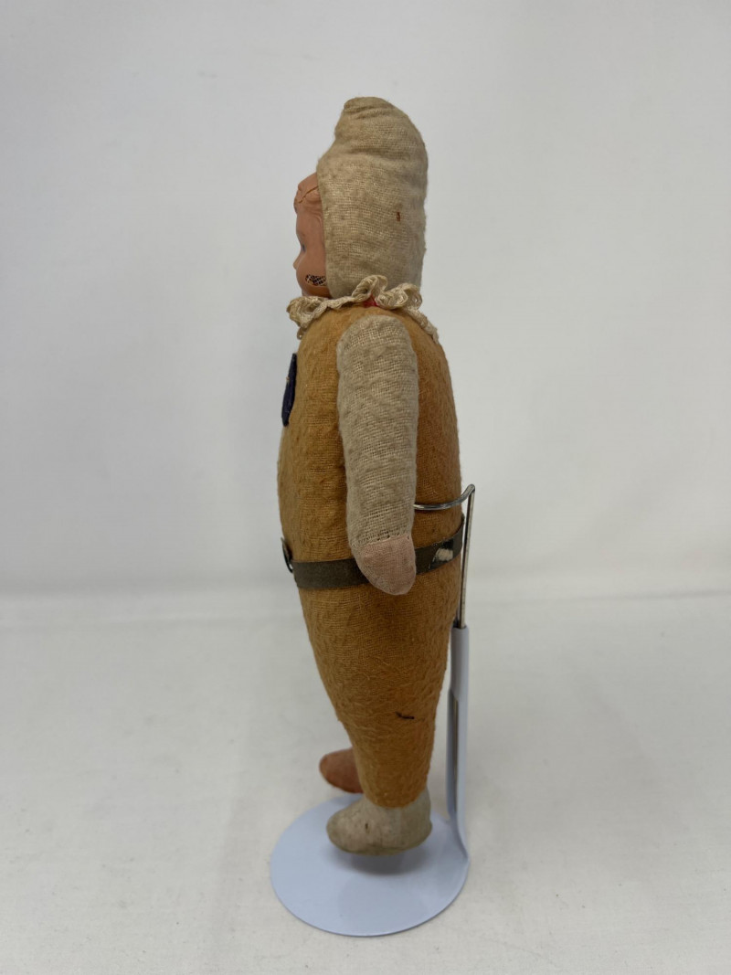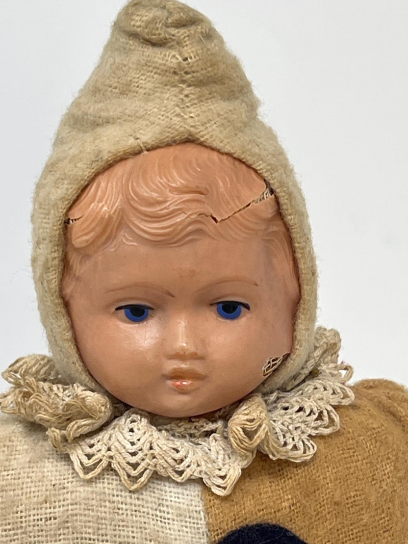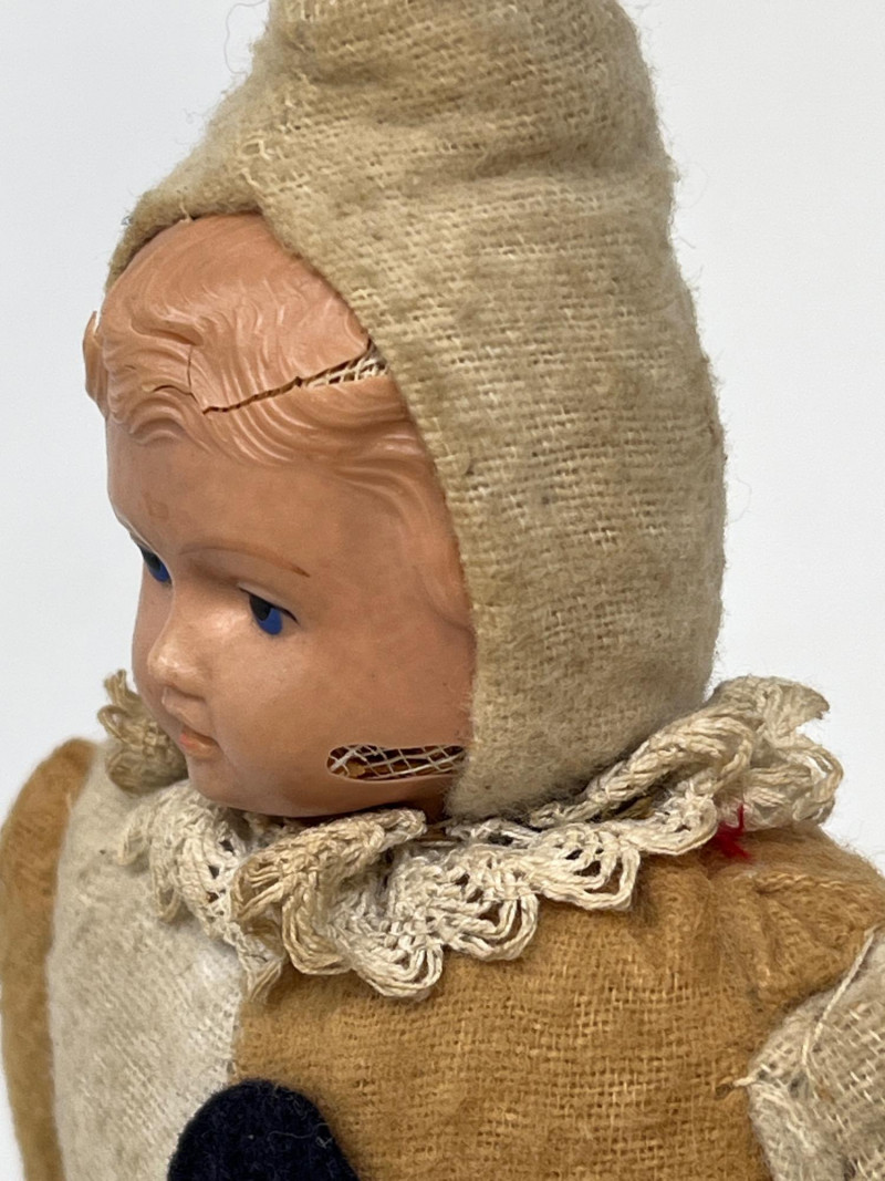 A mid-century figure with a felt body and molded plastic face, showing some wear to one side. Her expressive features and handmade feel suggest Eastern European or Soviet-era origins. Despite the damage, she retains strong display appeal and nostalgic value. 11" height. (see pictures for condition) Together, these dolls offer a tactile journey through storytelling, craftsmanship, and cultural memory—perfect for collectors of antique toys or those drawn to expressive vintage figures. Collector value for all of these dolls is approximately $600