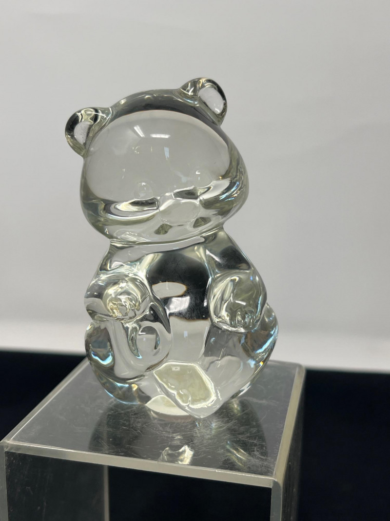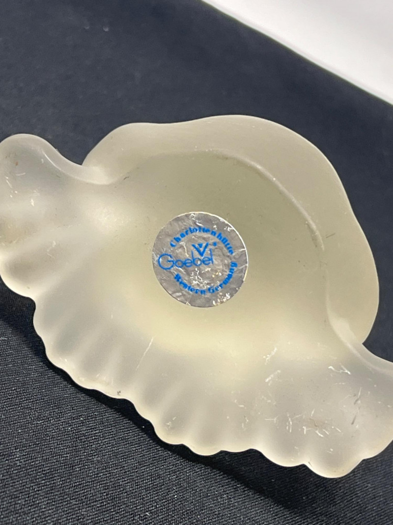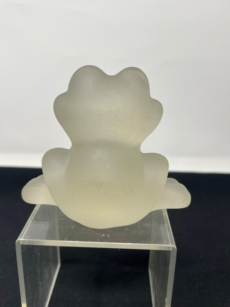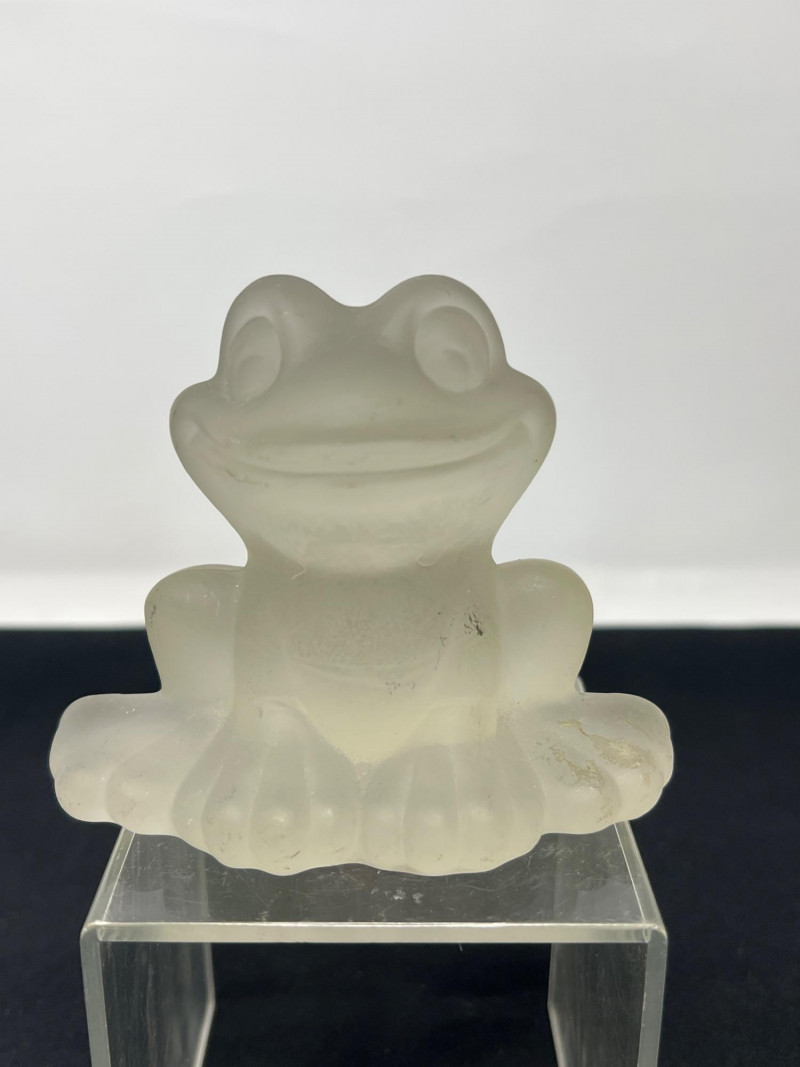 Two weighty, hand-formed figures—one a smooth glass pear with minimalist appeal, the other a solid glass bear with rounded contours and gentle expression. Both pieces reflect light beautifully and offer tactile presence. 5 inches tall Goebel Frosted Glass Frog