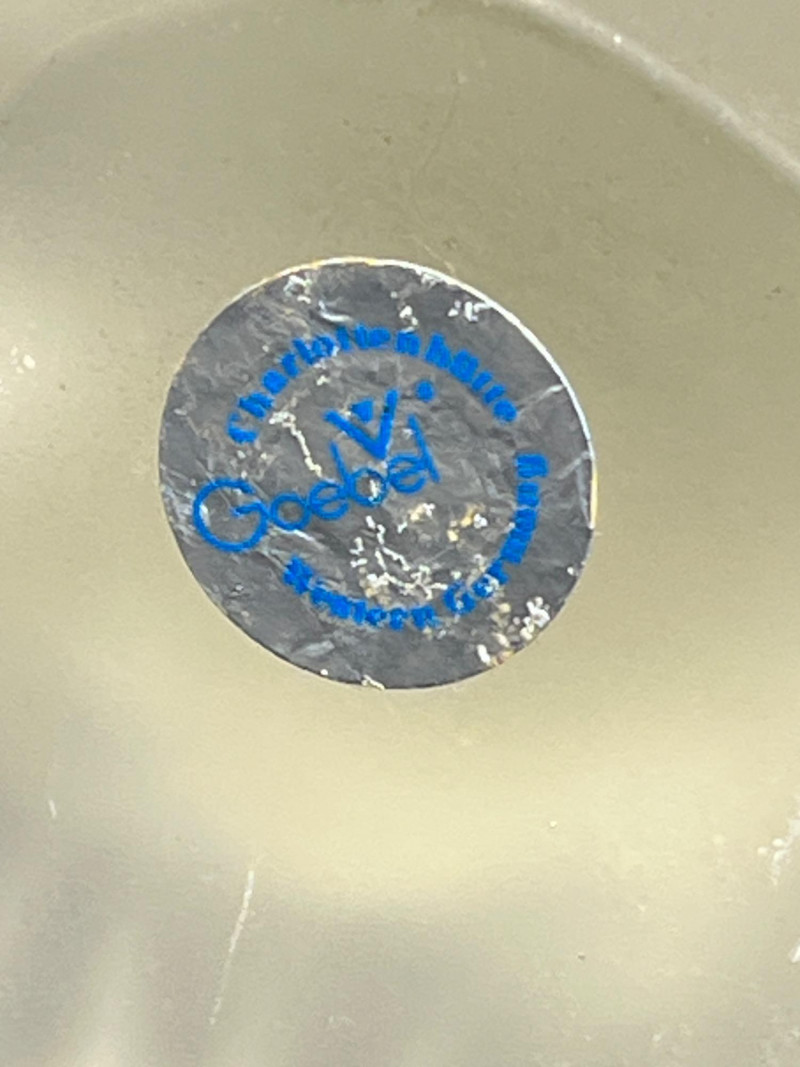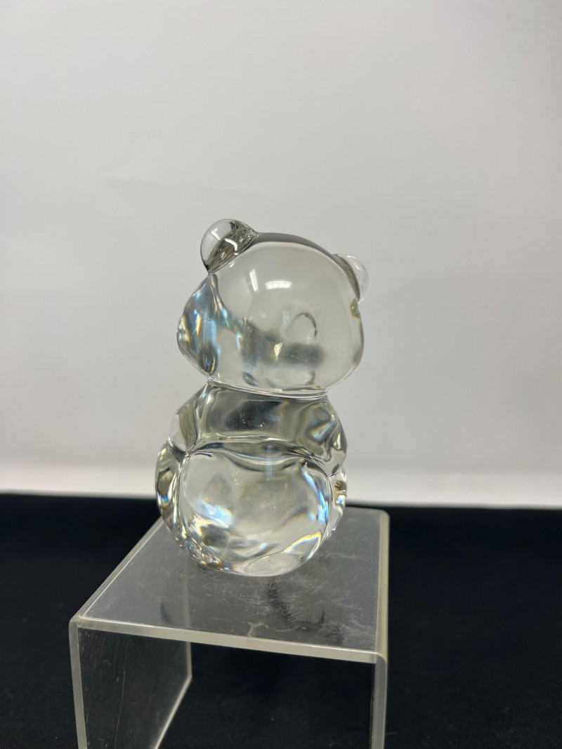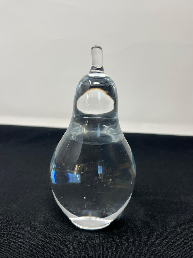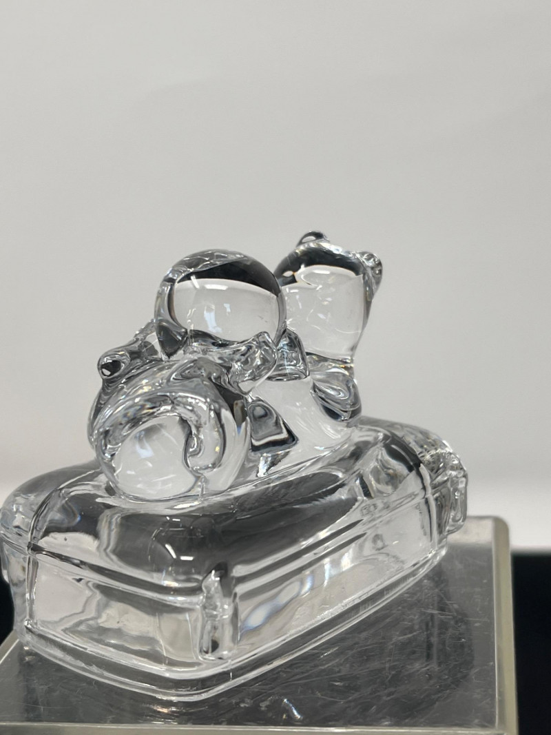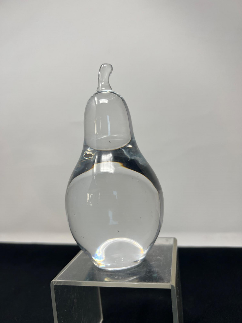 Two weighty, hand-formed figures—one a smooth glass pear with minimalist appeal, the other a solid glass bear with rounded contours and gentle expression. Both pieces reflect light beautifully and offer tactile presence. 5 inches tall Goebel Frosted Glass Frog