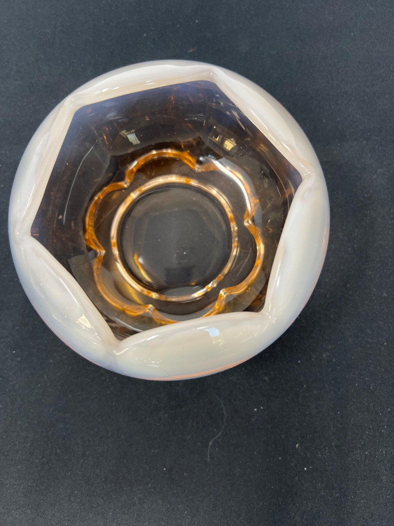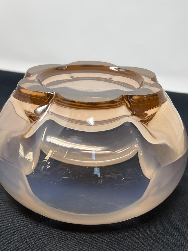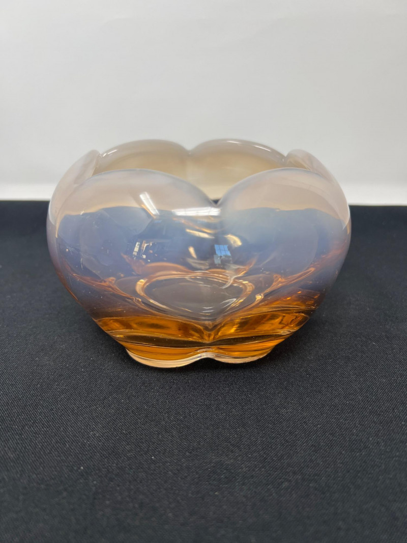 A low-profile glass bowl with a soft ombre fade from peach to clear. Measuring approximately 3.5" high by 5" in diameter, it’s ideal for floral arrangements or as a subtle centerpiece. Its warm tone and gentle gradient add a modern yet inviting touch.