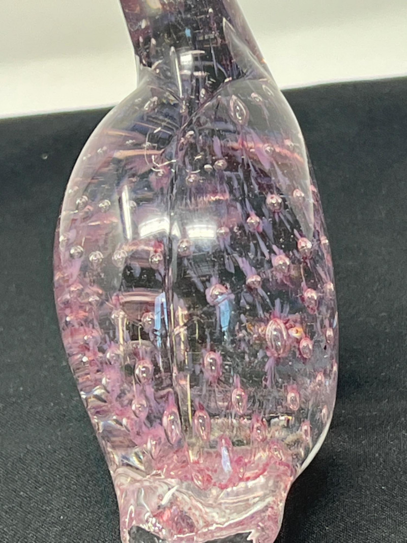 A striking art glass figure with a swan-like silhouette and peacock-like flair. The pink-toned body features suspended interior bubbles, creating a dreamy, ethereal effect. Likely hand-blown, this piece is a standout in the group. 6 inches tall. Glass Cat Playing with Ball