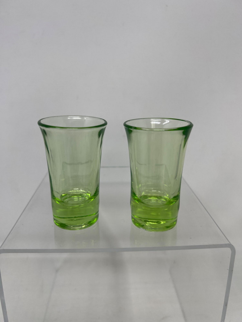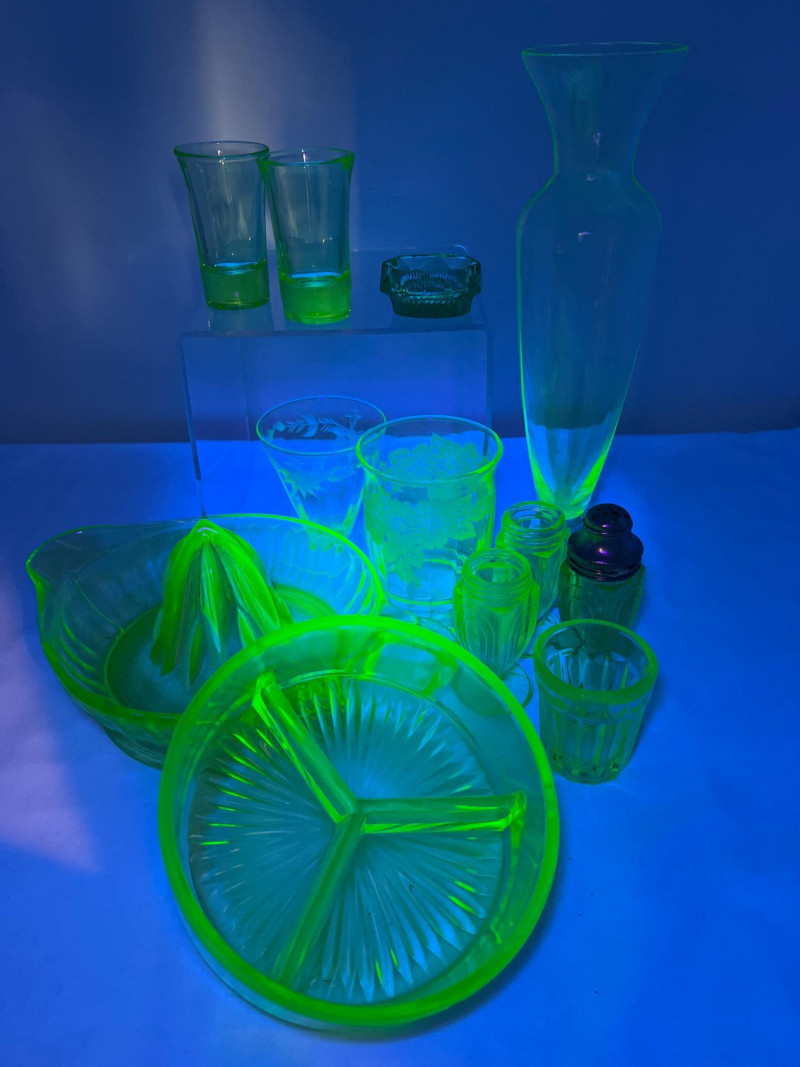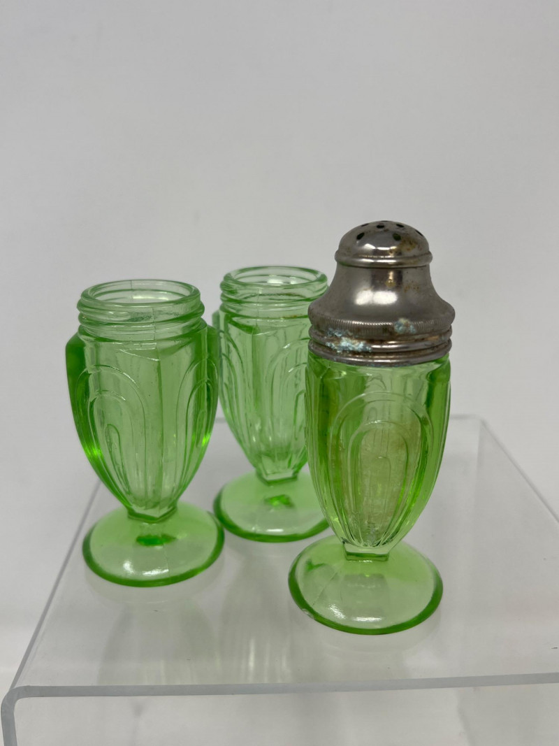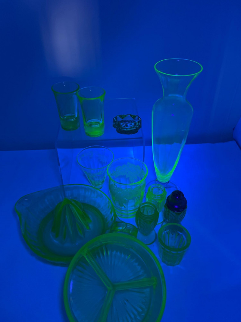 A mix of small green glass items including votives, figurines, and decorative accents. Each piece contributes to the overall glow and charm of the collection.