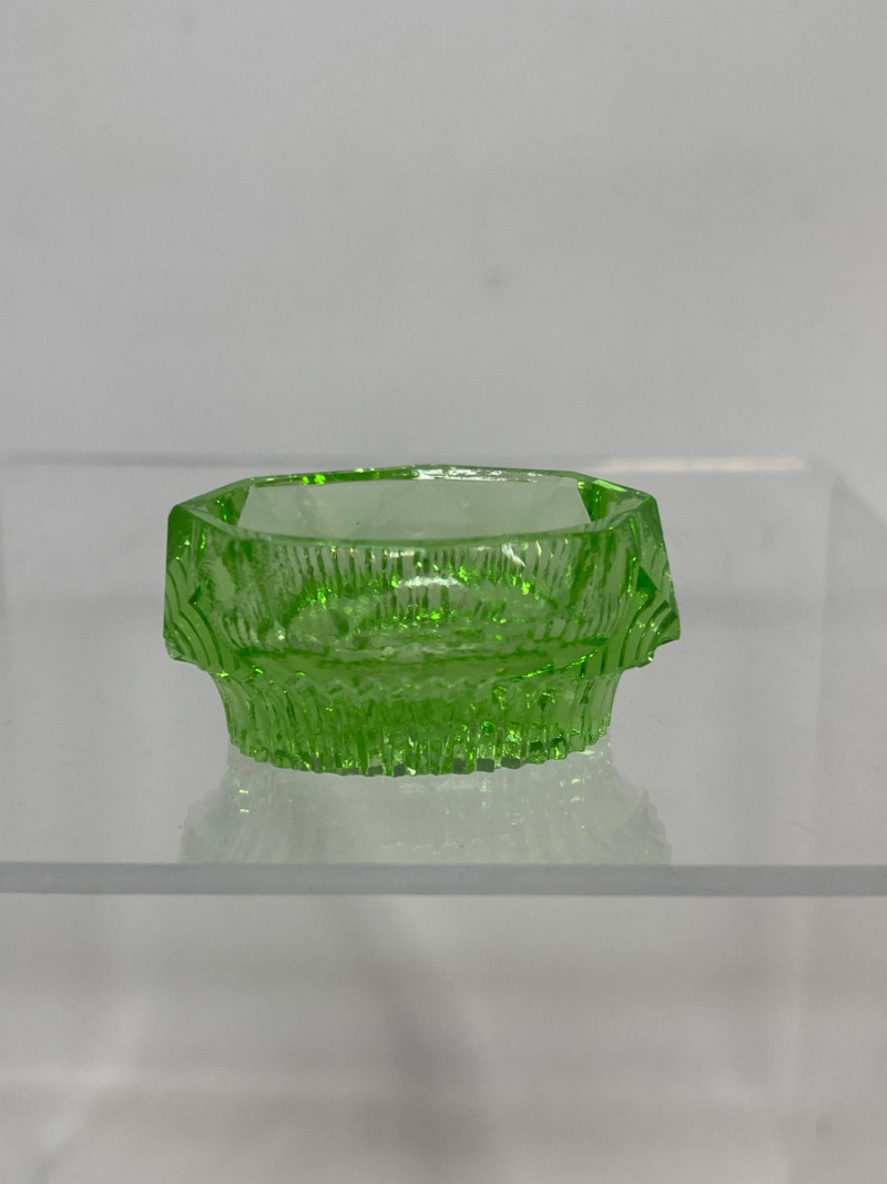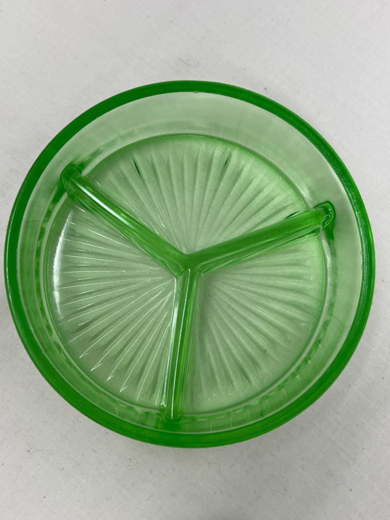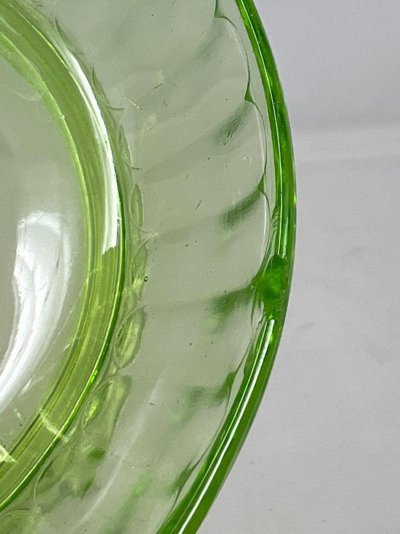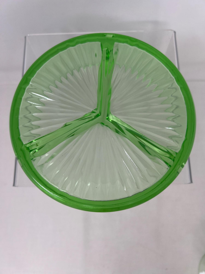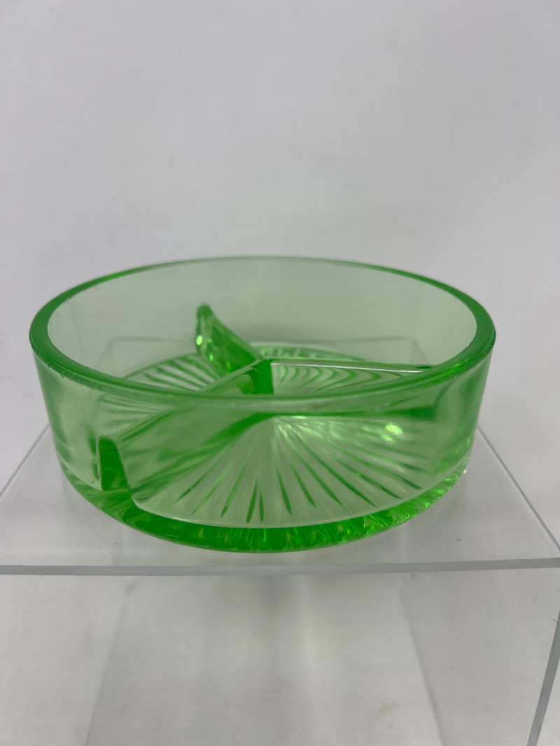 A substantial reamer-style juicer with classic ribbed bowl and spout, perfect for collectors of vintage kitchenware or functional glass. note: slight chip in rim (see picture) Green Trinket Dish – 5.35" Diameter