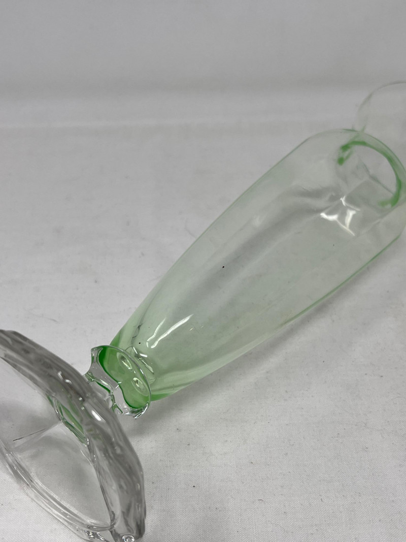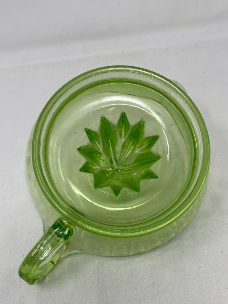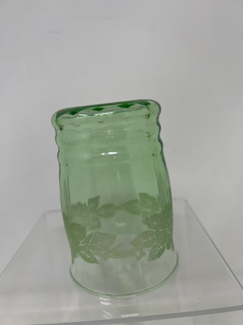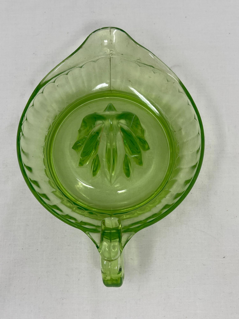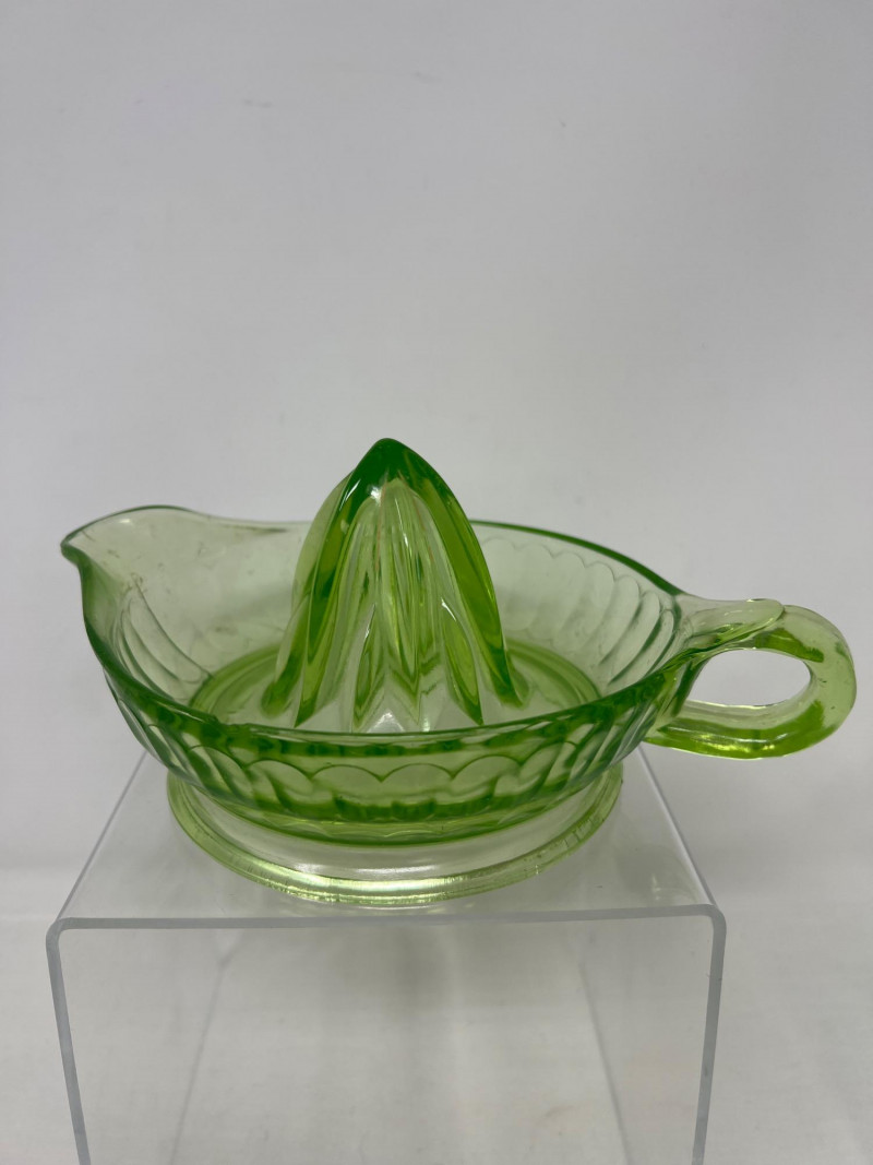 Tall and elegant with vertical paneling that catches the light, this vase evokes Depression-era styling and adds height to any display. Green Glass Juicer – 10" L x 9" W