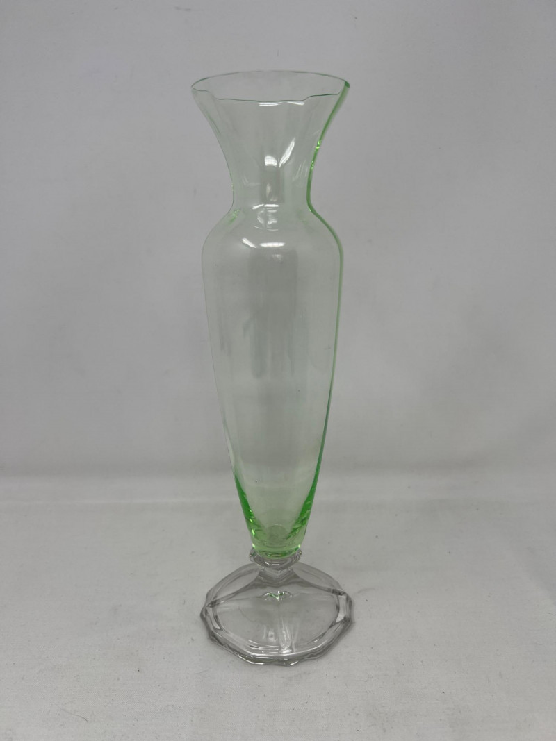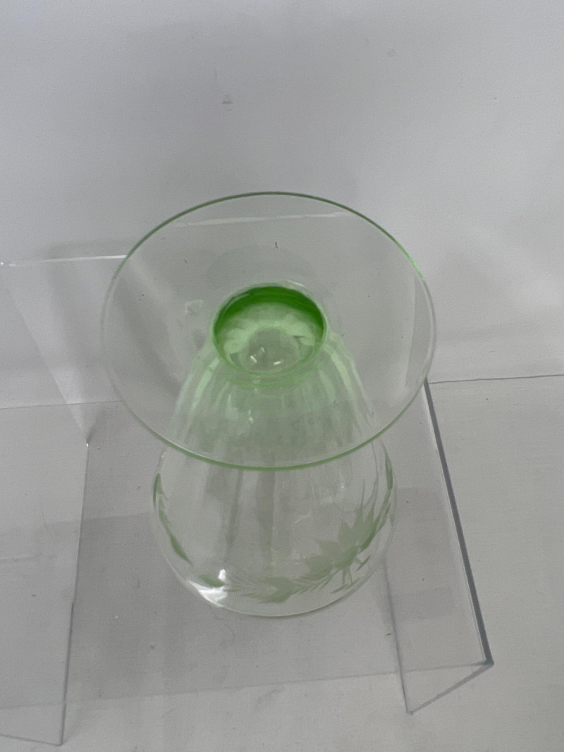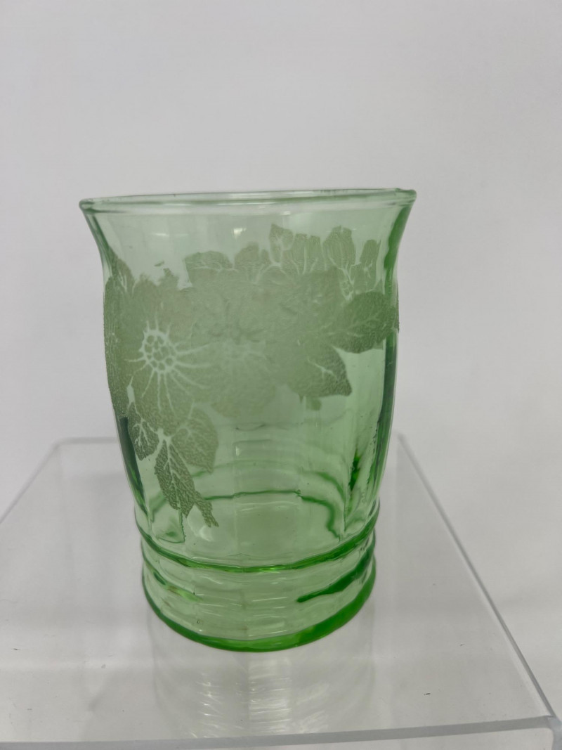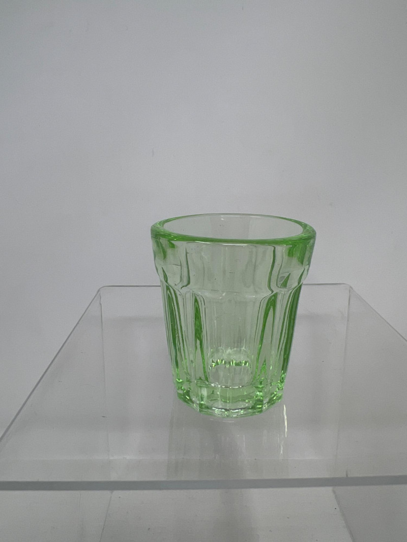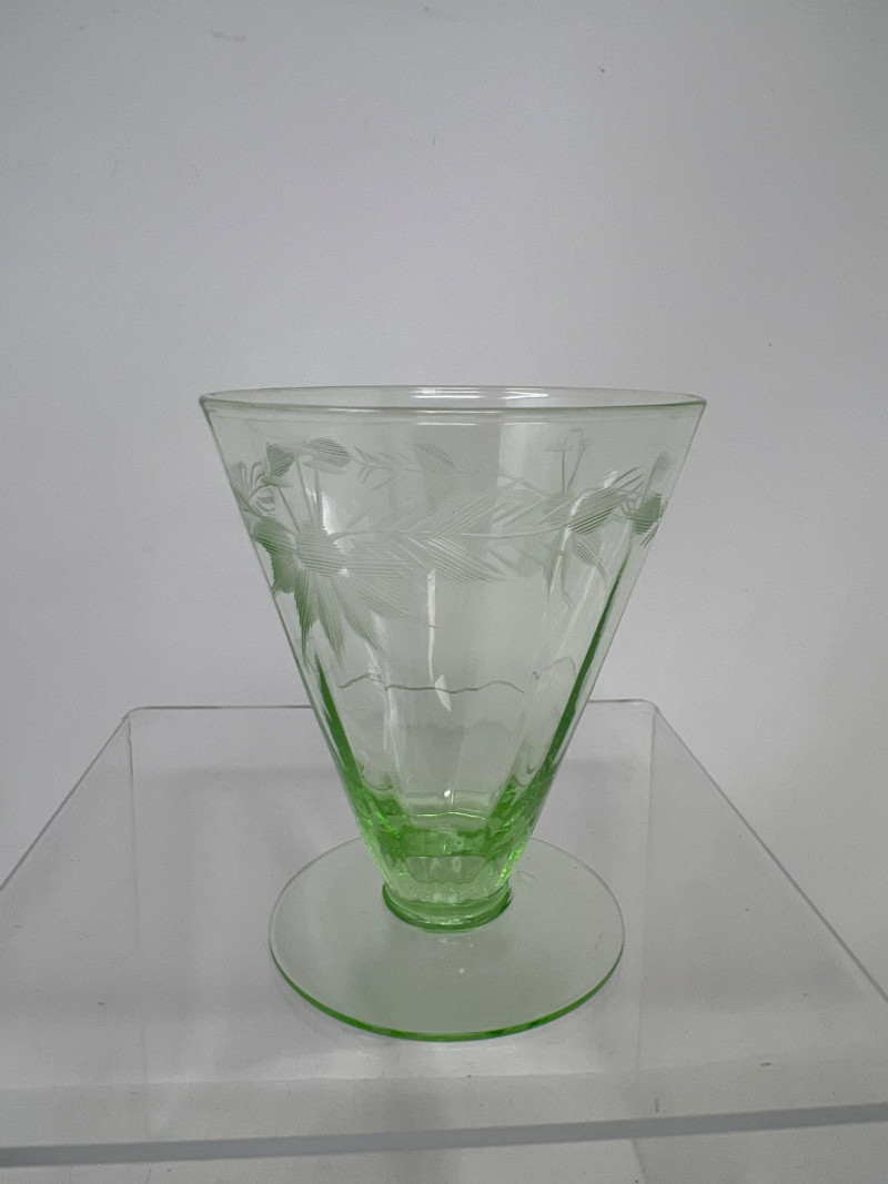 Tall and elegant with vertical paneling that catches the light, this vase evokes Depression-era styling and adds height to any display. Green Glass Juicer – 10" L x 9" W