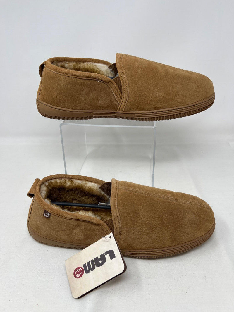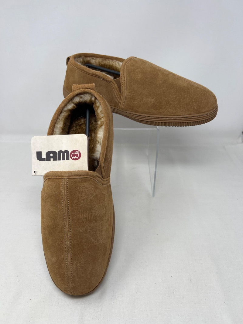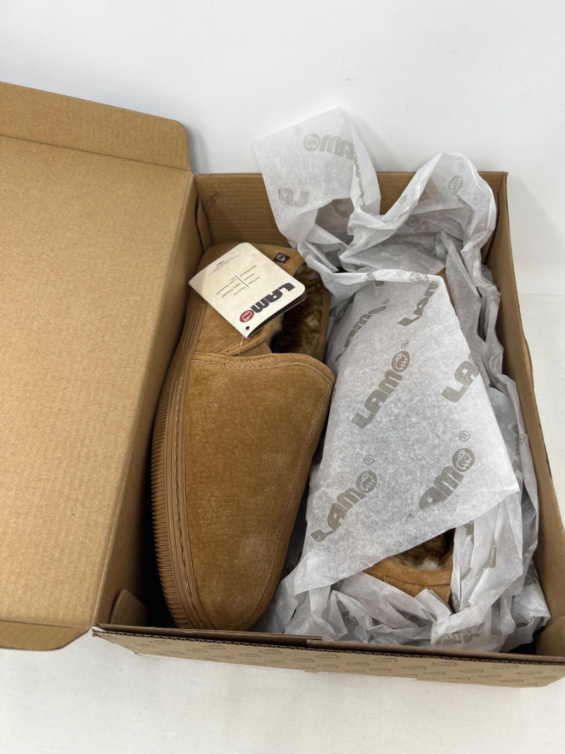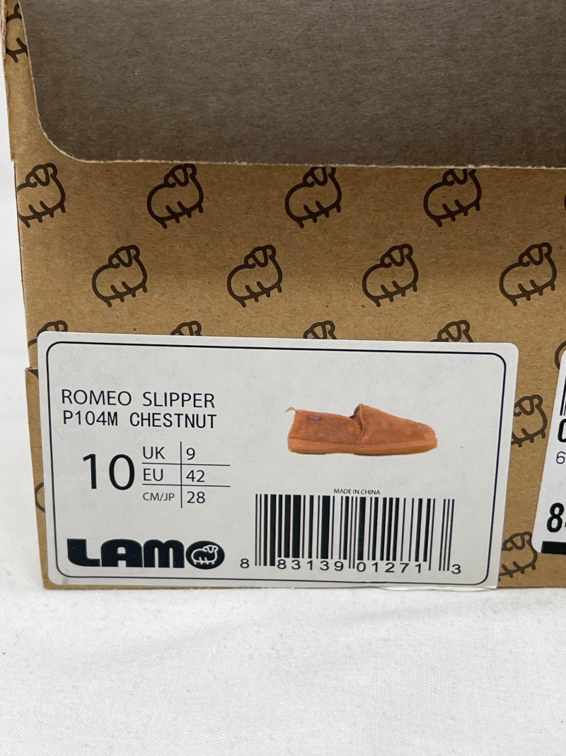 A brand-new pair of Lamo Romeo Slippers in rich chestnut suede, Men’s Size 10M, still in the original box. These classic slip-ons feature: Suede upper with stretch side panels for easy on/off Premium faux fur lining for cozy warmth Durable TPR outsole suitable for indoor and light outdoor wear Known for their comfort and timeless styling, Lamo Romeo slippers are a favorite for lounging, gifting, or upgrading your everyday downtime. This pair is unworn and ready to wrap.