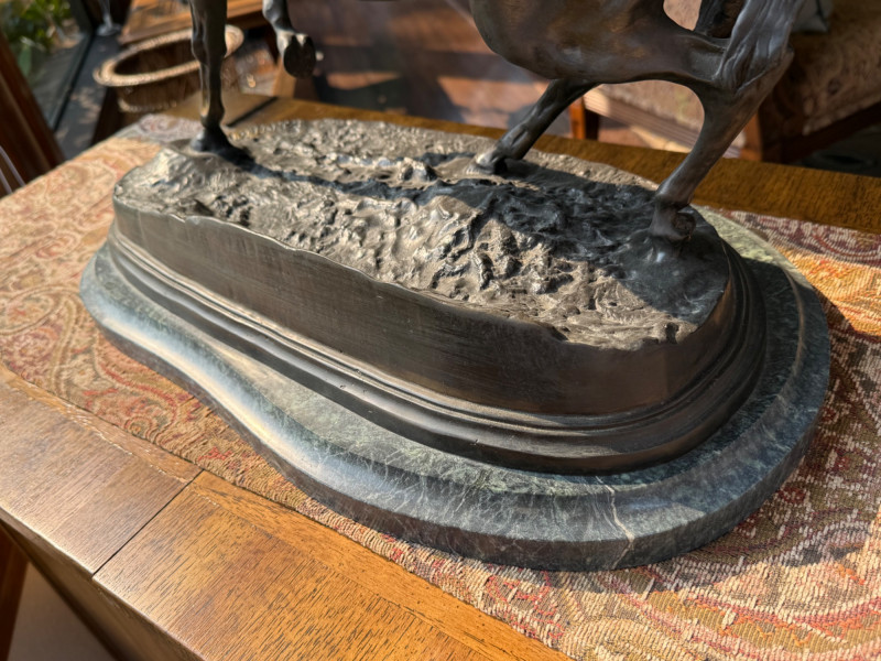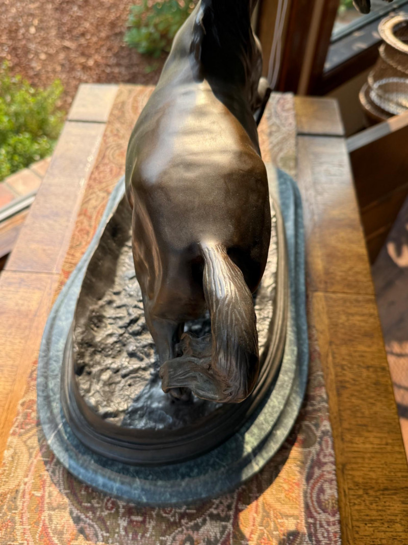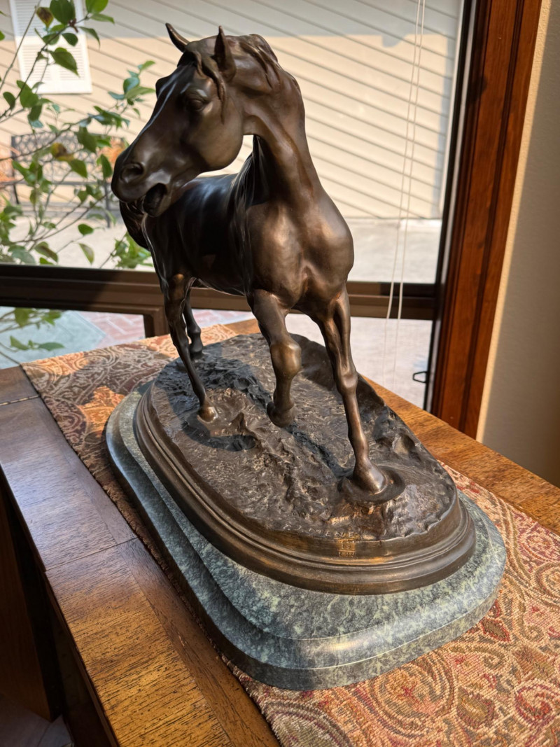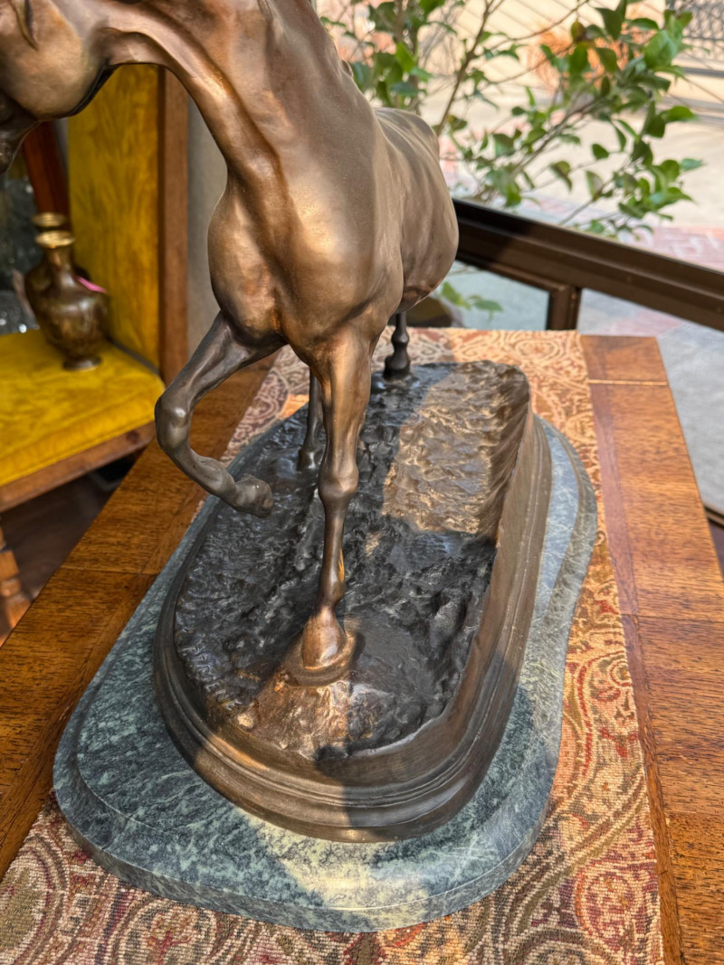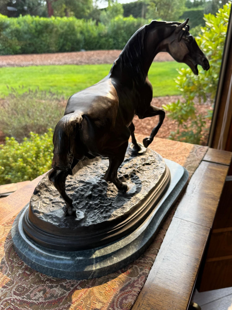 A finely cast bronze sculpture of an Arabian horse in motion, its head turned with lifelike tension, mounted on a tiered green marble plinth. The work is signed “P.J. MÊNE” in the cast, referencing the renowned 19th-century French sculptor Pierre-Jules Mêne, celebrated for his dynamic equestrian studies. Numbered 12/100, this piece is part of a limited-edition casting based on Mêne’s original model. The figure displays detailed musculature and a naturalistic stance, with a rich dark patina and textured ground. Pierre-Jules Mêne was a leading 19th-century French sculptor known for his lifelike animal bronzes, especially horses and hunting dogs. He pioneered detailed lost-wax casting and ran his own foundry in Paris, earning acclaim at the Salon and the Legion of Honour. His dynamic equestrian models remain highly collectible, with posthumous editions continuing his legacy.