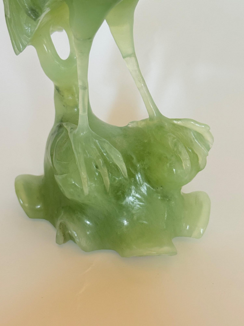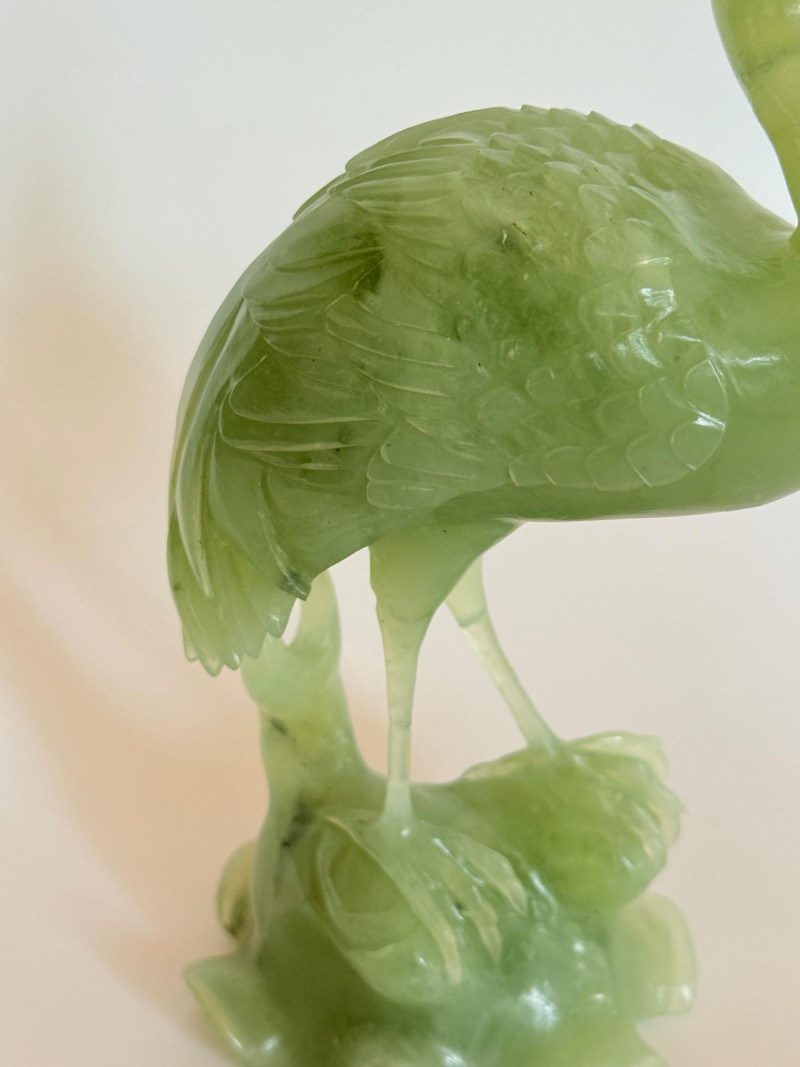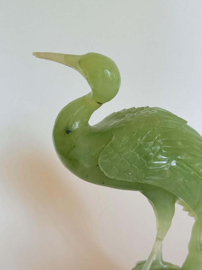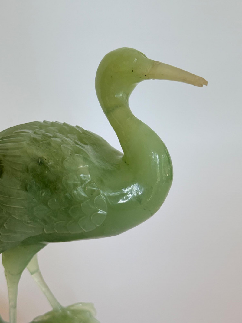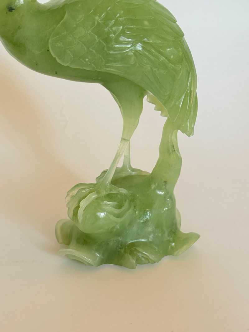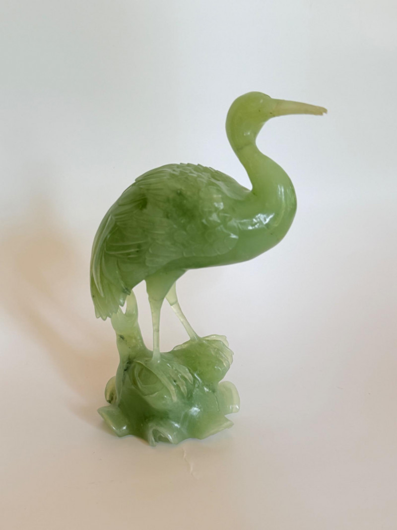 Carved Green Jade Crane Figurine A carved figurine in genuine green jade, depicting a crane—a revered symbol of longevity and good fortune in Asian art. The bird stands upright on a stylized base, with delicately incised feathers and wings that showcase skilled craftsmanship. The natural translucence and mottled green tones of the jade enhance its visual depth and elegance.