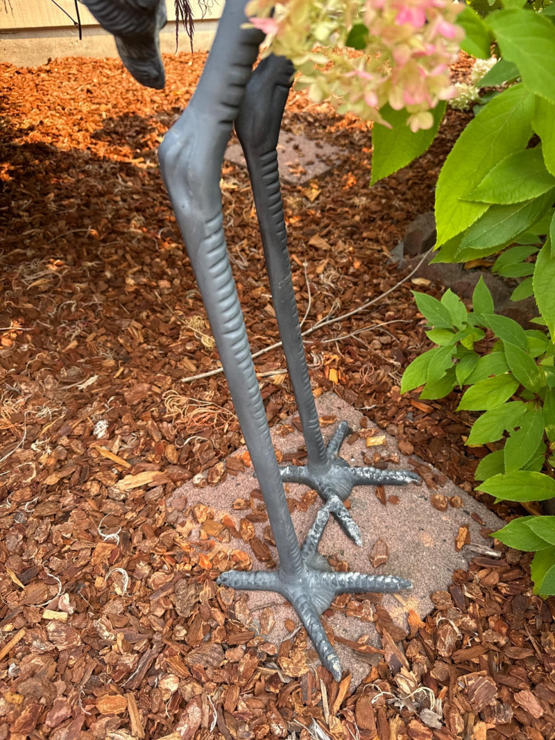 Pair of Outdoor Crane Sculptures Elevate your garden or patio with this elegant pair of outdoor crane sculptures, each rendered in cast metal with a dark, weather-resistant finish. Designed for open-air display, the set features two distinct poses: one crane stands tall with its head raised and beak open, while the other adopts a graceful curved-neck stance. Both figures are finely detailed with textured feathering and slender legs, mounted on integrated bases for added stability. While the exact metal type is undetermined, similar sculptures are commonly cast in aluminum or iron for durability and outdoor resilience. These pieces offer a striking decorative accent, ideal for landscaping, entryways, or water features. Height: 32–36 inchesDimensions (Approximate):
