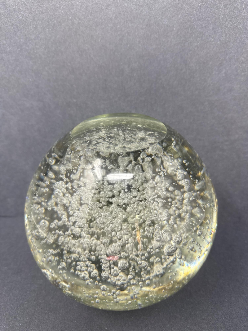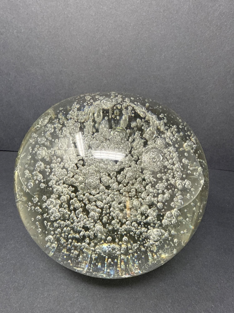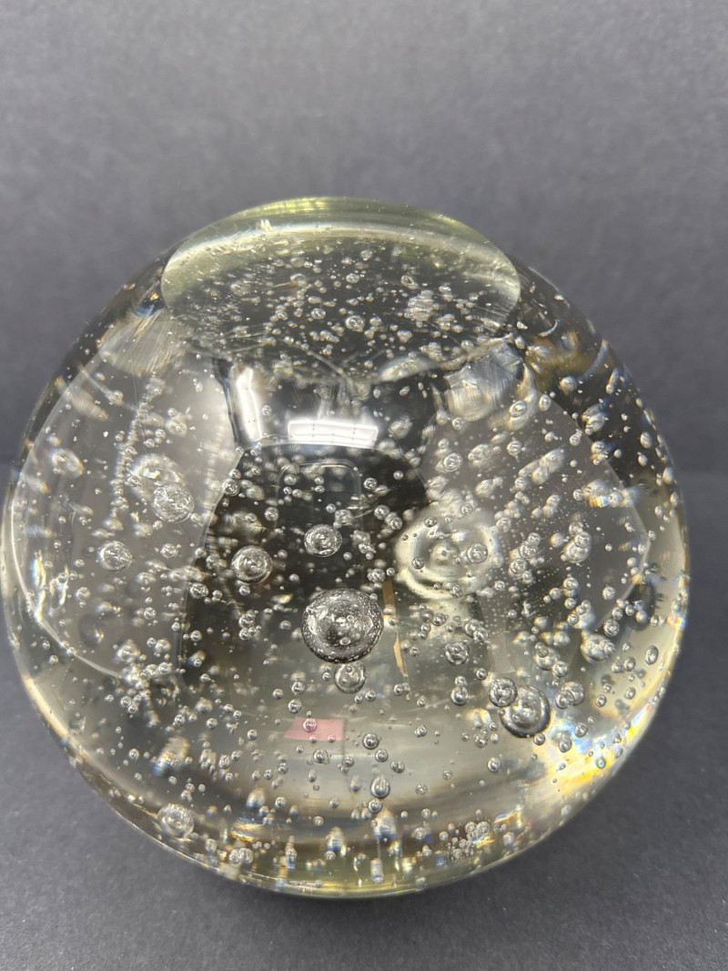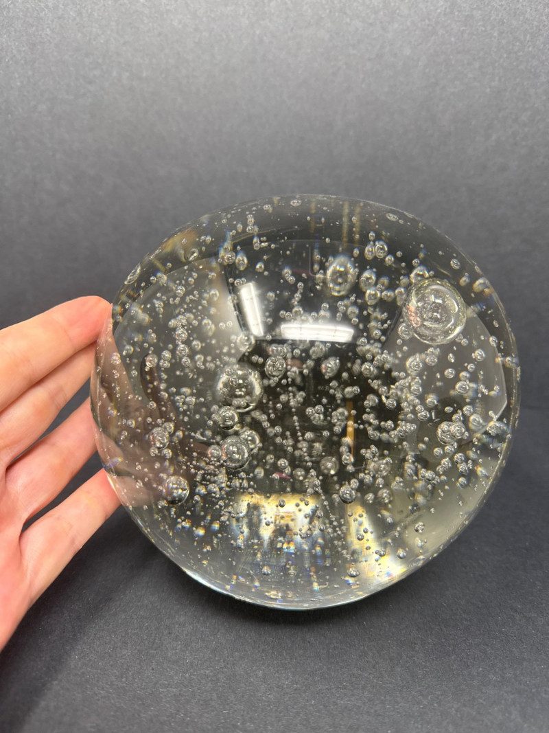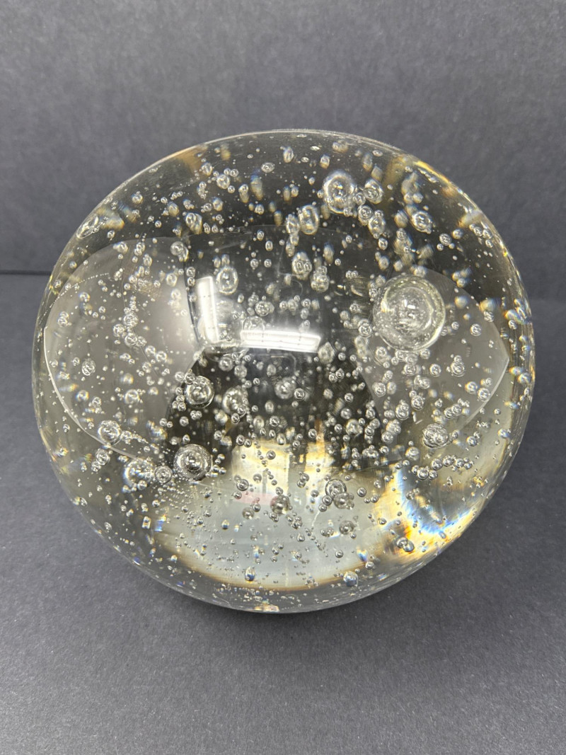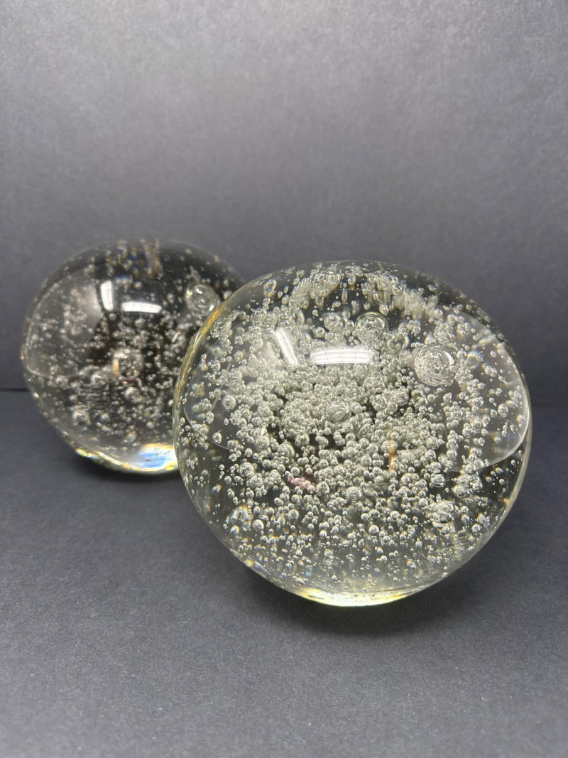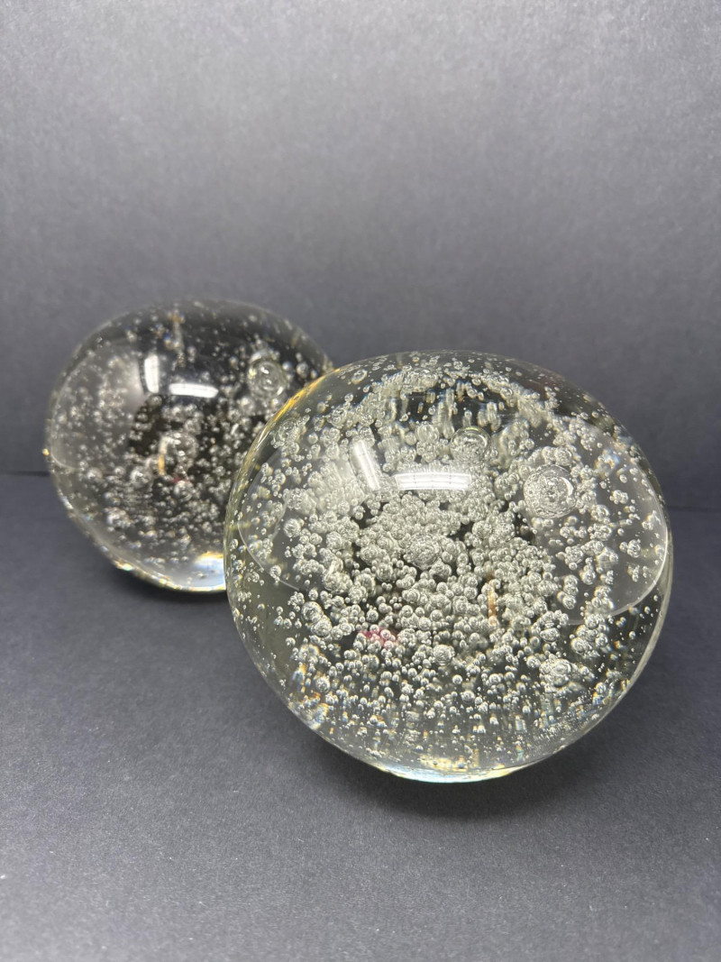 A matched pair of substantial solid glass spheres, each measuring approximately 5.5 inches in diameter, with a smooth, polished surface and a constellation of suspended air bubbles. Their minimalist form and generous scale lend a sculptural presence—ideal for desktop display, shelf styling, or use as functional weights in a studio or office. Unsigned, but rich in optical refraction and visual intrigue. Material: Solid clear glass Condition: Excellent; no chips or cracks noted