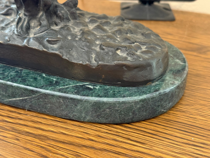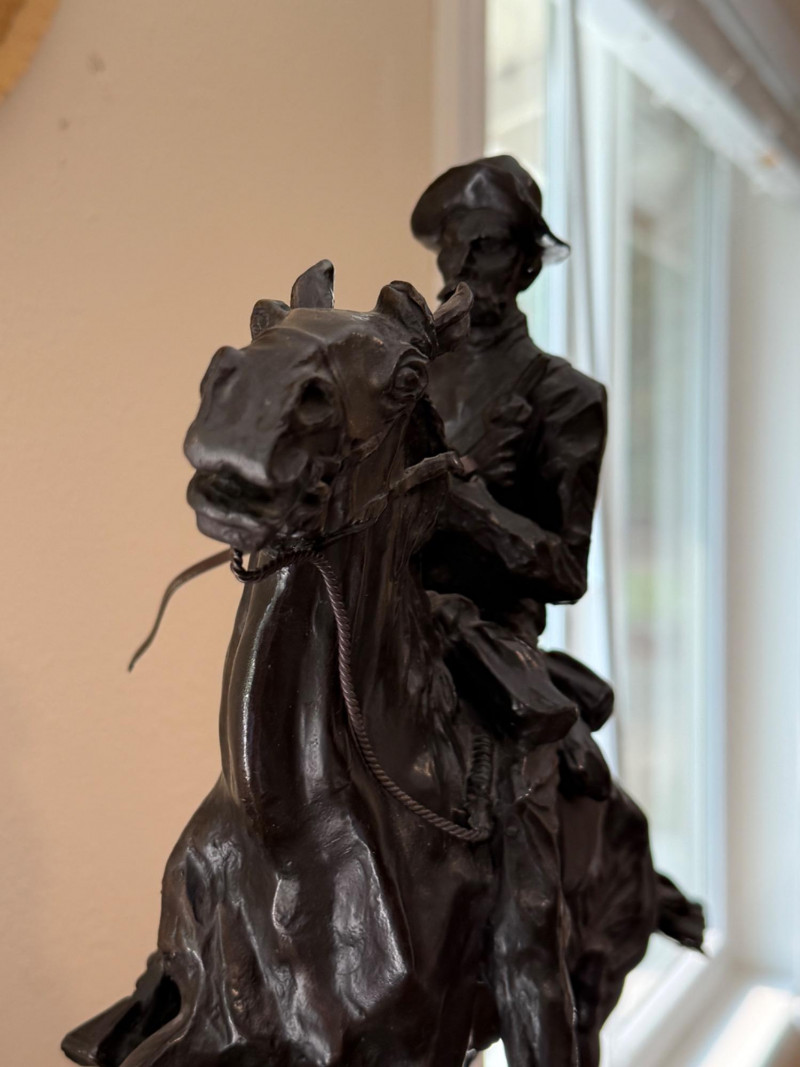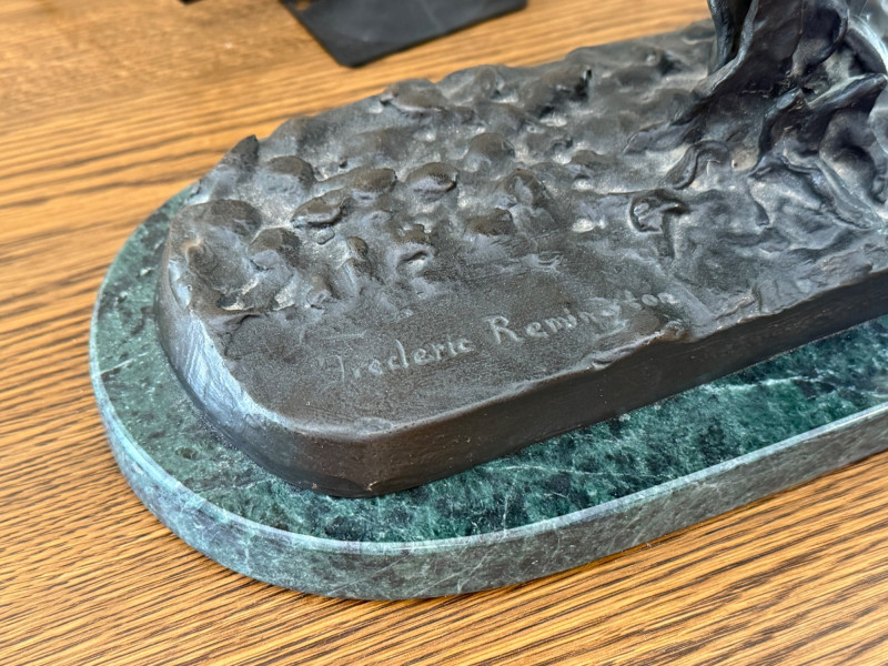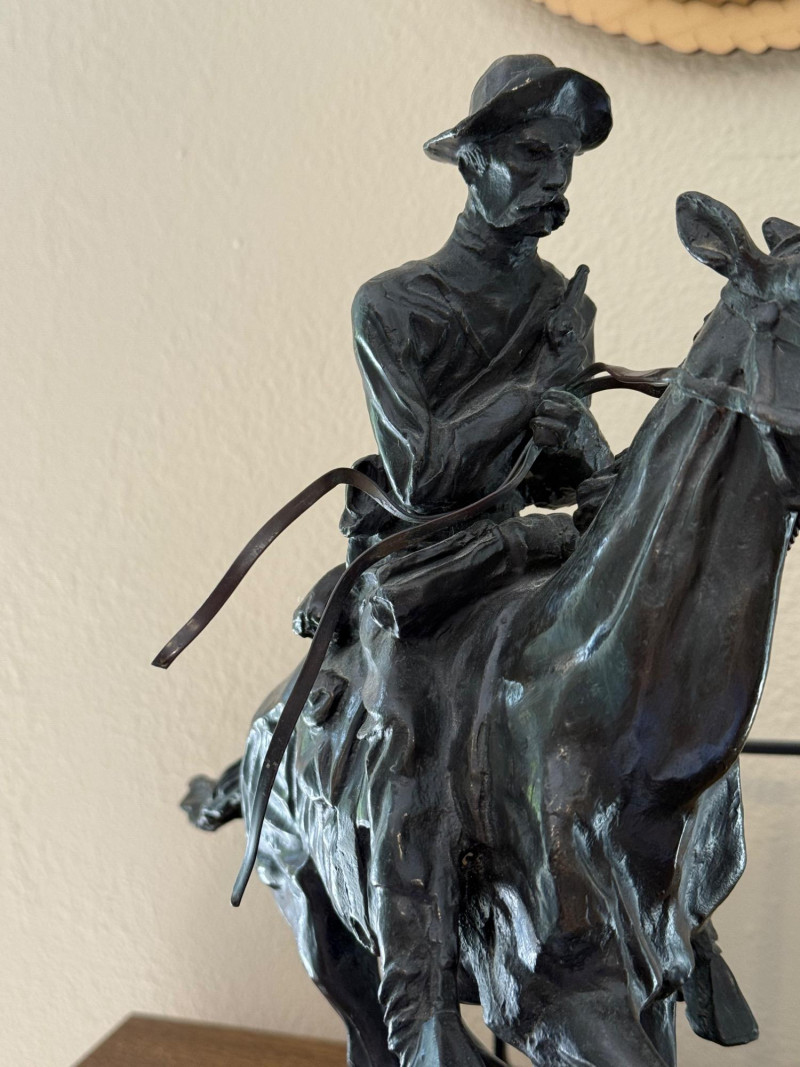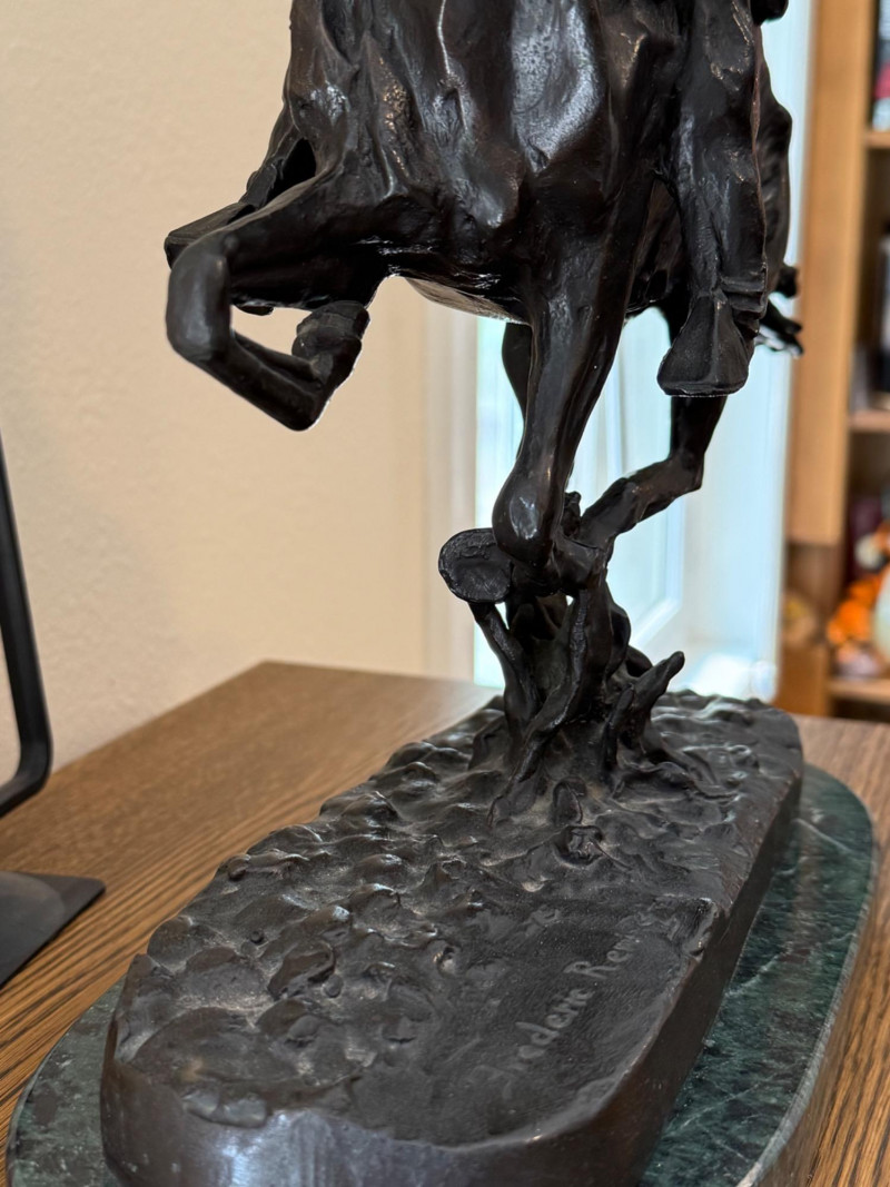 Frederic Sackrider Remington was a pioneering American artist renowned for his vivid portrayals of the Old West. Active in the late 19th and early 20th centuries, he worked across painting, illustration, and sculpture, capturing cowboys, cavalrymen, and Native American life with striking realism and motion. His bronze works, including The Broncho Buster, helped define Western American art and remain iconic representations of frontier spirit. Dimensions: 14.5" W × 14" H Condition Notes: No visible cracks or repairs Patina consistent with age Estimate: $350–$500