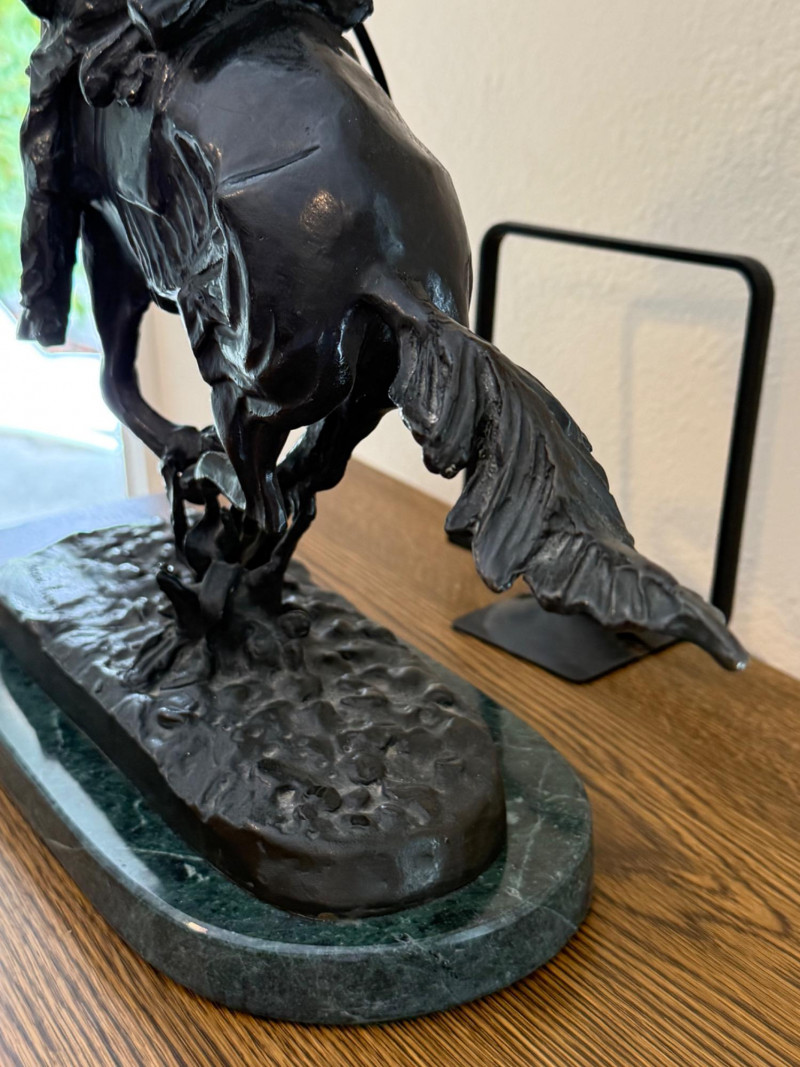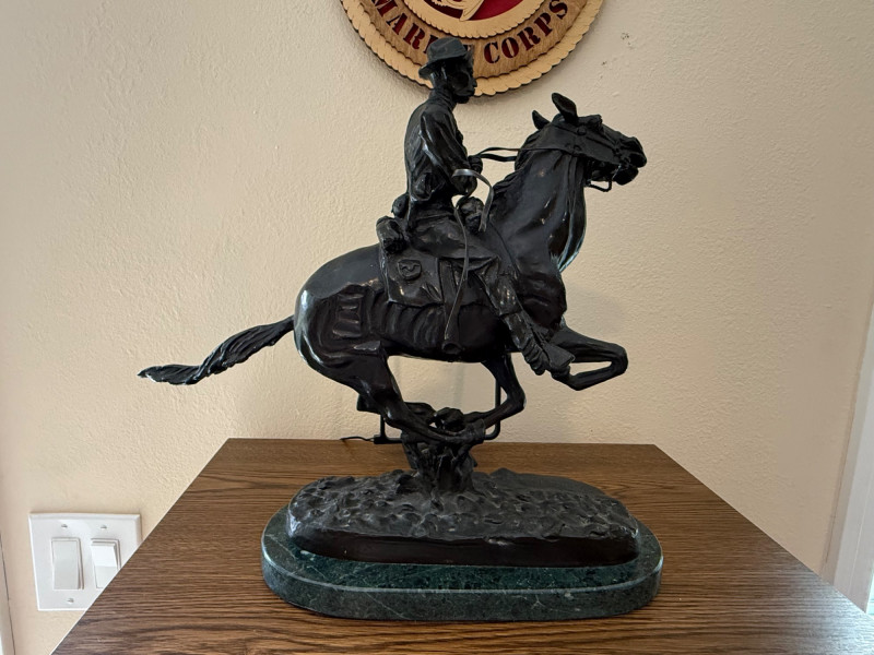 A dynamic bronze sculpture titled Trooper of the Plains, capturing a cavalry rider in full uniform astride a galloping horse. The rider grips the reins with determined posture as the horse surges forward, tail extended in motion. Mounted on a polished green marble base, the piece bears Remington’s inscribed signature. This is a later reproduction honoring Remington’s celebrated depictions of frontier life and military subjects. It reflects the artist’s hallmark style—muscular movement, narrative realism, and reverence for the American West. About the Maker: