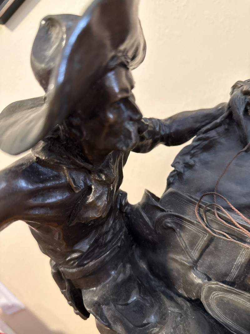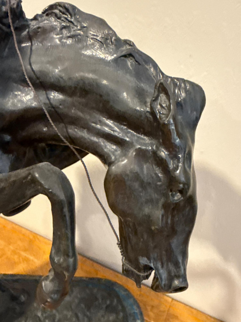 This commanding bronze captures the raw tension of man versus beast—an homage to Frederic Remington’s iconic 1895 “Broncho Buster.” A lone cowboy clings to the reins as his horse rears violently beneath him, frozen mid-buck in a moment of pure frontier grit. Every detail—from the taut muscles of the horse to the rider’s determined posture—is sculpted with reverence to Remington’s vision. Mounted on a polished green marble base, the piece radiates motion, drama, and Western authenticity. Cast signature: “Frederic Remington” on base Later reproduction of Remington’s original 1895 model Rich patina with expressive surface texture About the Maker: