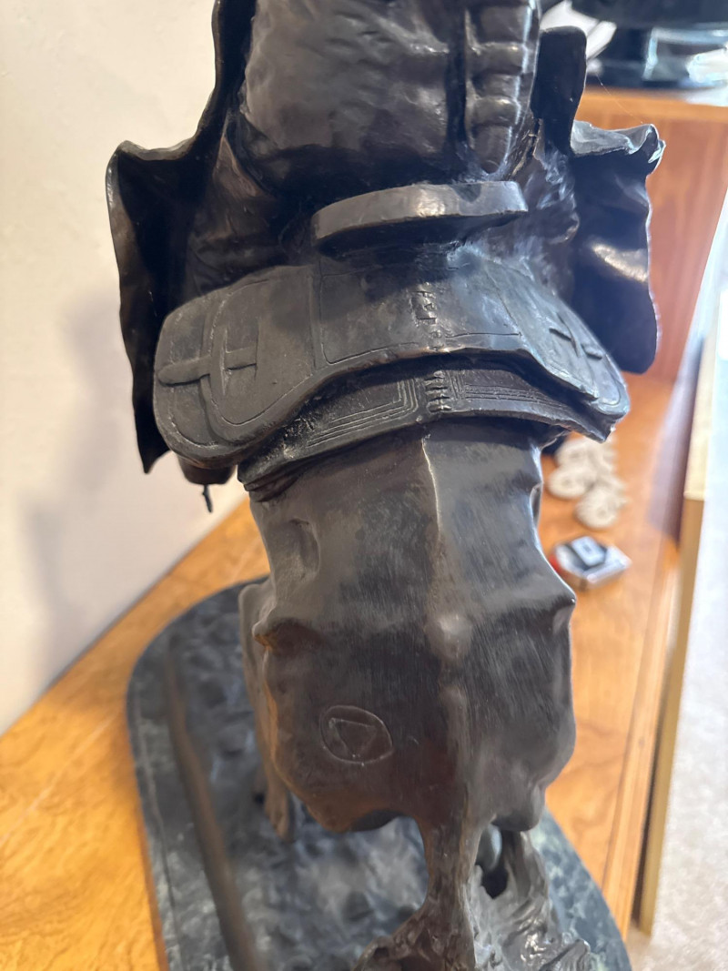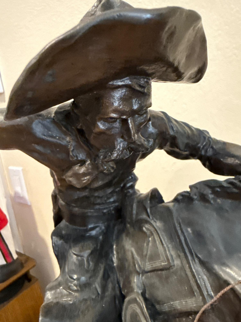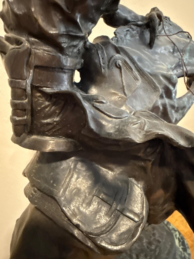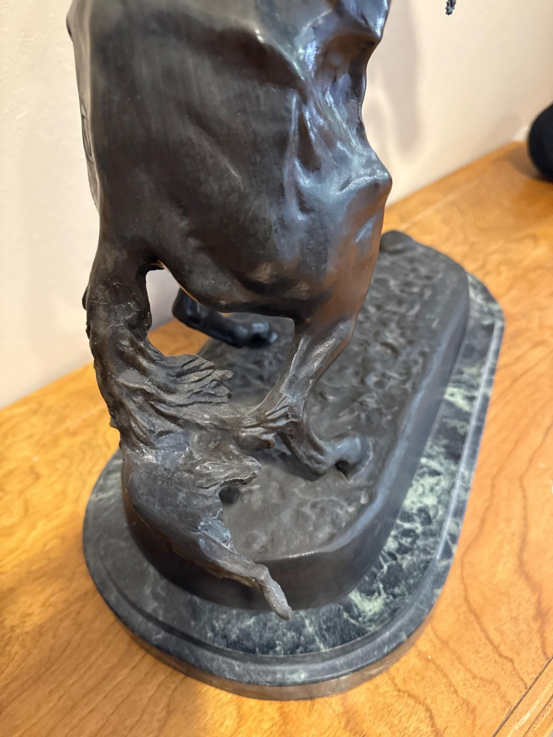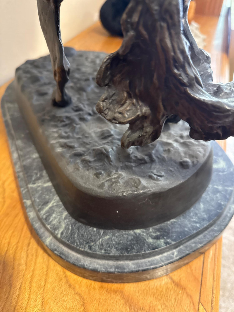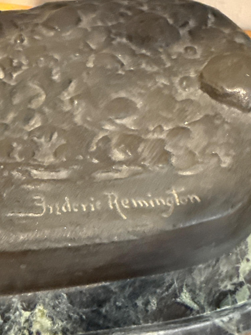 Frederic Remington (1861–1909) was a celebrated American artist, sculptor, and illustrator renowned for his vivid portrayals of the Old West. His work immortalized cowboys, Native Americans, and cavalrymen in moments of action and tension. “The Broncho Buster,” first cast in 1895, was Remington’s debut sculpture and remains one of the most iconic representations of Western art. His mastery of motion and anatomy helped redefine American sculpture, blending realism with narrative drama. Dimensions: Statue: Approx. 24 in tall × 20 in wide Marble base: Approx. 17.5 in × 10 in Materials: Cast bronze Green marble base Attribution: Reproduction casting; not an original Remington edition Decorative and commemorative piece bearing cast signature