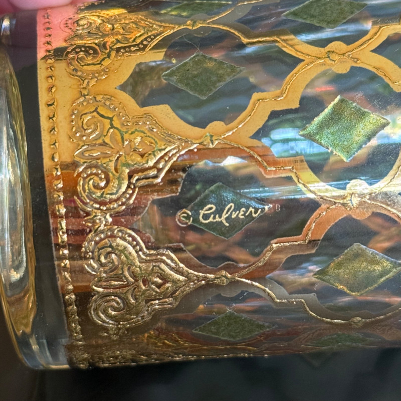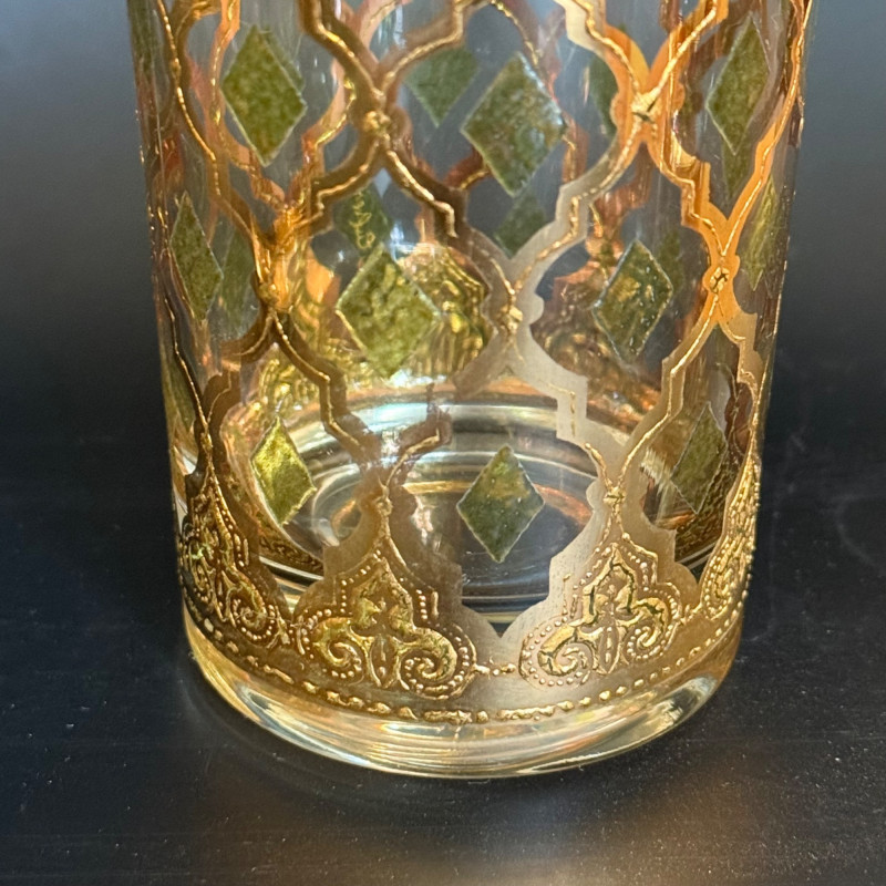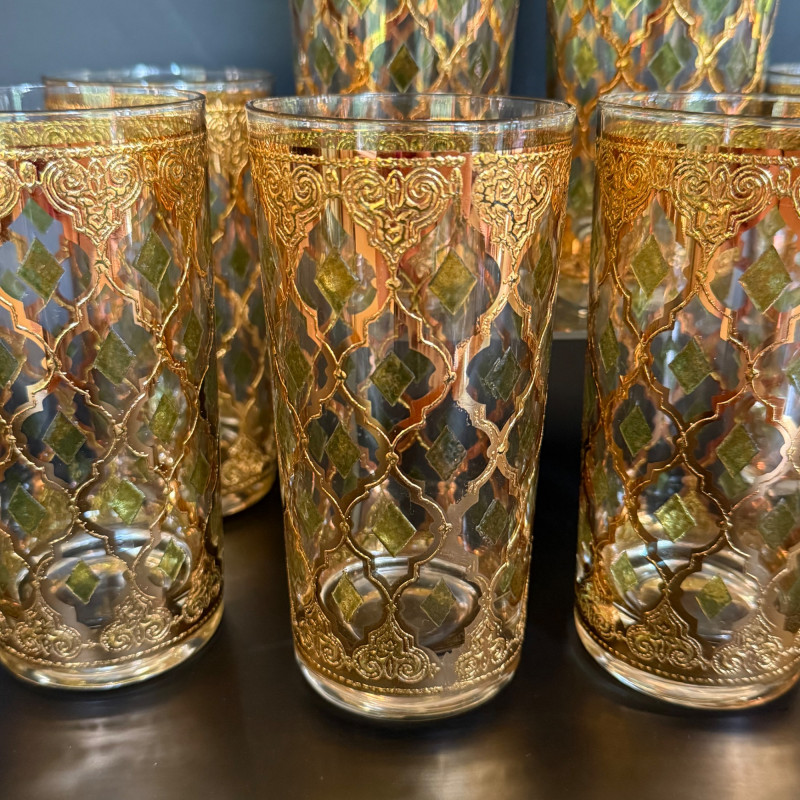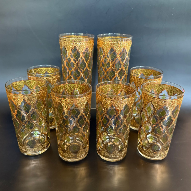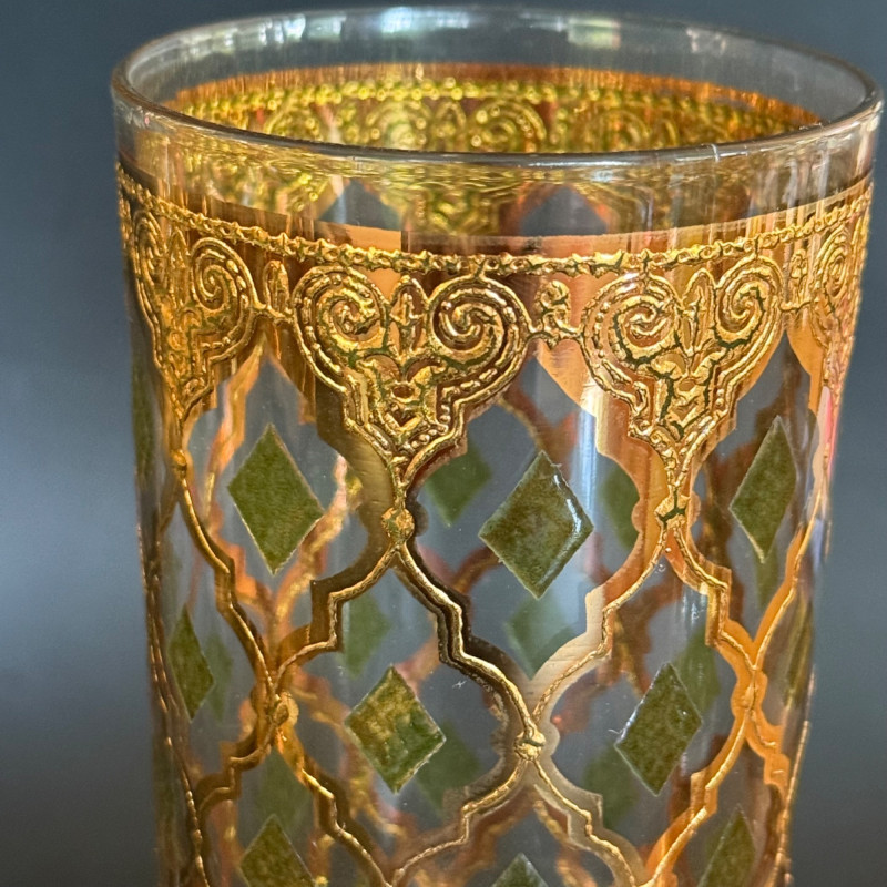 An elegant vintage set of eight highball glasses from Culver Ltd., showcasing the iconic “Valencia” pattern. Each glass features a raised trellis lattice design in 22-karat gold, accented with rich green diamond motifs. The textured overlay reflects the glamour and Hollywood Regency style that defined Culver’s mid-century aesthetic. Founded in Brooklyn, New York, Culver Ltd. gained prominence in the 1950s and ’60s for its lavish glassware designs, often incorporating real gold and intricate detailing. The brand became synonymous with cocktail culture and luxury entertaining, making its pieces highly sought after by collectors and vintage enthusiasts alike. Each glass bears the “Culver” signature within the pattern, affirming authenticity and craftsmanship. With their tall cylindrical form, these glasses are ideal for serving cocktails or highballs, and equally suited for display in a vintage barware collection. Maker: Culver Ltd.
