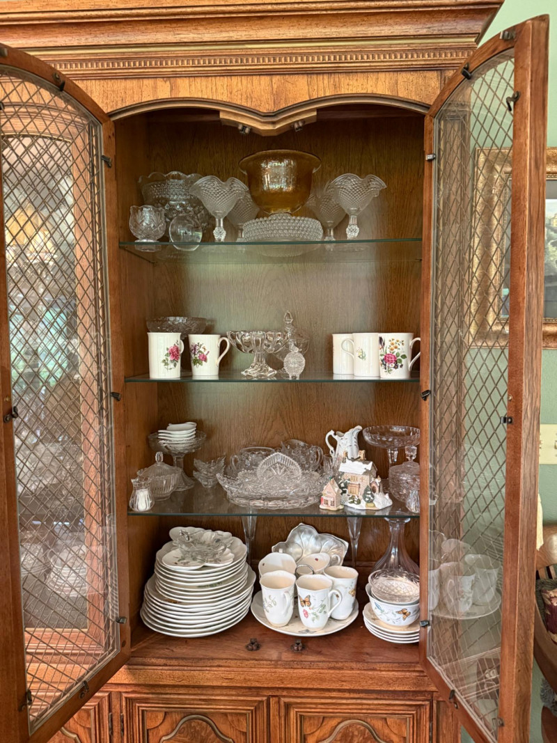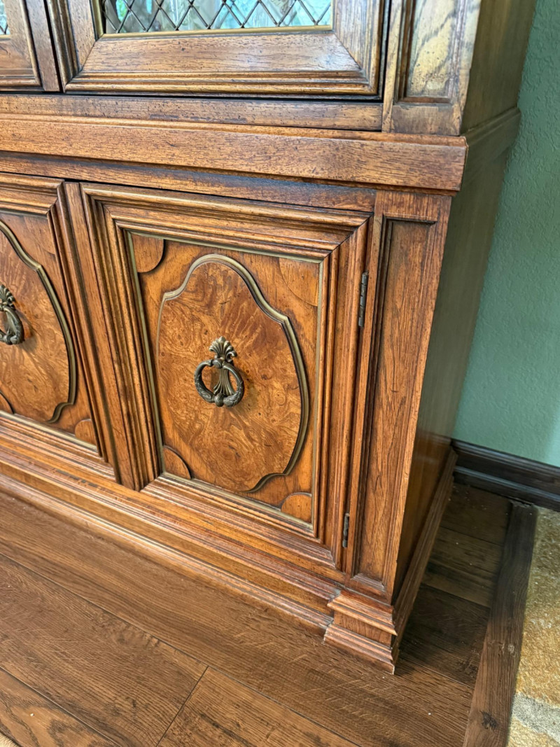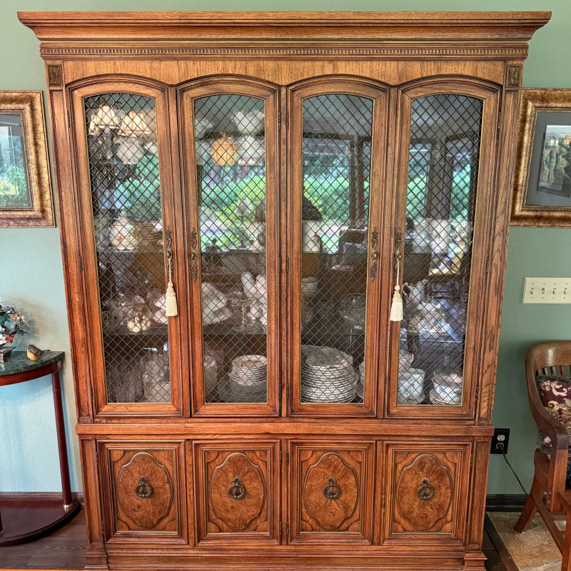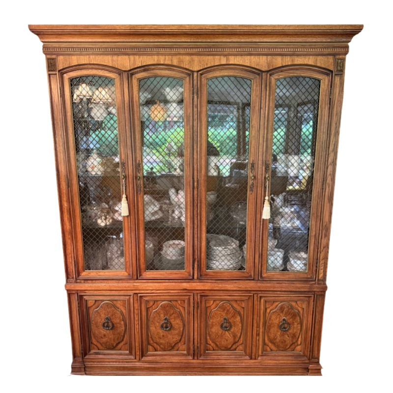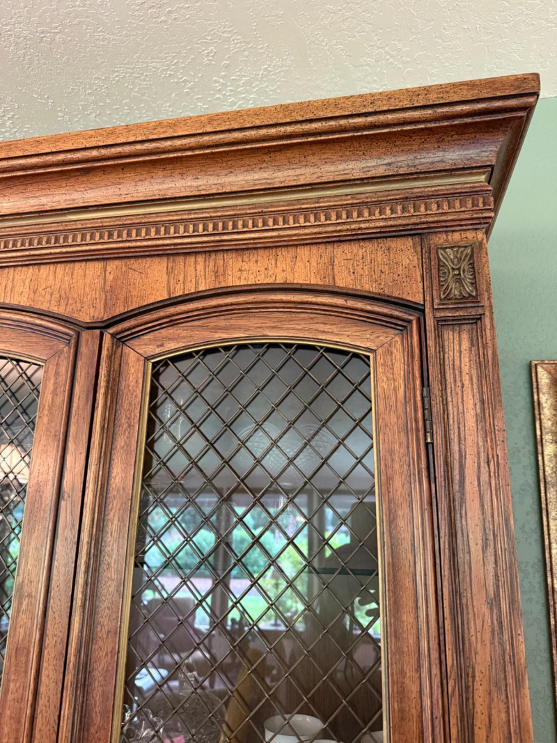 A traditional solid wood china cabinet featuring elegant craftsmanship, including crown molding, arched door frames, and carved decorative accents. The upper display section comprises four tall doors with diamond-pattern wire mesh layered over glass panes, opening to glass interior shelving ideal for showcasing china, crystal, or collectibles. The lower section includes four paneled doors with ornate brass ring pulls, offering enclosed storage for dinnerware or household items. Construction: Solid wood Upper Section: Four wire mesh glass doors with glass interior shelving Lower Section: Four paneled doors with brass ring pull hardware Style: Traditional; includes arched door frames and carved details Notes: Contents not included Handling Note:
