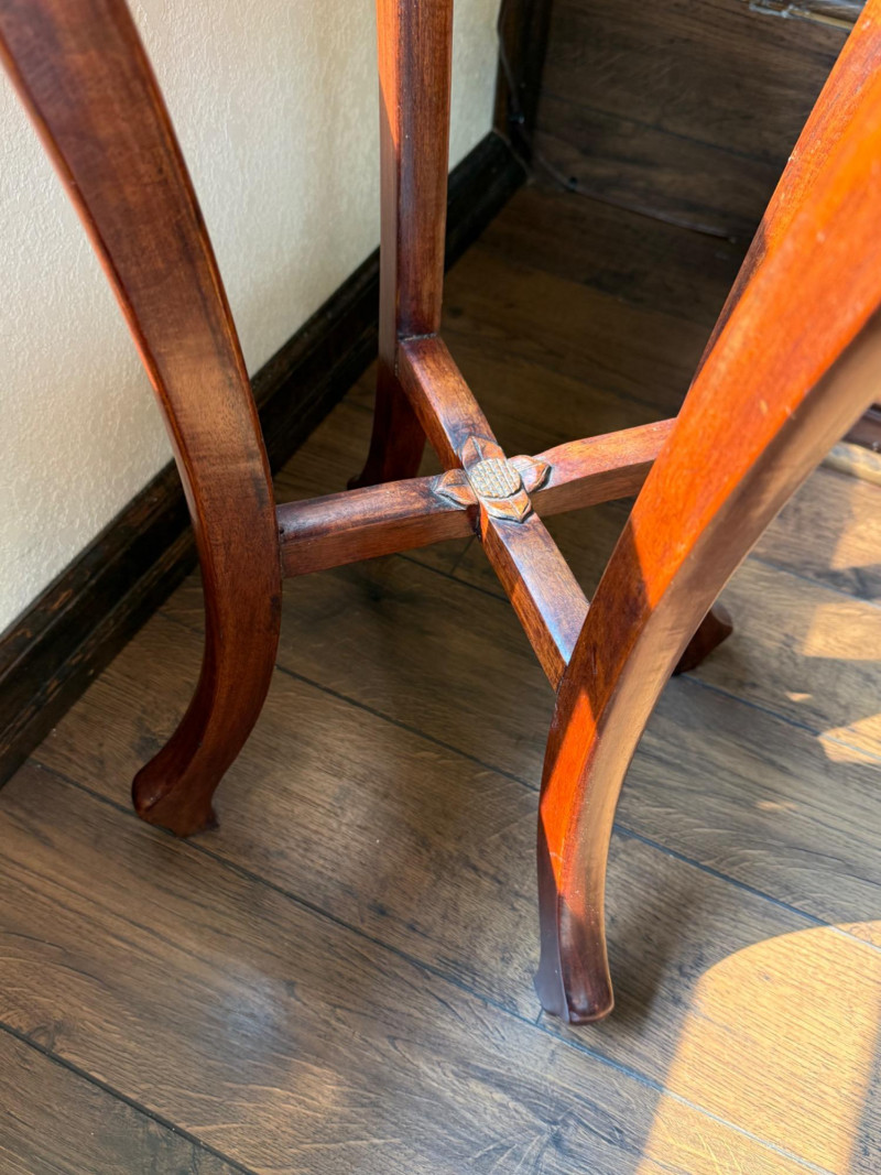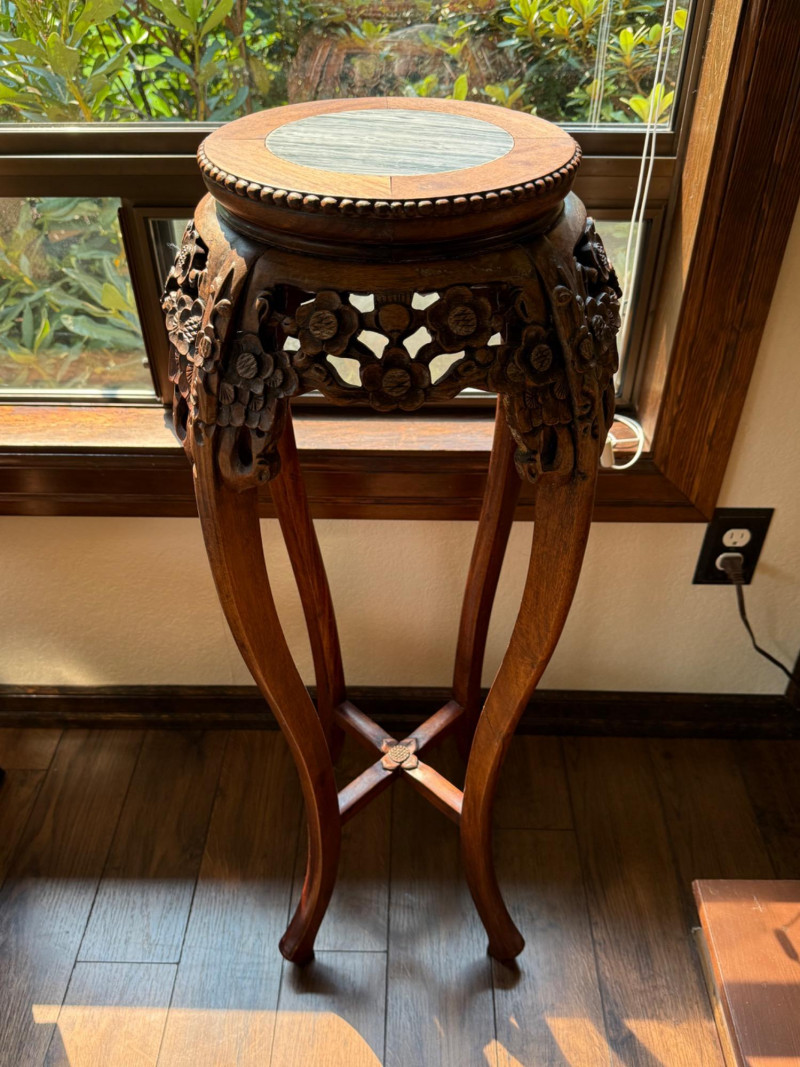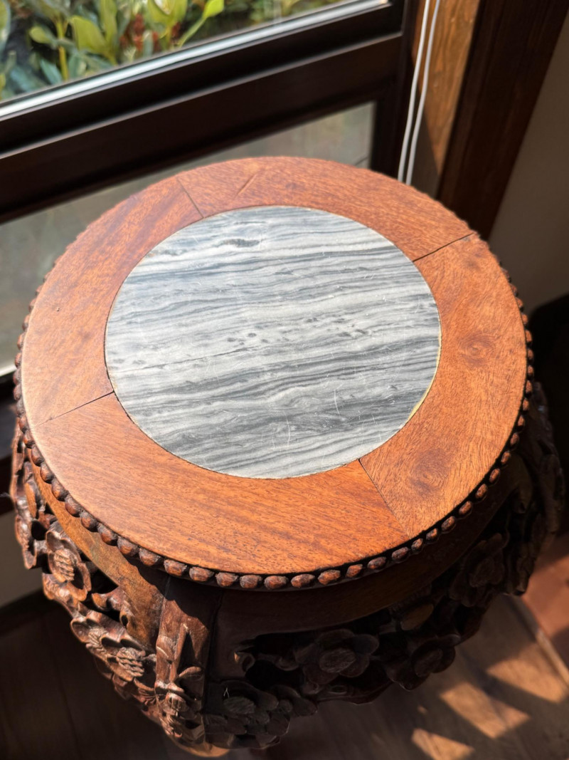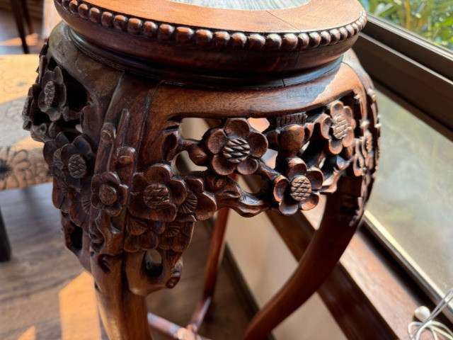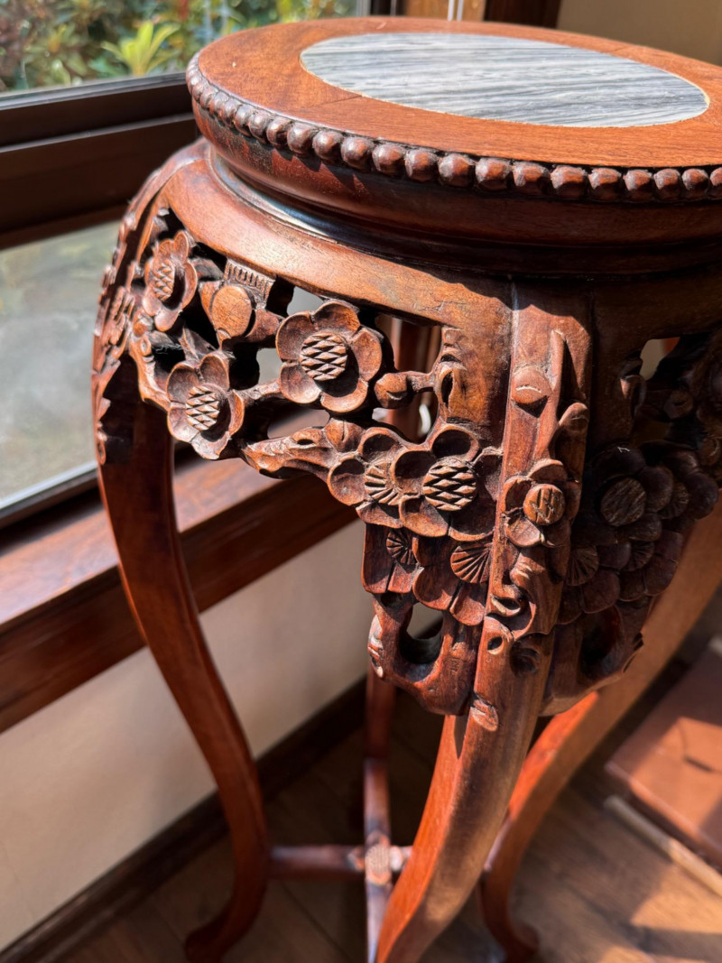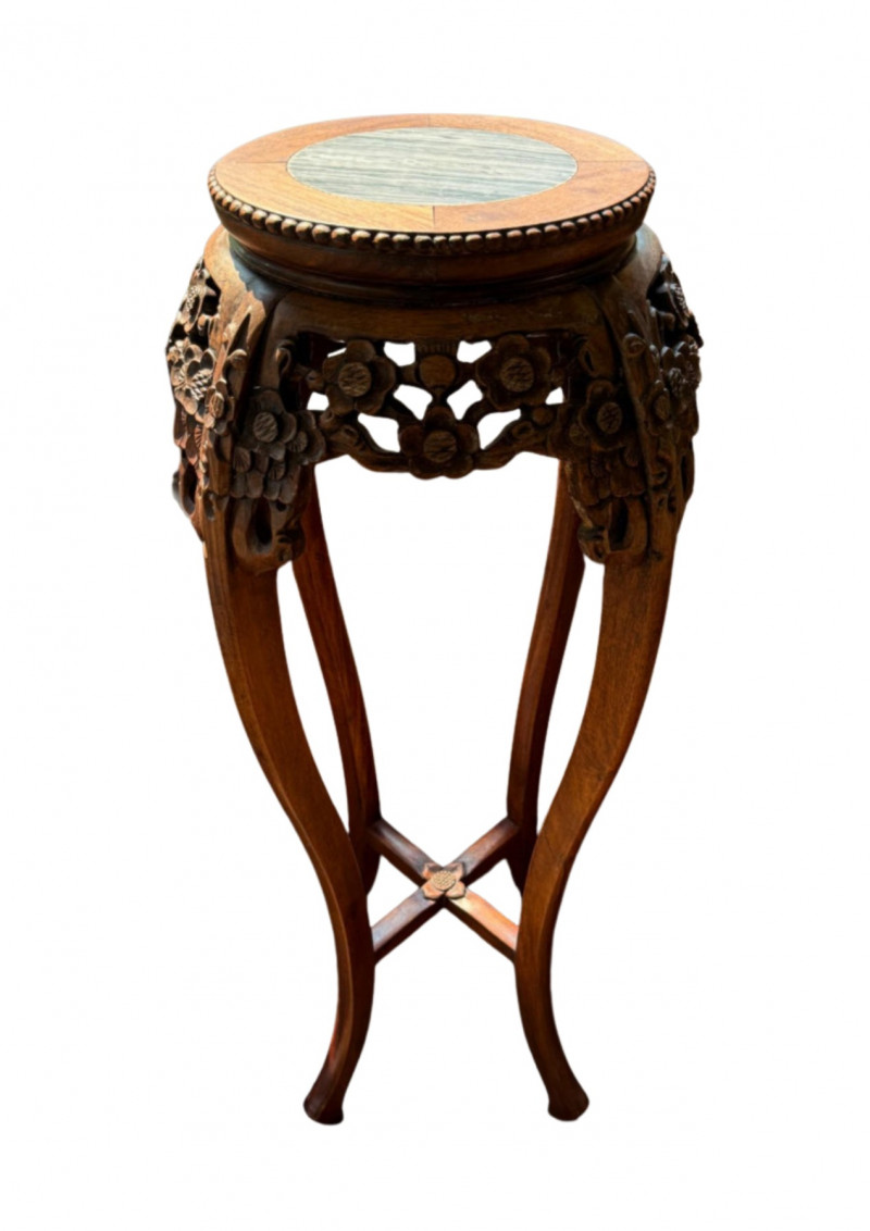 Vintage Chinese Carved Wood Plant Stand with Marble Top A carved hardwood plant stand featuring a circular top inset with a gray-and-white marble panel. The apron is rendered in openwork plum blossom motifs—symbolizing endurance and renewal in Asian decorative arts. Raised on four cabriole legs joined by a cross-stretcher for stability, the stand reflects the craftsmanship of late Qing Dynasty Chinese export furniture, circa 1880–1920. Suitable for displaying porcelain, sculpture, or botanical arrangements, this piece blends elegance with symbolic depth. Estimated Era: Late 19th to early 20th century