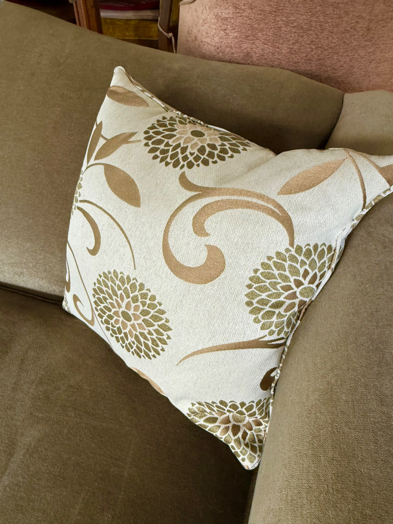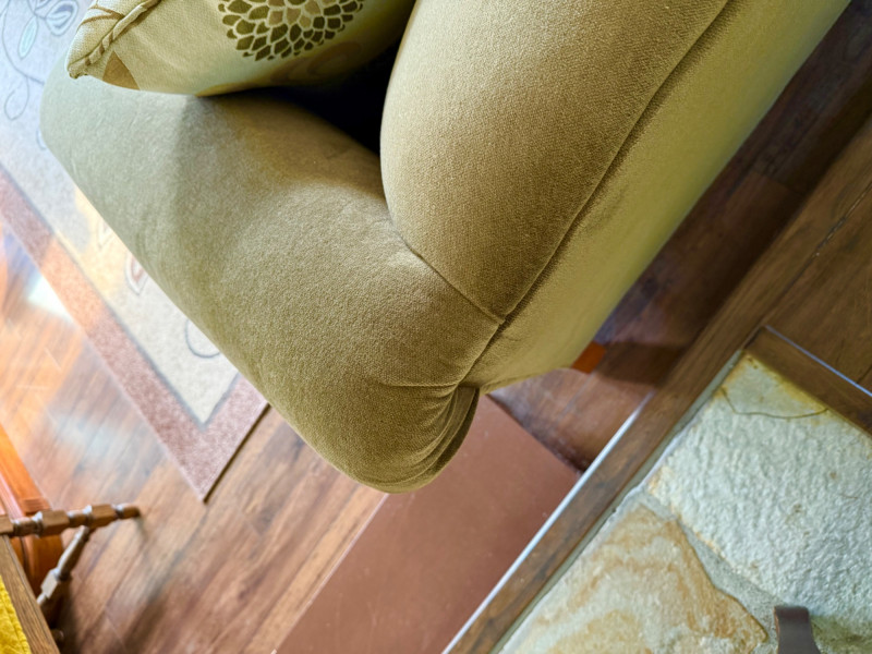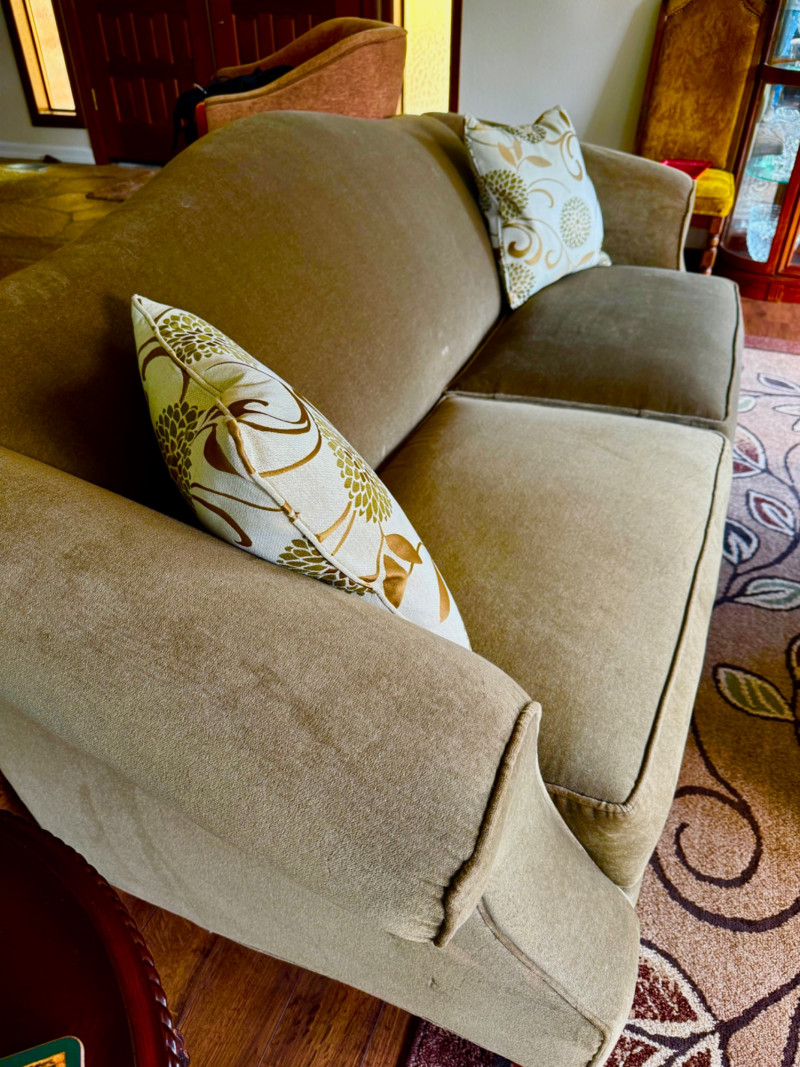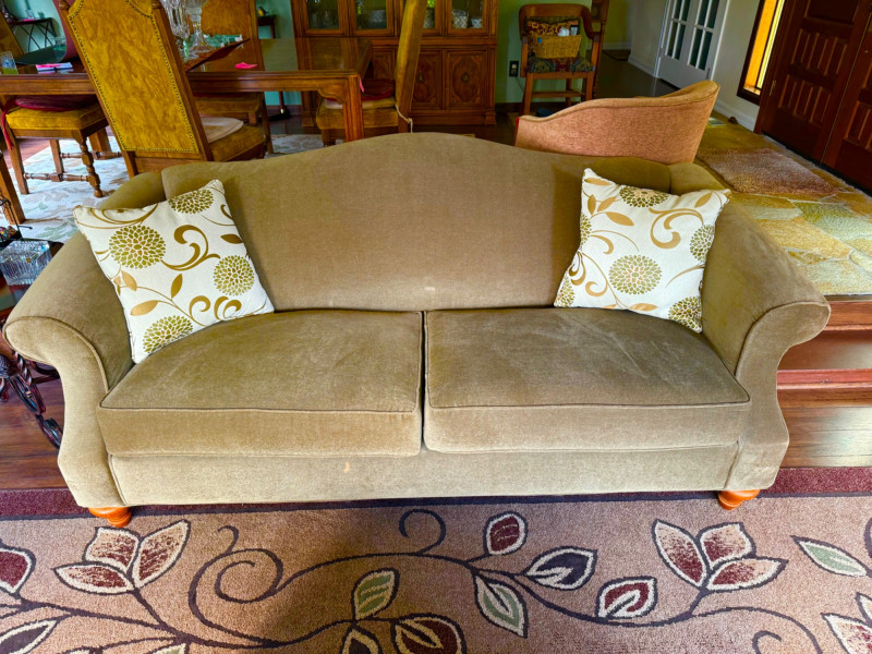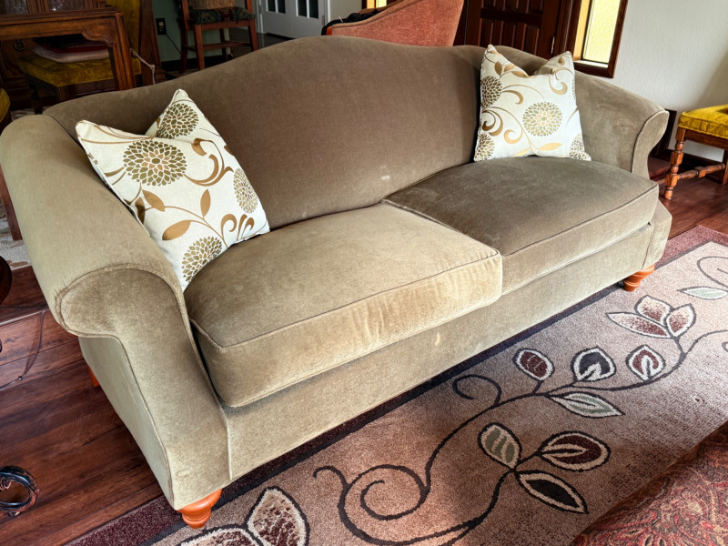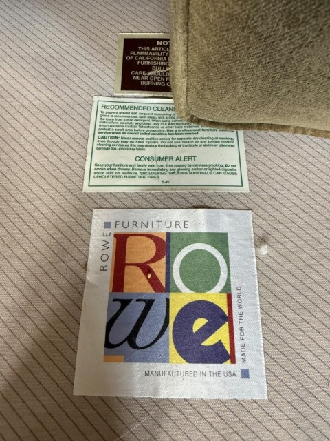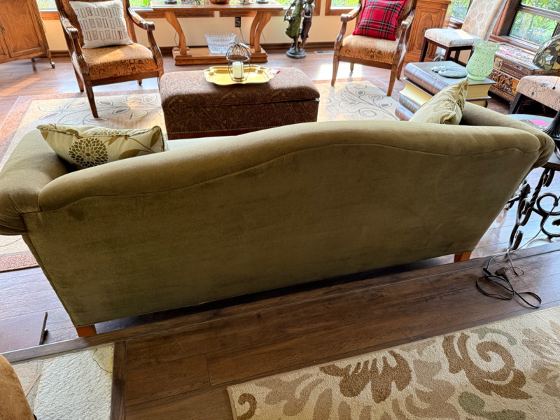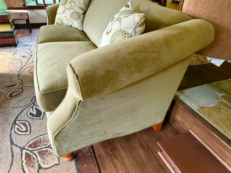 Rowe Furniture Sage Green Upholstered Sofa with Pillows Introduce refined lines and soft texture into your interior with this sage green statement piece from Rowe Furniture. Upholstered in a gentle sage green fabric, the sofa features a gracefully arched backrest and rolled arms, complemented by two loose seat cushions for relaxed comfort. Turned wooden feet in a light finish provide a classic foundation. Includes two coordinating accent pillows with a floral and vine motif in gold and green tones—adding a decorative touch that echoes the sofa’s elegant silhouette. Arched backrest and rolled arms for a graceful silhouette Two loose seat cushions for comfort and easy maintenance Turned wooden legs in a light finish Two matching throw pillows with botanical embroidery Made in the USA by Rowe Furniture This is a large and moderately heavy item. Please bring assistance.Features: