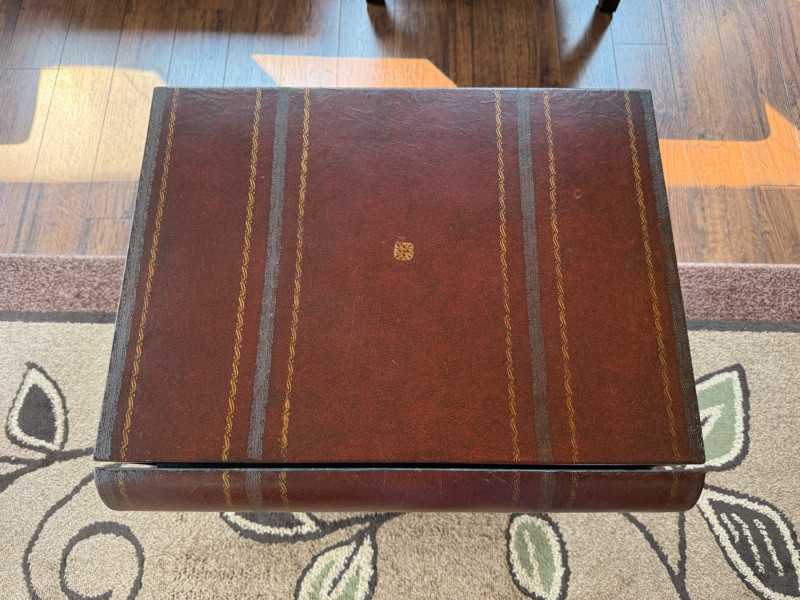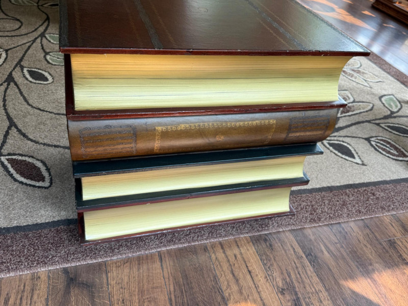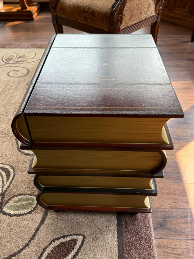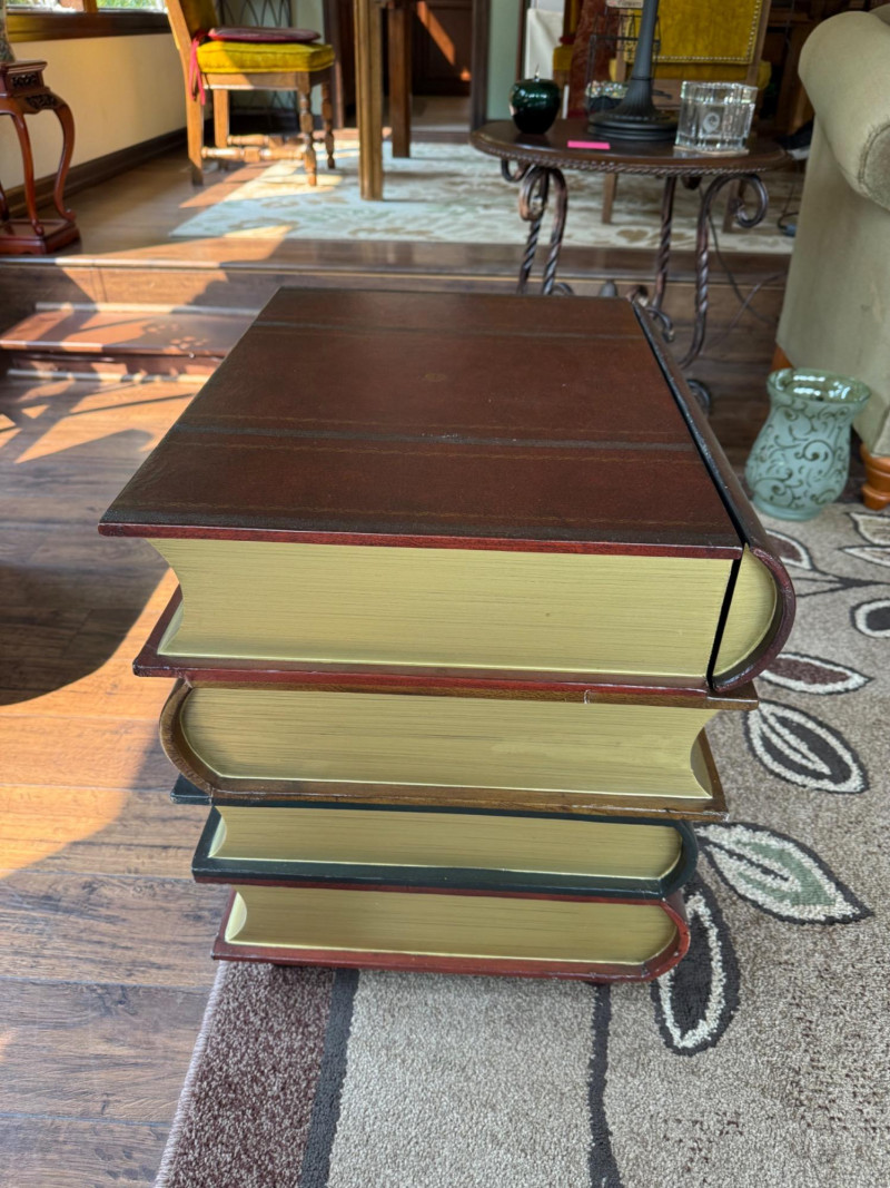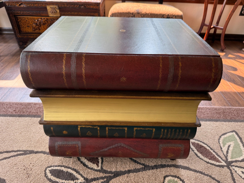 A whimsical and functional accent table crafted to resemble a stack of four oversized antique-style books. Each faux volume features sculpted spines with gilt-style embellishments, painted page edges in metallic gold tones, and realistic detailing that evokes classic leather-bound tomes. The flat top surface offers practical use as an end table or side table, while the trompe-l'œil construction adds sculptural charm. Ideal for libraries, reading nooks, or eclectic interiors, this piece blends decorative storytelling with utility. A conversation starter for bibliophiles and vintage enthusiasts alike. Material: Composite wood with painted and molded finishes Design: Faux stacked books with gilt-style accents Function: End table / side table Style: Vintage-inspired, literary-themed