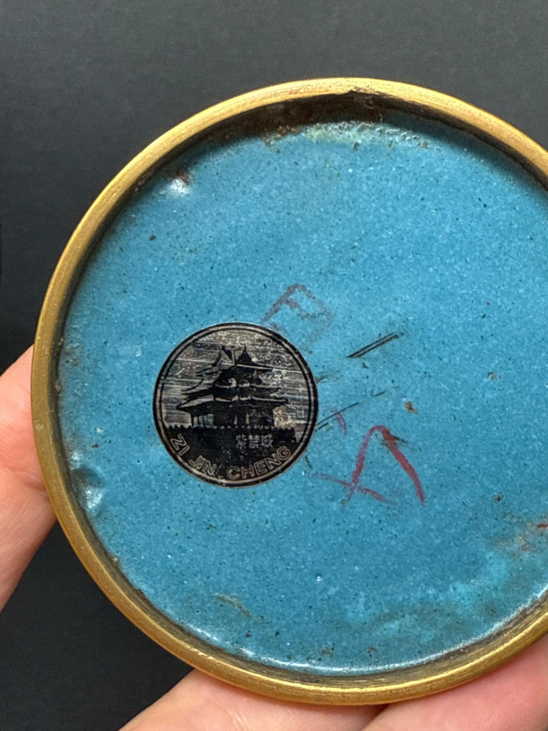 A pair of mid-20th century Chinese cloisonné enamel vases, each crafted in baluster form with flared necks, gilt rims, and bases. The bodies are adorned with intricate floral motifs rendered in rich tones of red, gold, green, and black, outlined in fine wirework and filled with enamel for a dense, textured finish. The undersides feature turquoise enamel; one vase bears a “ZI JIN CHENG” (Forbidden City) mark, affirming Chinese origin. These decorative vases exemplify traditional cloisonné craftsmanship and are ideal for display in a curated interior or collection of Asian decorative arts. Dimensions: 10.5 in. H x 5 in. W each “ZI JIN CHENG” Mark: This translates to “Forbidden City,” the imperial palace of China for nearly 500 years. Items bearing this mark often reference traditional craftsmanship associated with Beijing workshops, especially those producing decorative arts for export in the mid-20th century. Cloisonné Technique: Originating in the Yuan Dynasty and refined during the Ming and Qing periods, cloisonné involves applying enamel into wire cells (cloisons) on a metal body. The turquoise enamel base is a hallmark of traditional Chinese cloisonné, often referred to as “Ming Blue”Historical & Cultural Context
